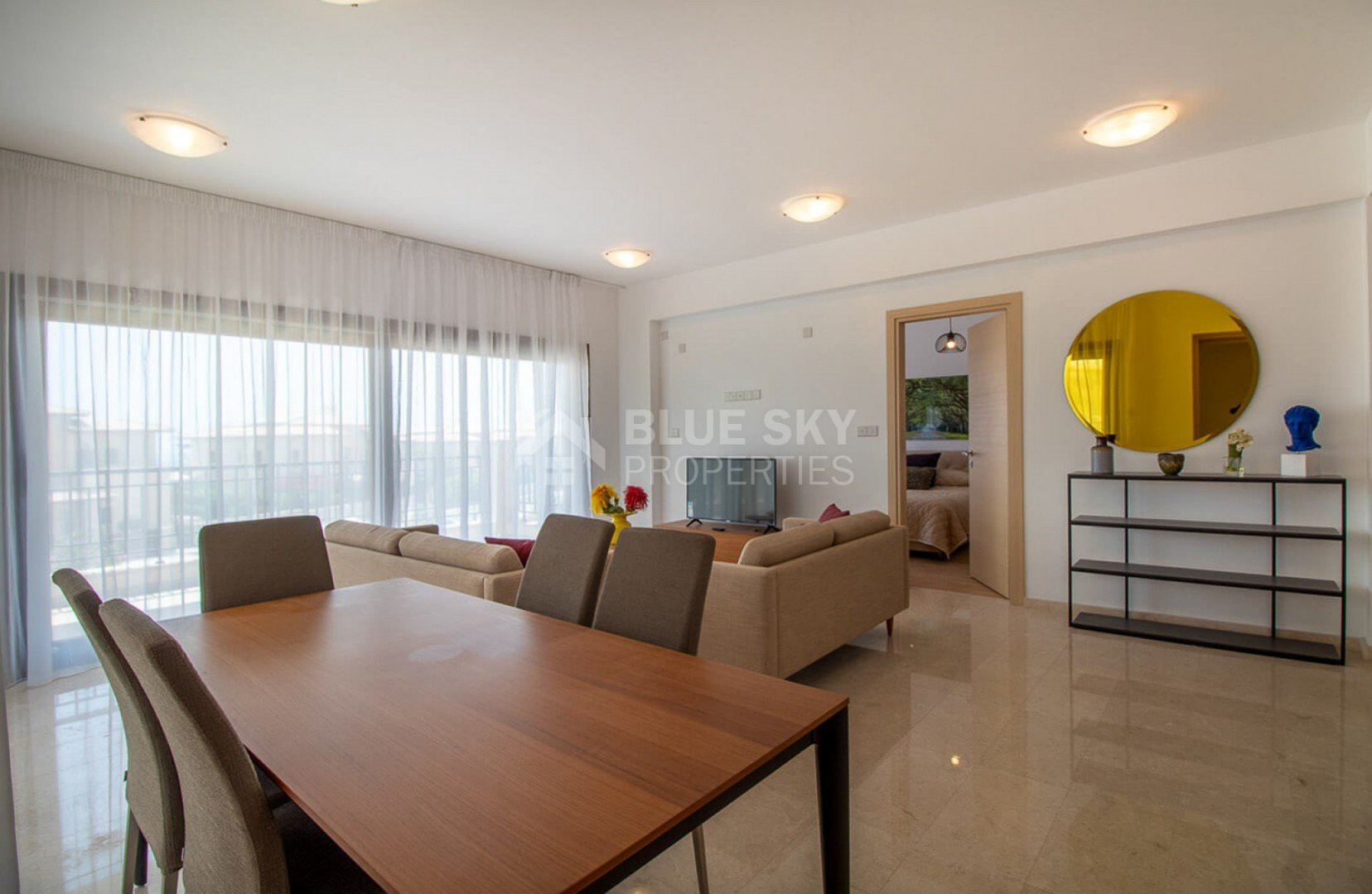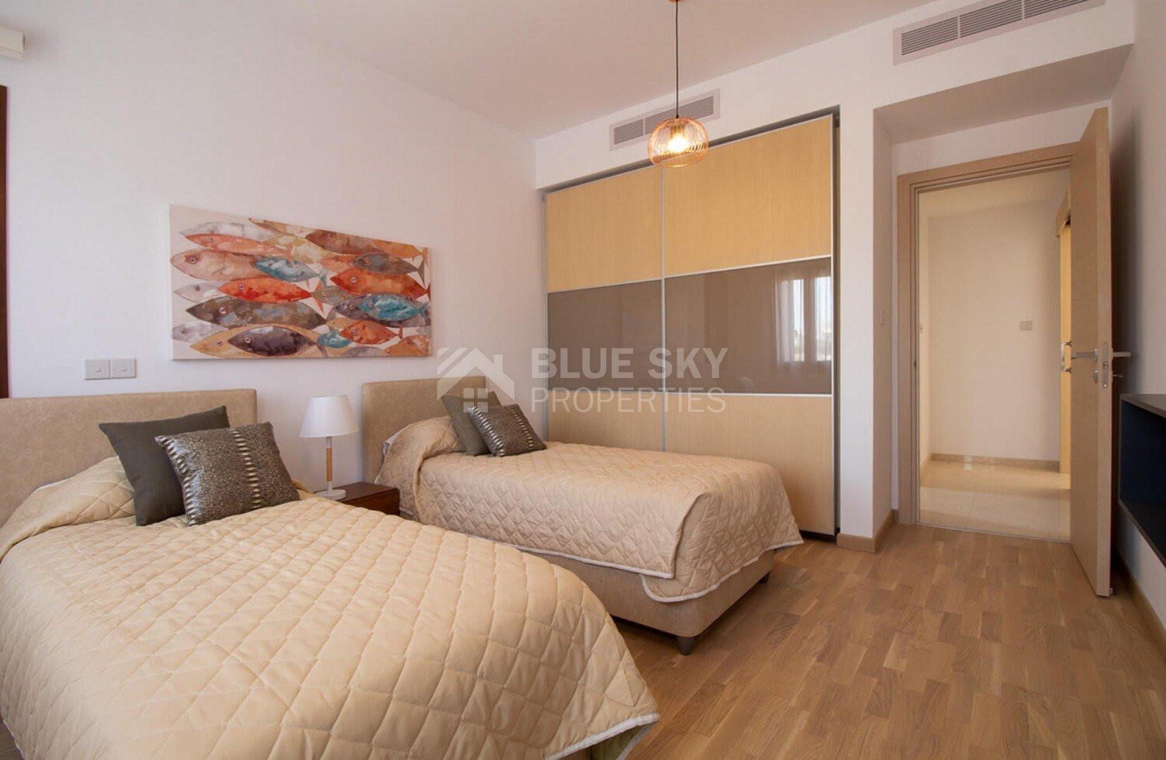 The apartment offers spacious living areas and comes fully equipped with contemporary amenities and brand-new fittings. Crema marble flooring enhances the living, dining, kitchen, and bathroom areas, while the bedrooms feature elegant parquet flooring. The layout includes one en-suite double bedroom and one twin bedroom with an additional bathroom. The property also enjoys lovely views overlooking the communal swimming pool.