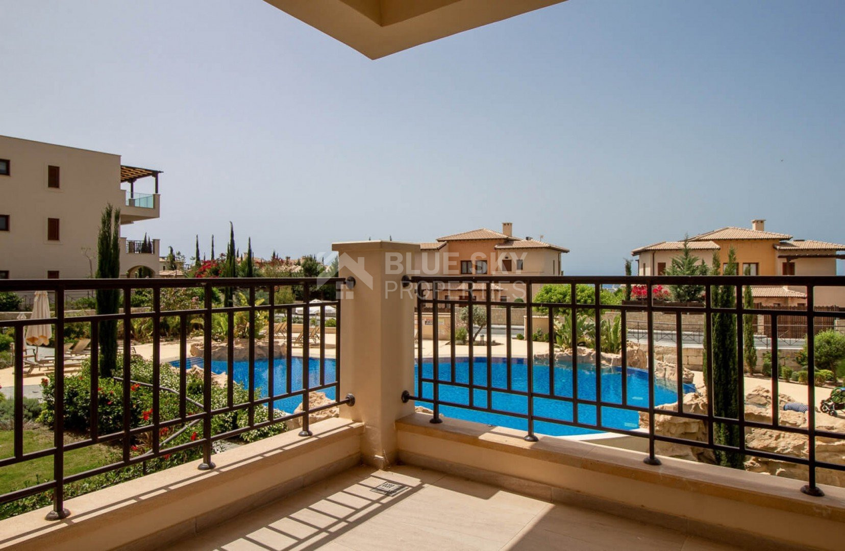 A private balcony overlooking the communal pool
