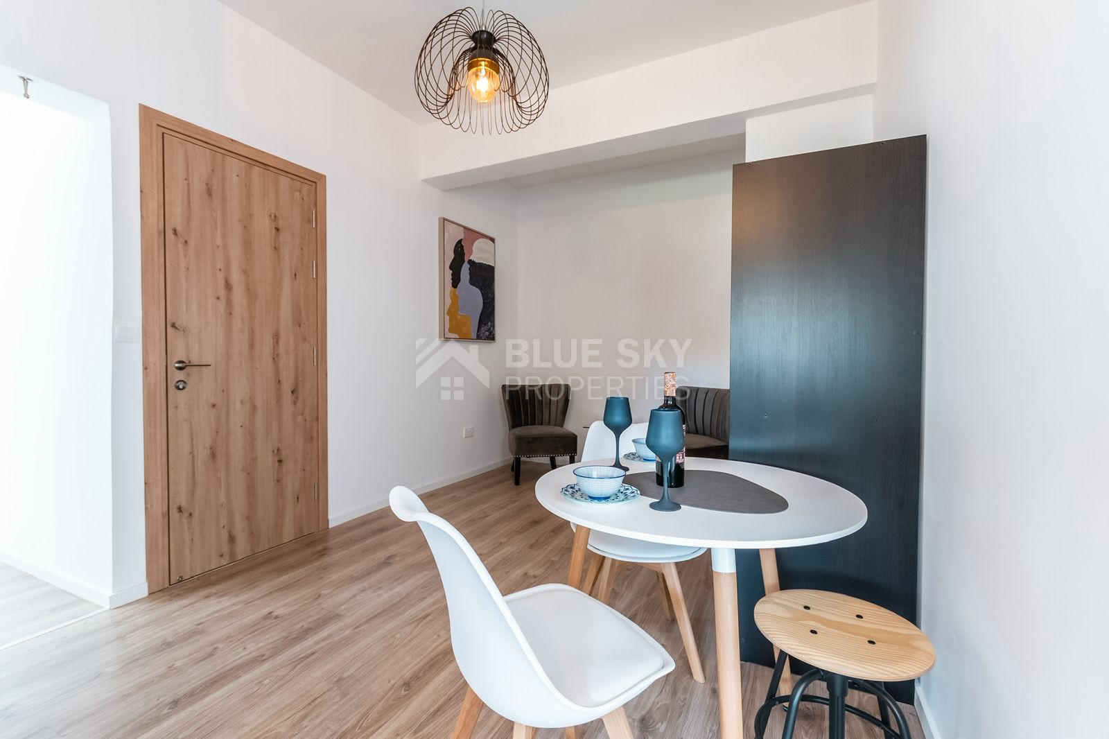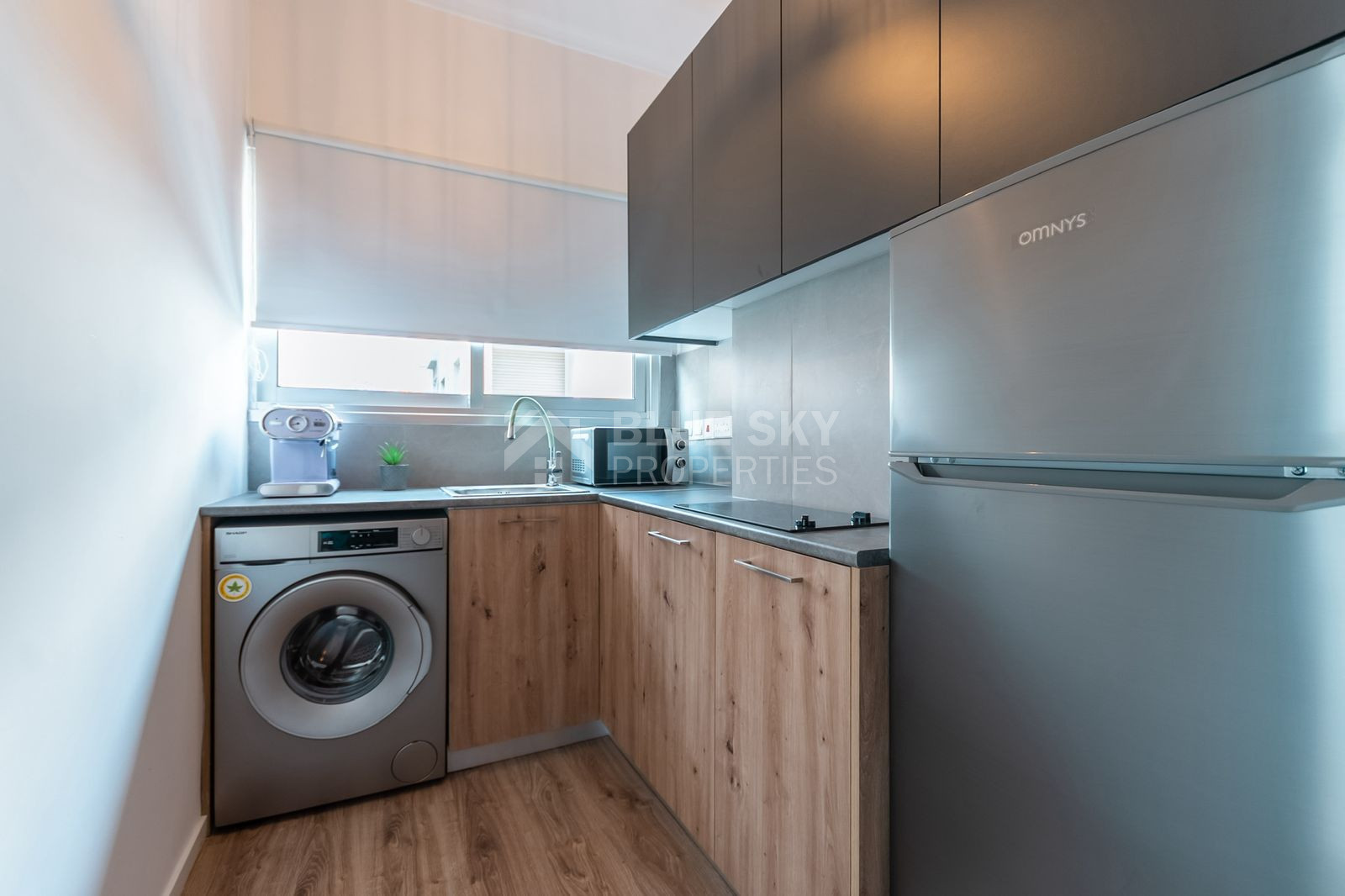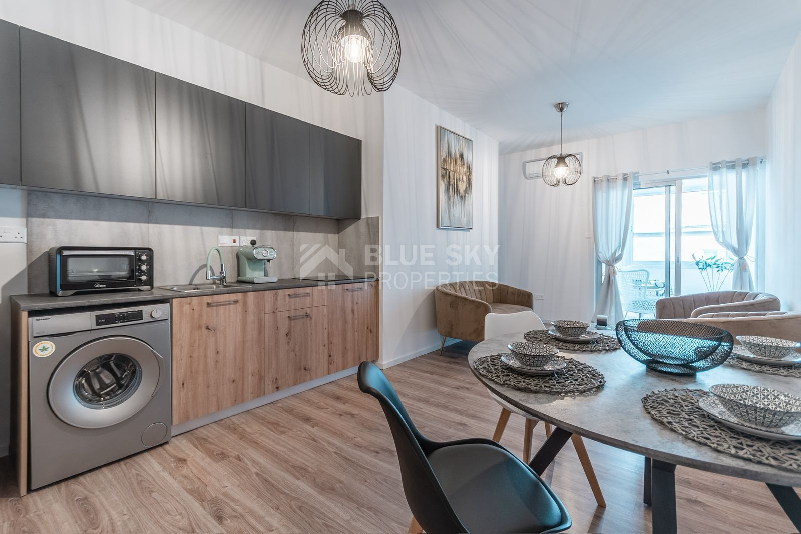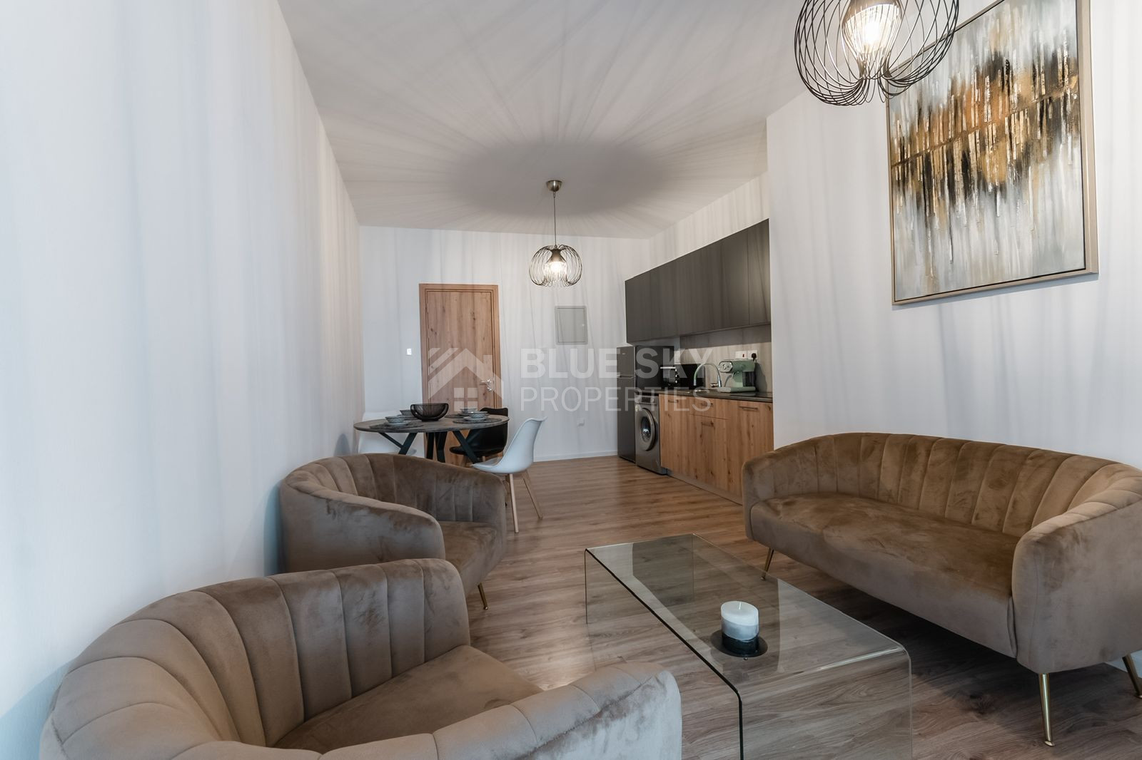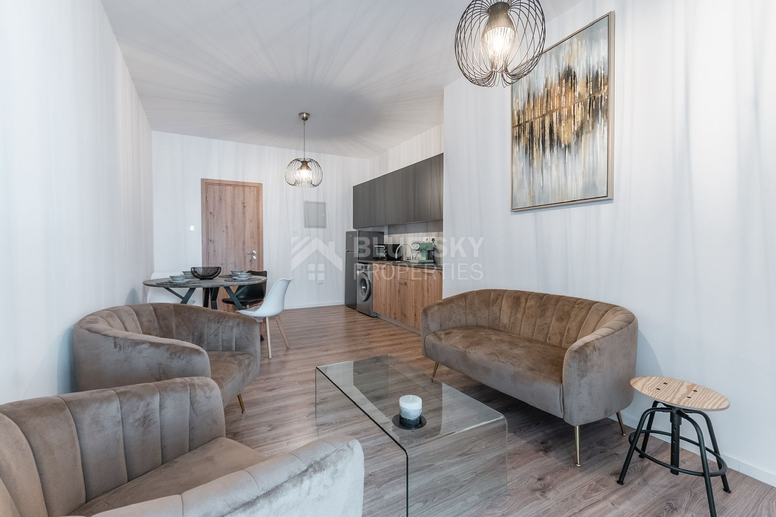 The living area is bright and airy, designed for both relaxation and entertaining. Quality furniture and tasteful décor create a welcoming environment, while large windows allow natural light to fill the rooms. The kitchen is fully equipped, making meal preparation both easy and enjoyable.