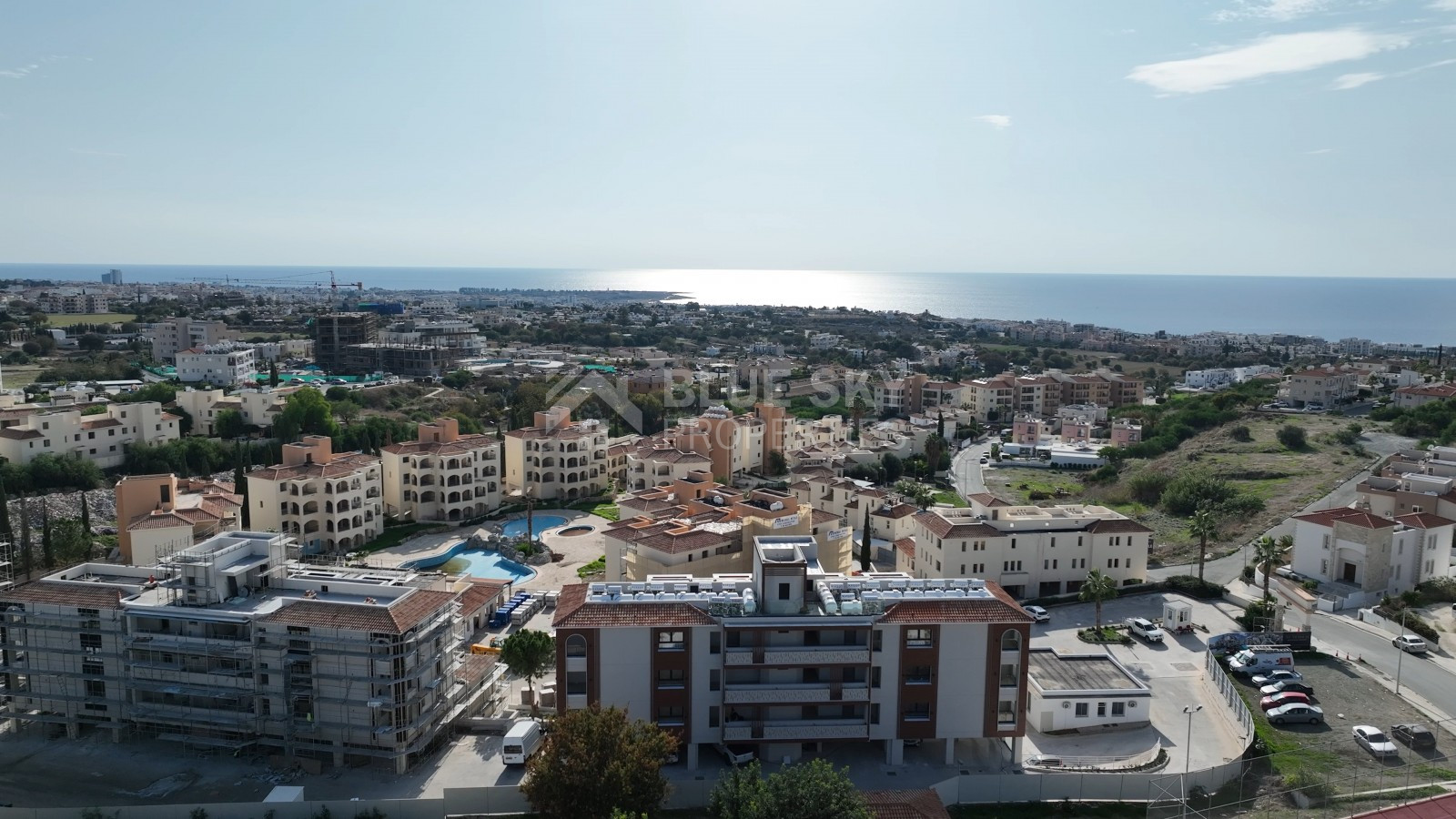 A: The apartment is in a modern gated residential development in Chloraka, just 5 minutes from Paphos town and a short drive to the beach. The Paphos International Airport is approximately 15–20 minutes away.