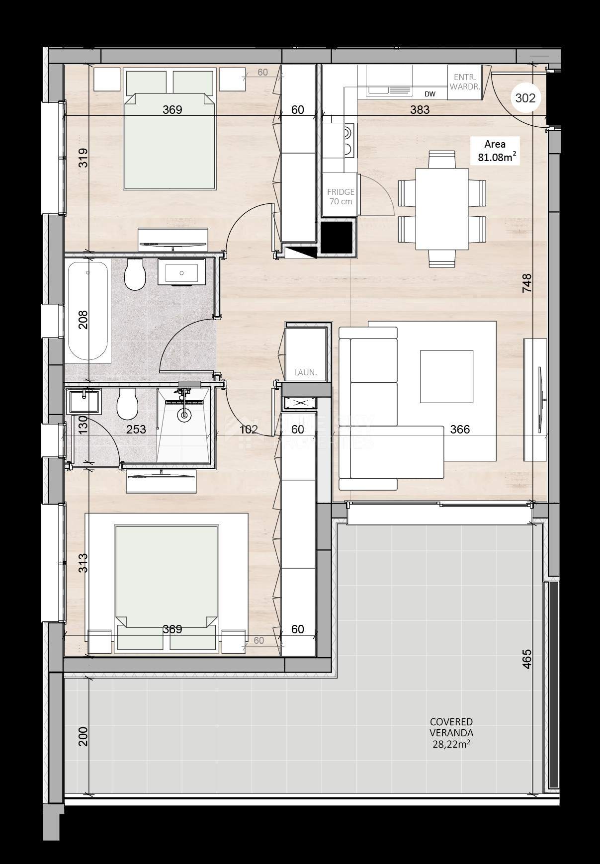 This thoughtfully designed 2-bedroom apartment boasts a total covered area of 109.30 sqm, with 81.08 sqm of internal living space and a generous 28.22 sqm covered veranda that is perfect for outdoor relaxation and entertaining. The apartment is bright and spacious, thanks to its open-plan living and dining area, which enhances the flow of space and light. The kitchen is designed with functionality in mind, making it easy to prepare meals while enjoying the open-concept layout.
