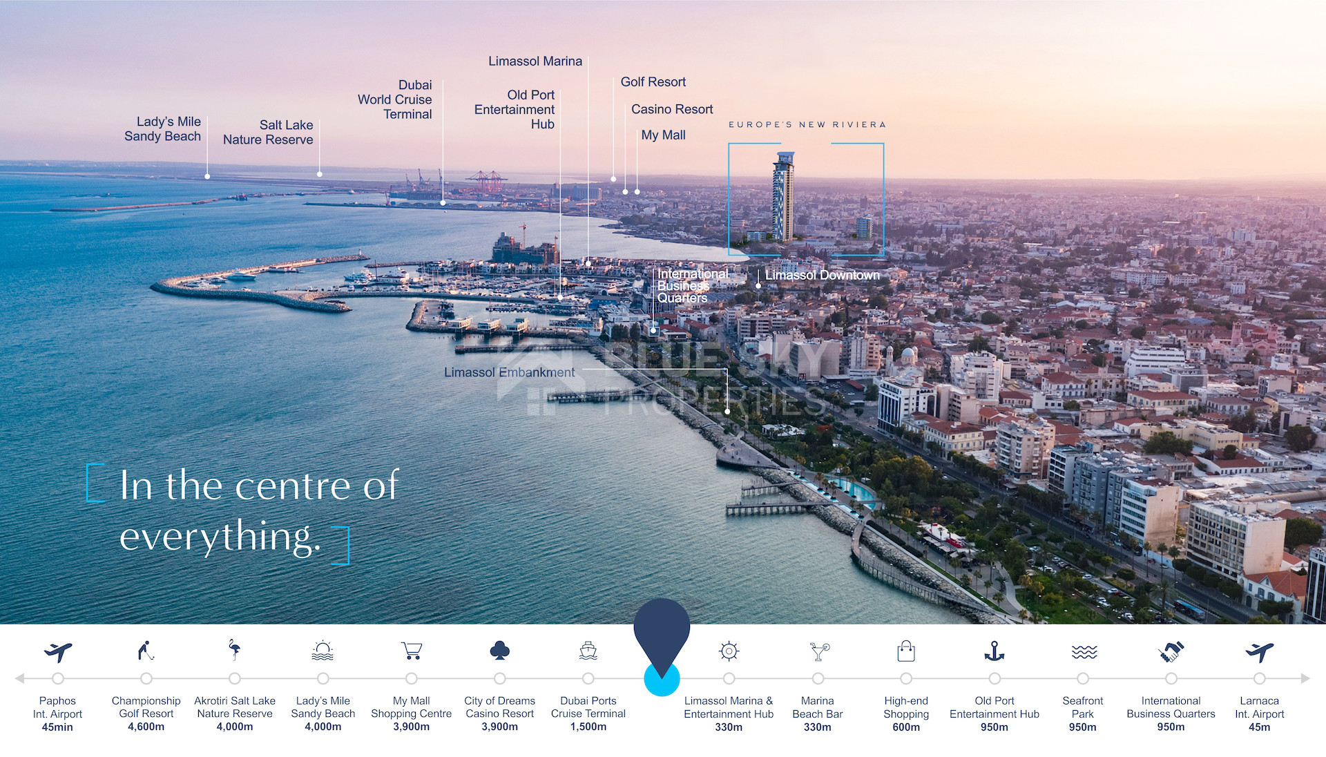 It is positioned within a landmark seafront tower near Limassol Marina, with panoramic Mediterranean views from the 15th floor.