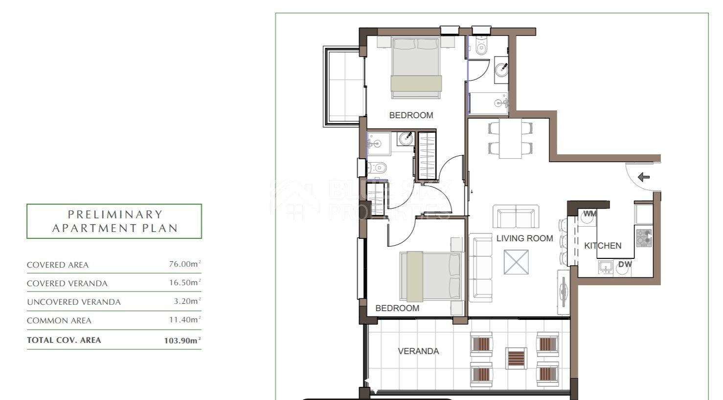 This spacious apartment offers a thoughtfully designed layout, providing ample space for comfortable living. The open-plan living and dining areas are perfect for entertaining, while the large verandas offer stunning views of the surrounding green fields.