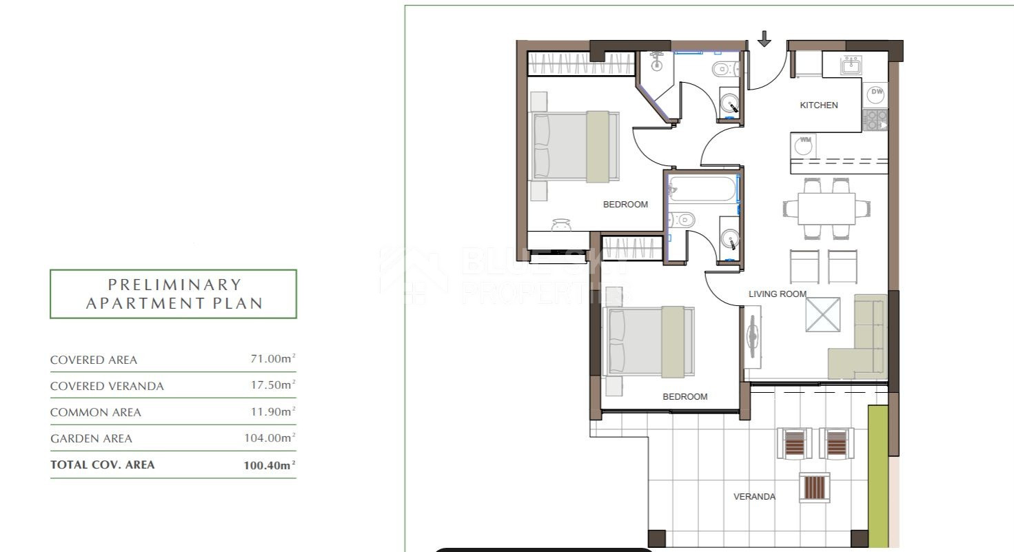 This spacious apartment offers a thoughtfully designed layout, providing ample space for comfortable living. The open-plan living and dining areas are perfect for entertaining, while the large verandas offer stunning views of the surrounding green fields.