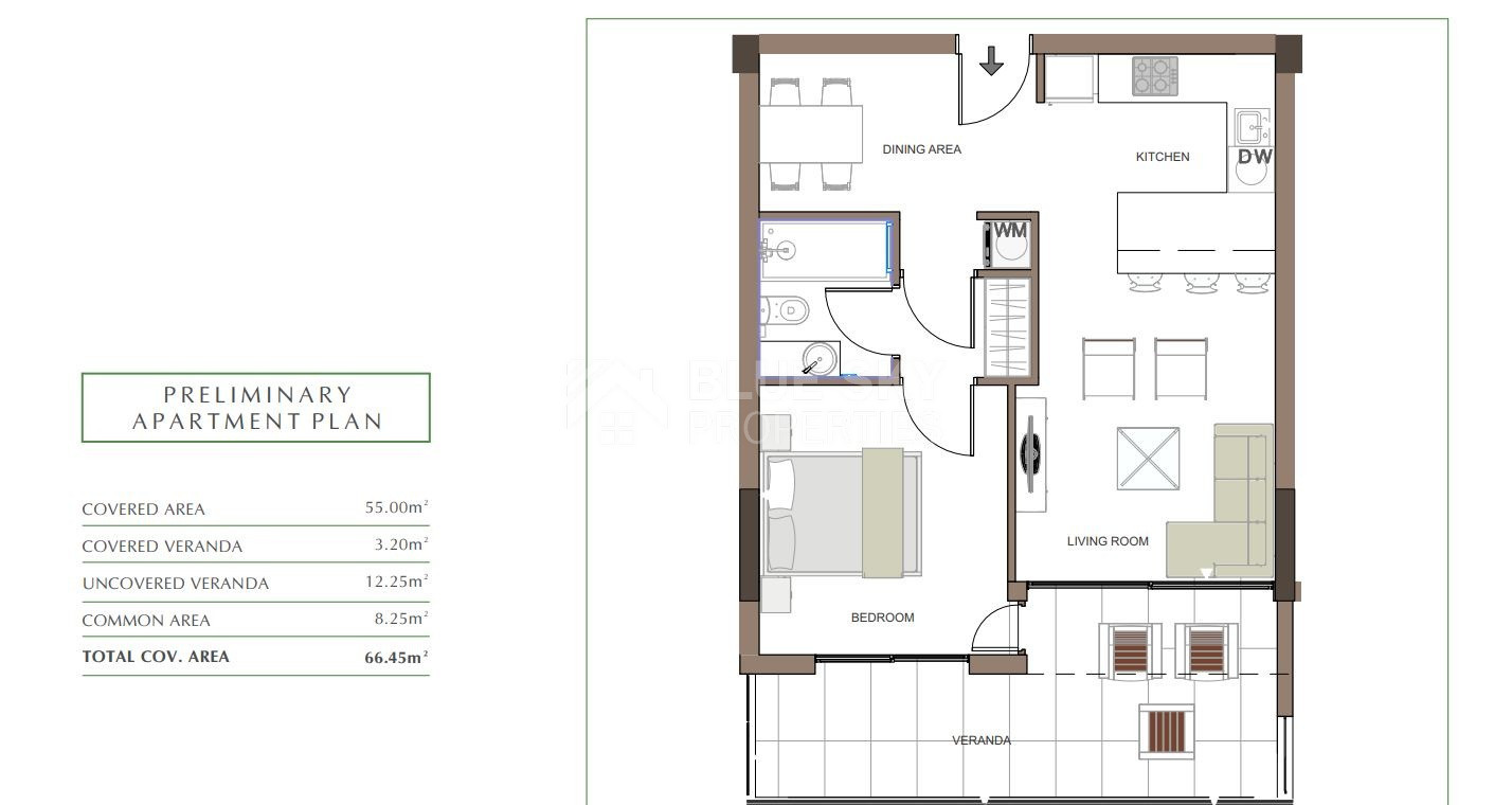 Discover the perfect blend of countryside tranquility and urban convenience with this exceptional 1-bedroom, 1-bathroom apartment in the serene village of Trachoni, Limassol. Located just a short drive from the bustling city center and the beautiful Limassol coastline, this under-construction property is set to be completed in 21 months, July of 2027.