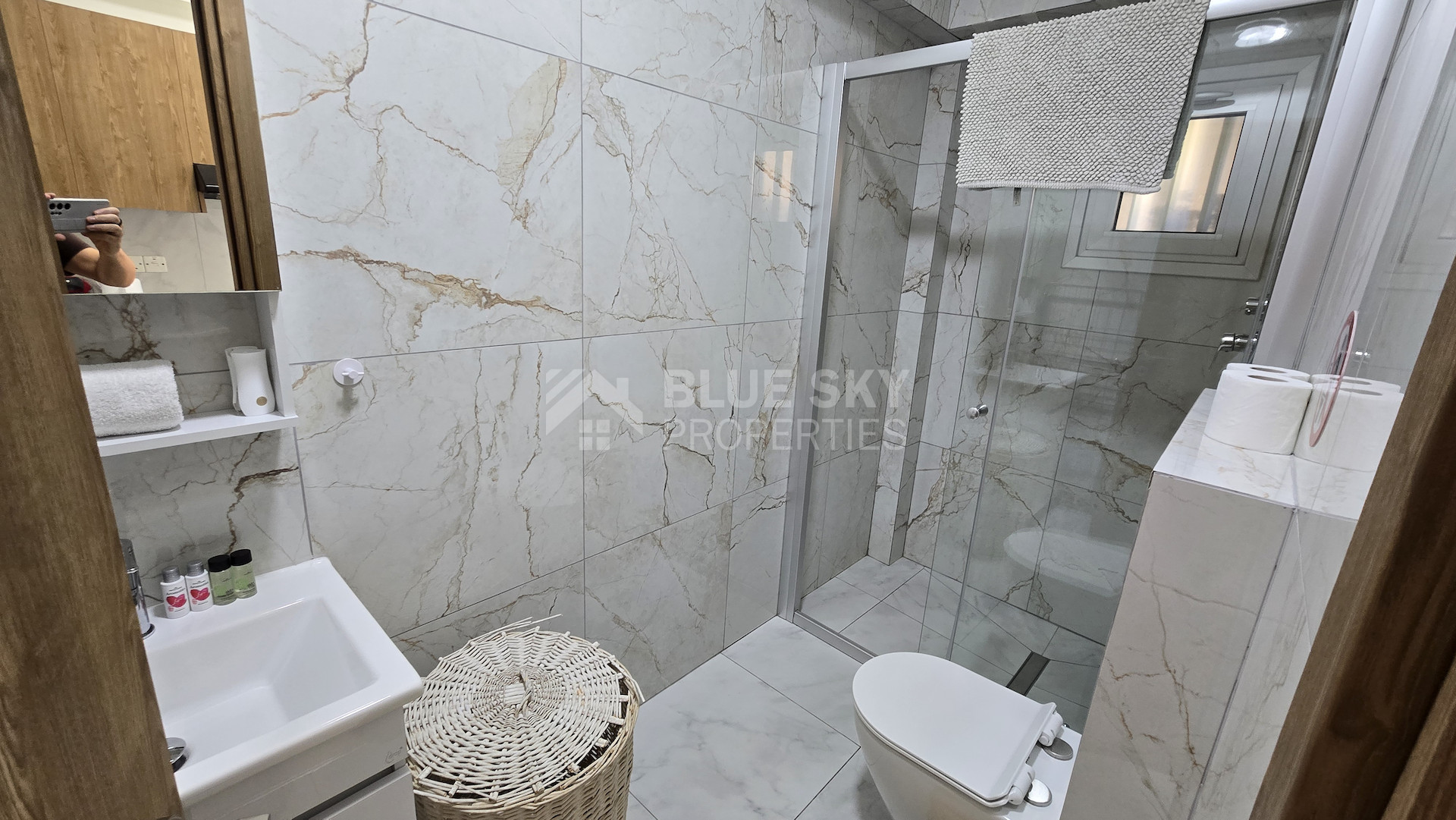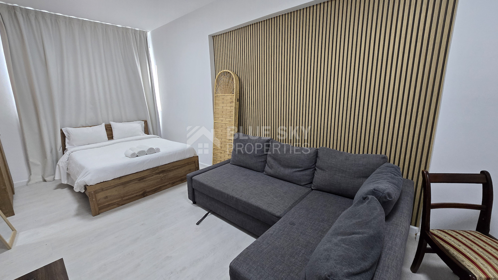 The apartment includes one stylish bathroom, designed with quality fixtures for your comfort. Enjoy year-round comfort with a central air conditioning system, ensuring the perfect indoor climate at all times. Large windows let in plenty of natural light, creating an inviting atmosphere.