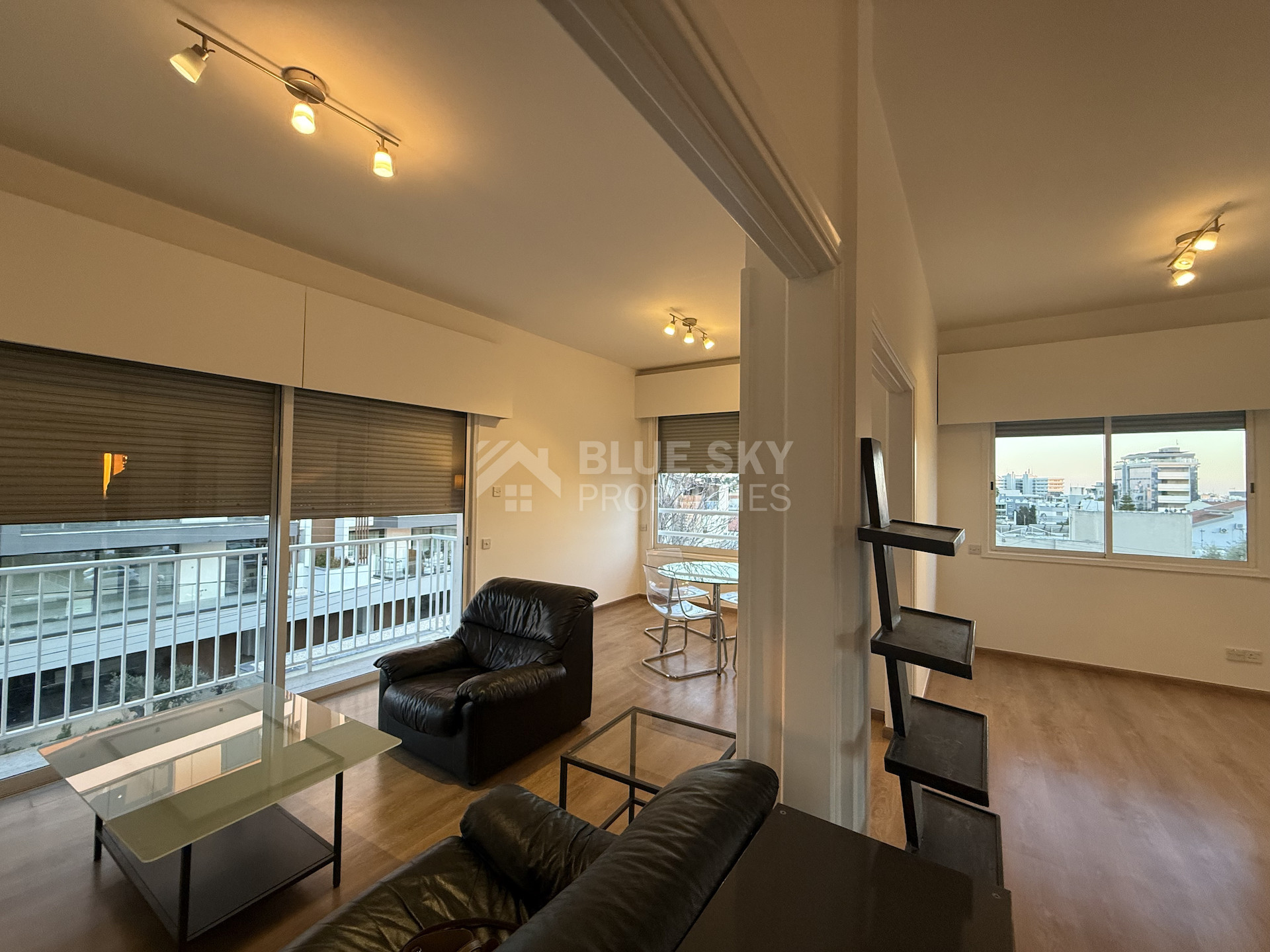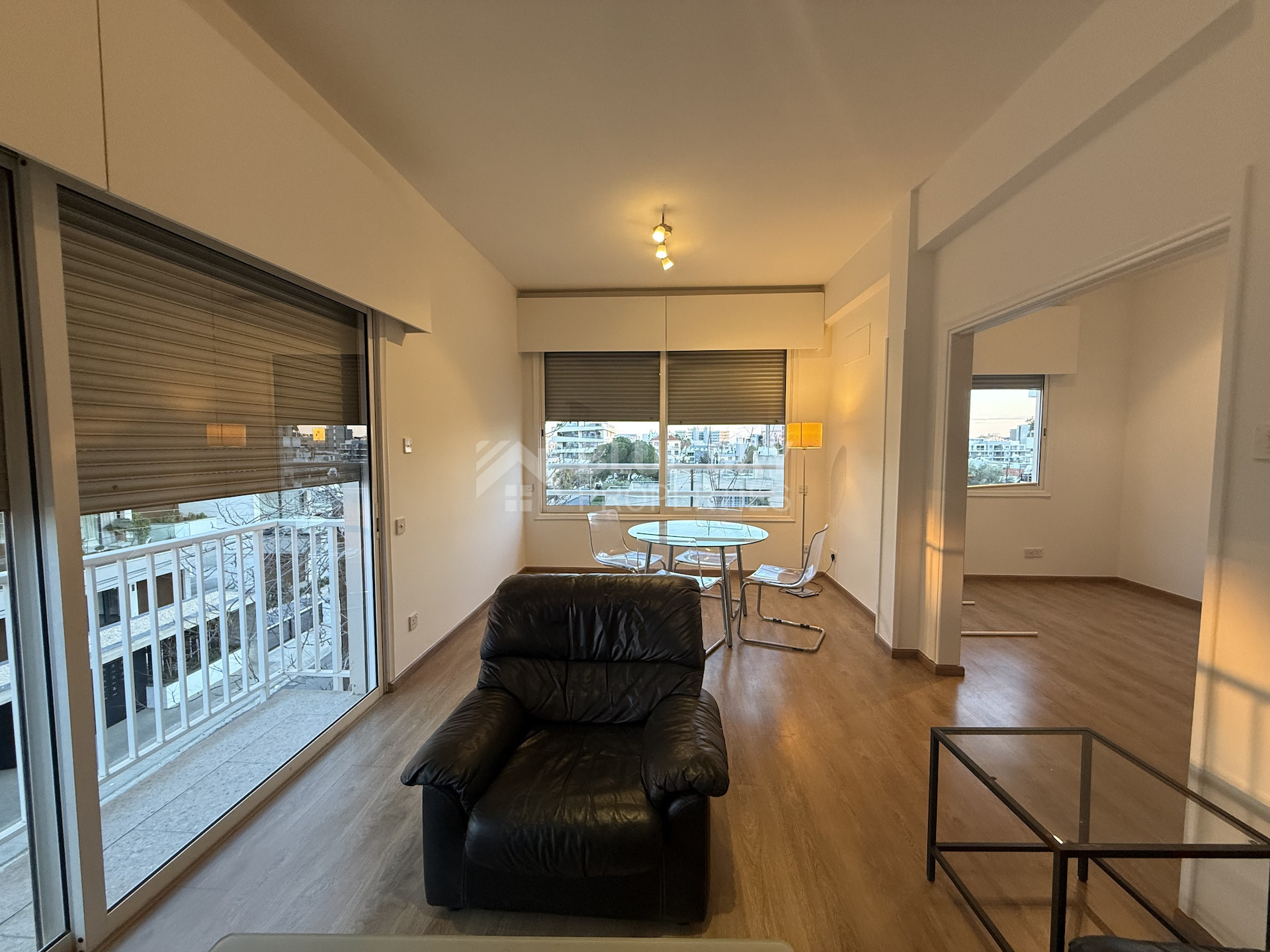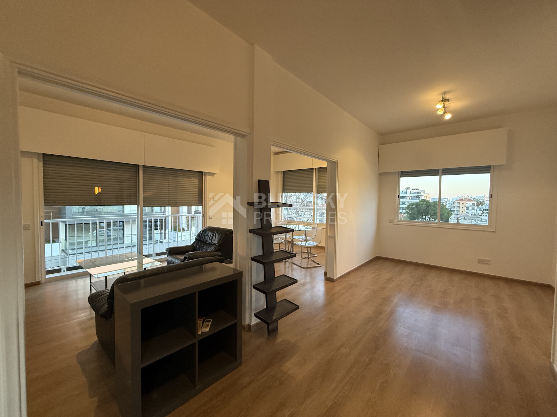 The apartment is in excellent condition, featuring laminate parquet flooring throughout and large windows that bathe the space in natural light, creating a bright and airy atmosphere. Electric shutters provide convenience and added security.
