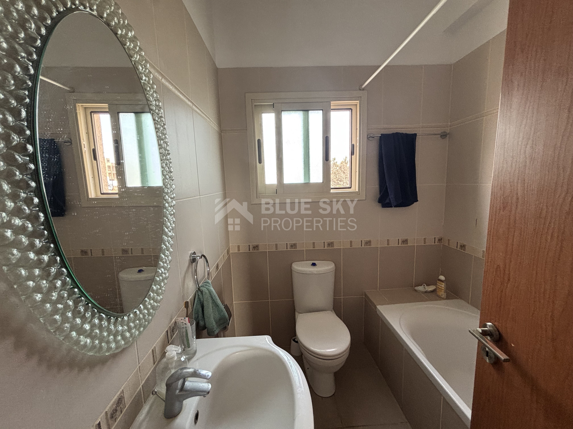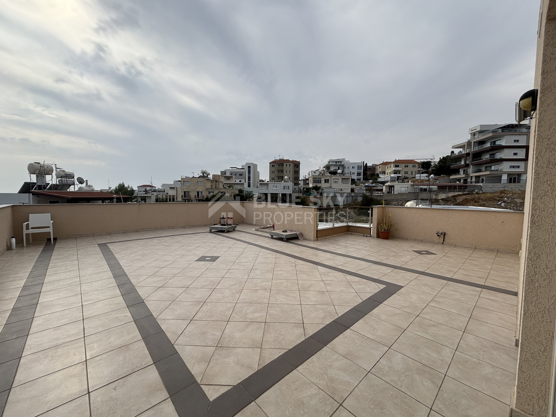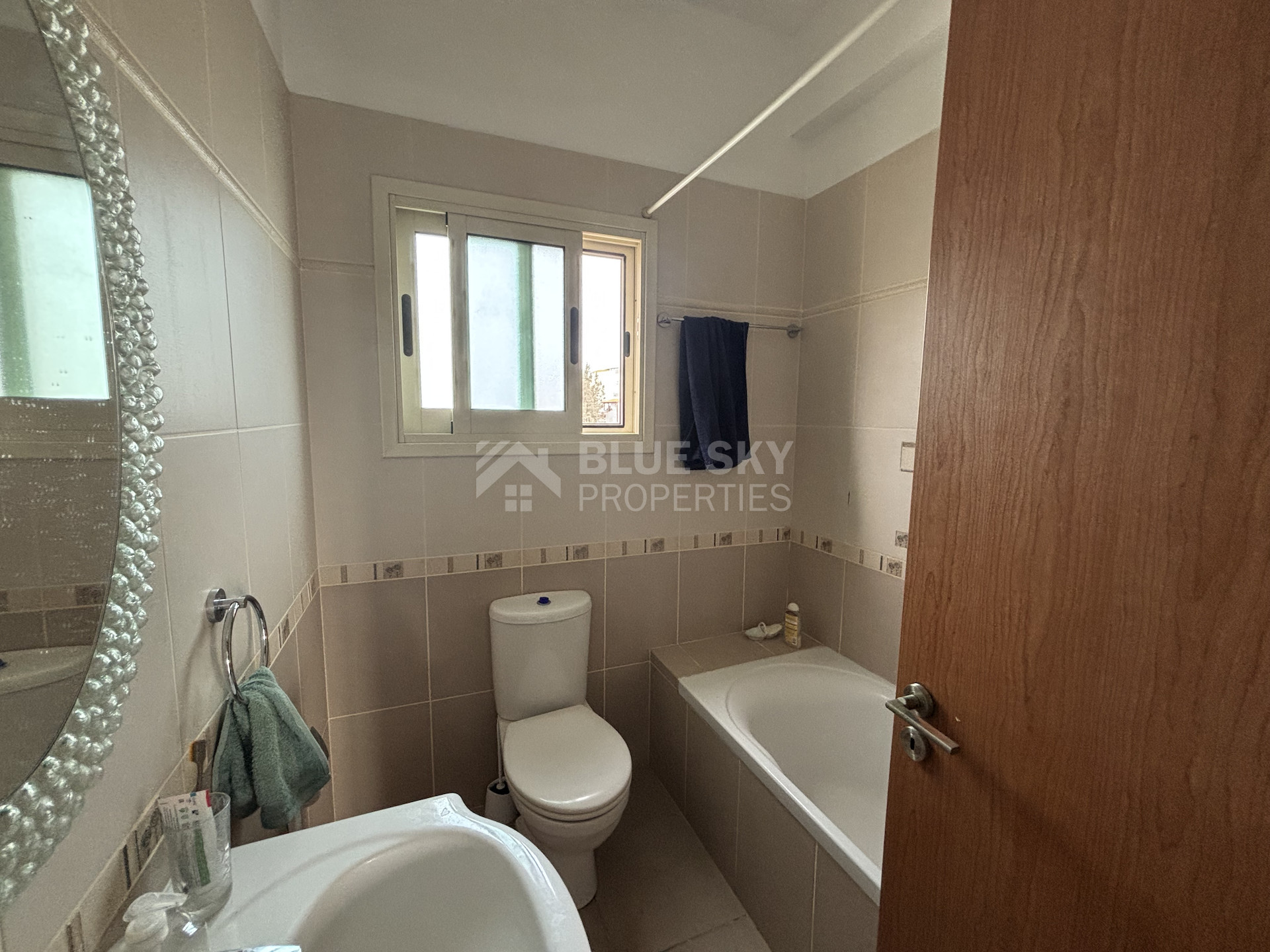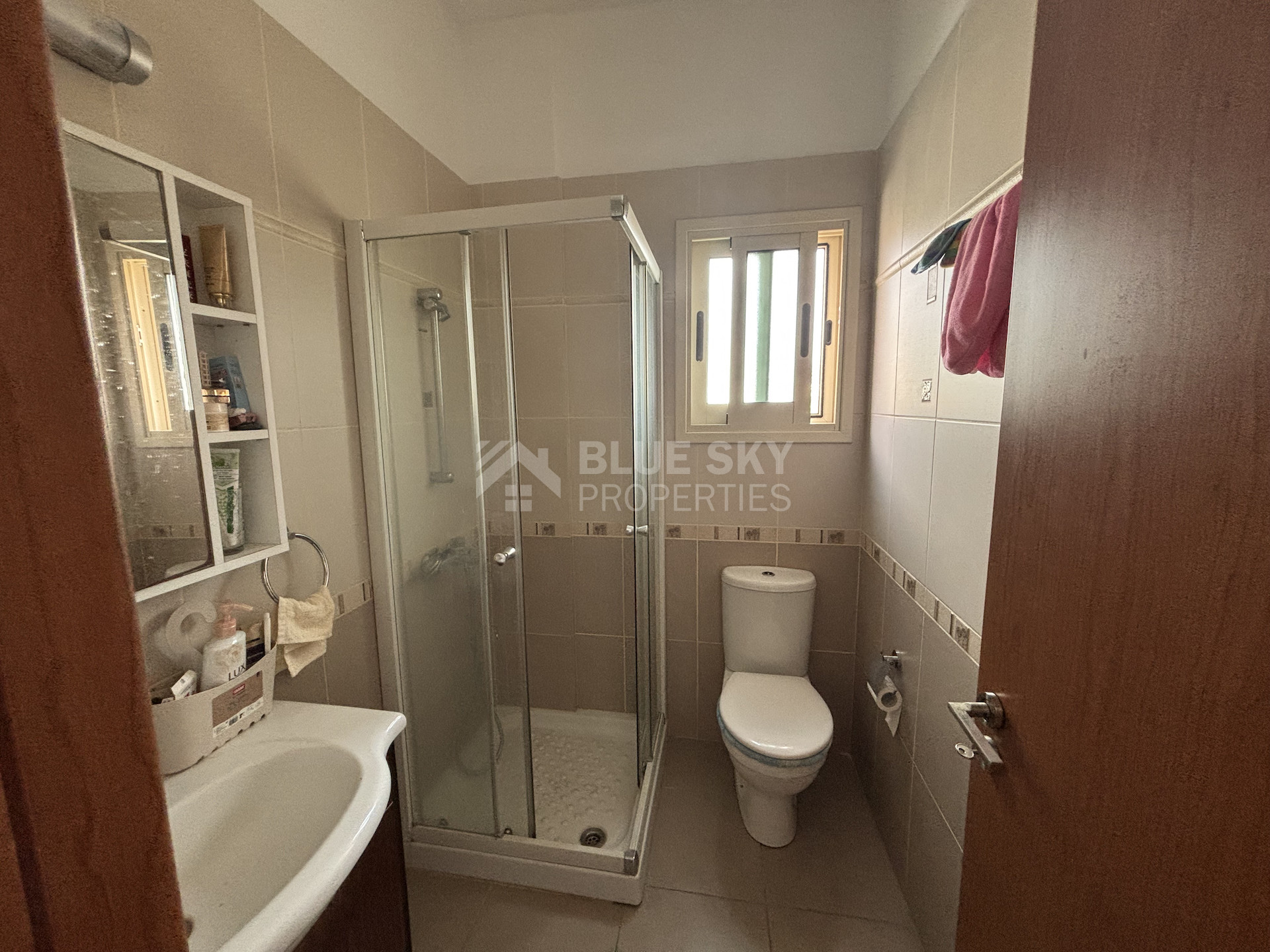 Available for rent, this spacious top-floor apartment offers comfort and style in the sought-after area of Agios Athanasios. With an internal space of 130 m2, it features three well-sized bedrooms and two modern bathrooms, making it ideal for families or professionals looking for extra room.