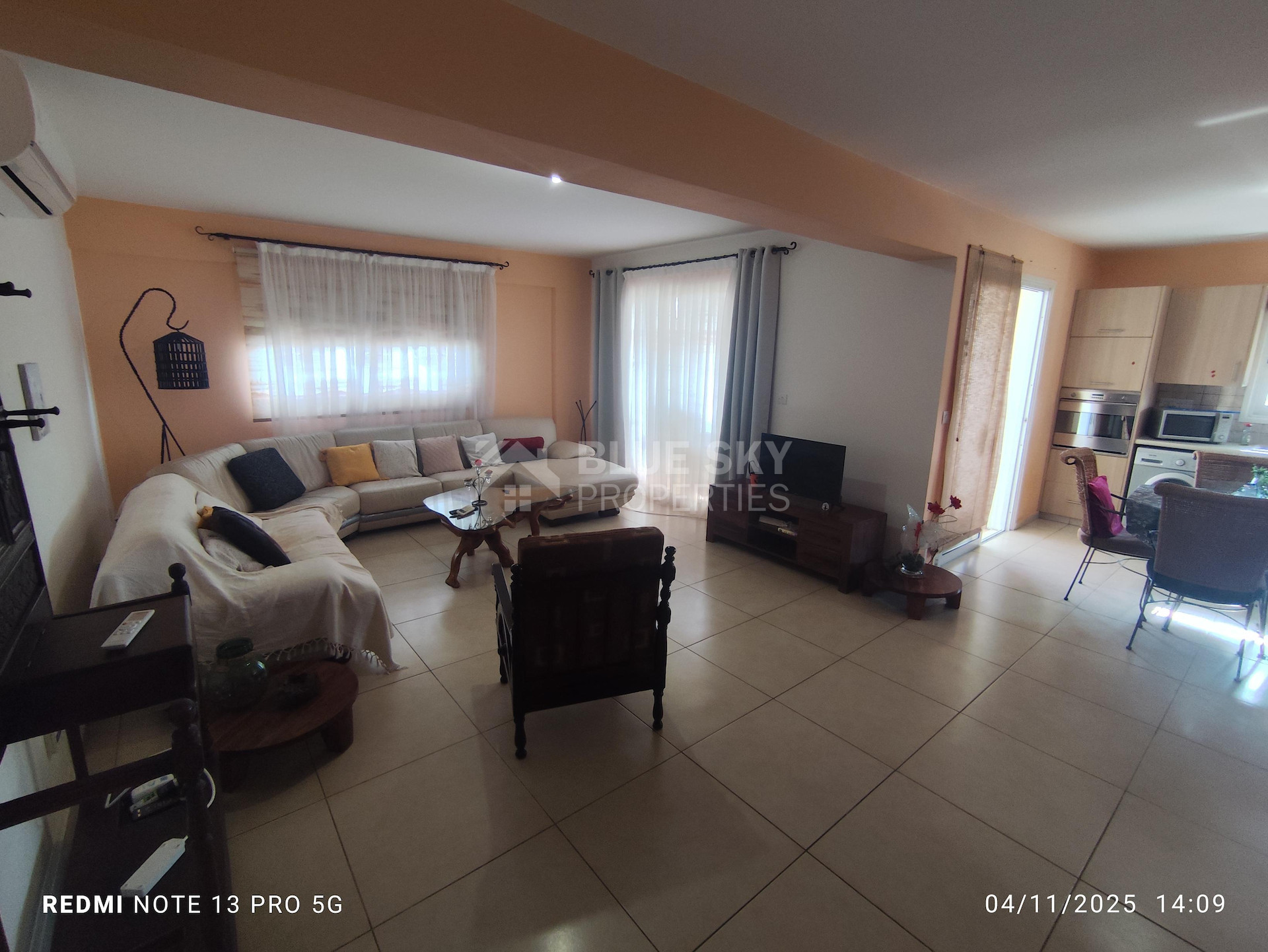 It has an open plan kitchen, with living/dining area , three good size bedrooms (one of them en-suite) , family bathroom , guest w.c., a/c in all areas and safety door as well. There is also nice veranda to enjoy your coffee and one covered parking space. It is fully furnished and has all the electrical appliances such as microwave etc..