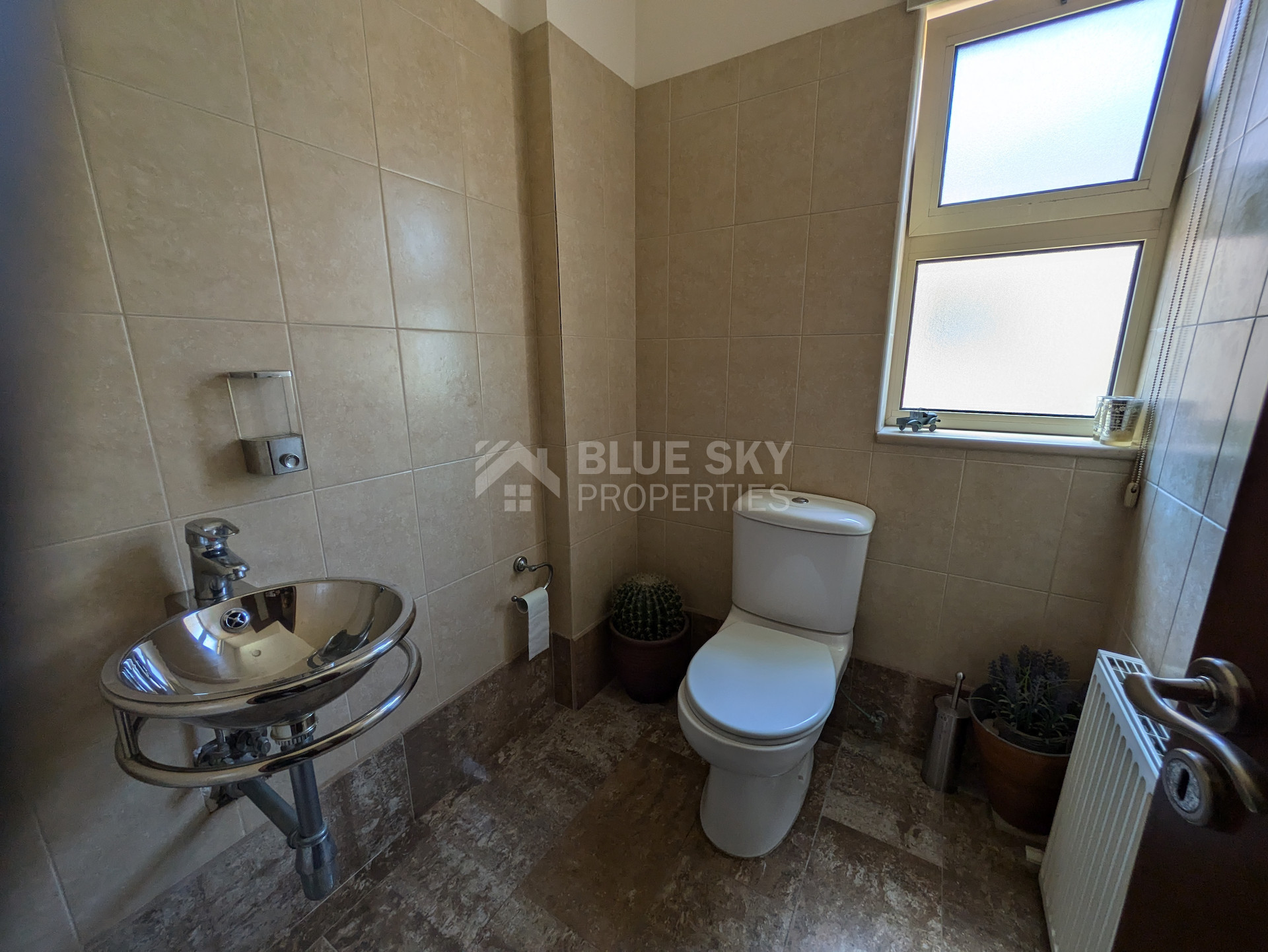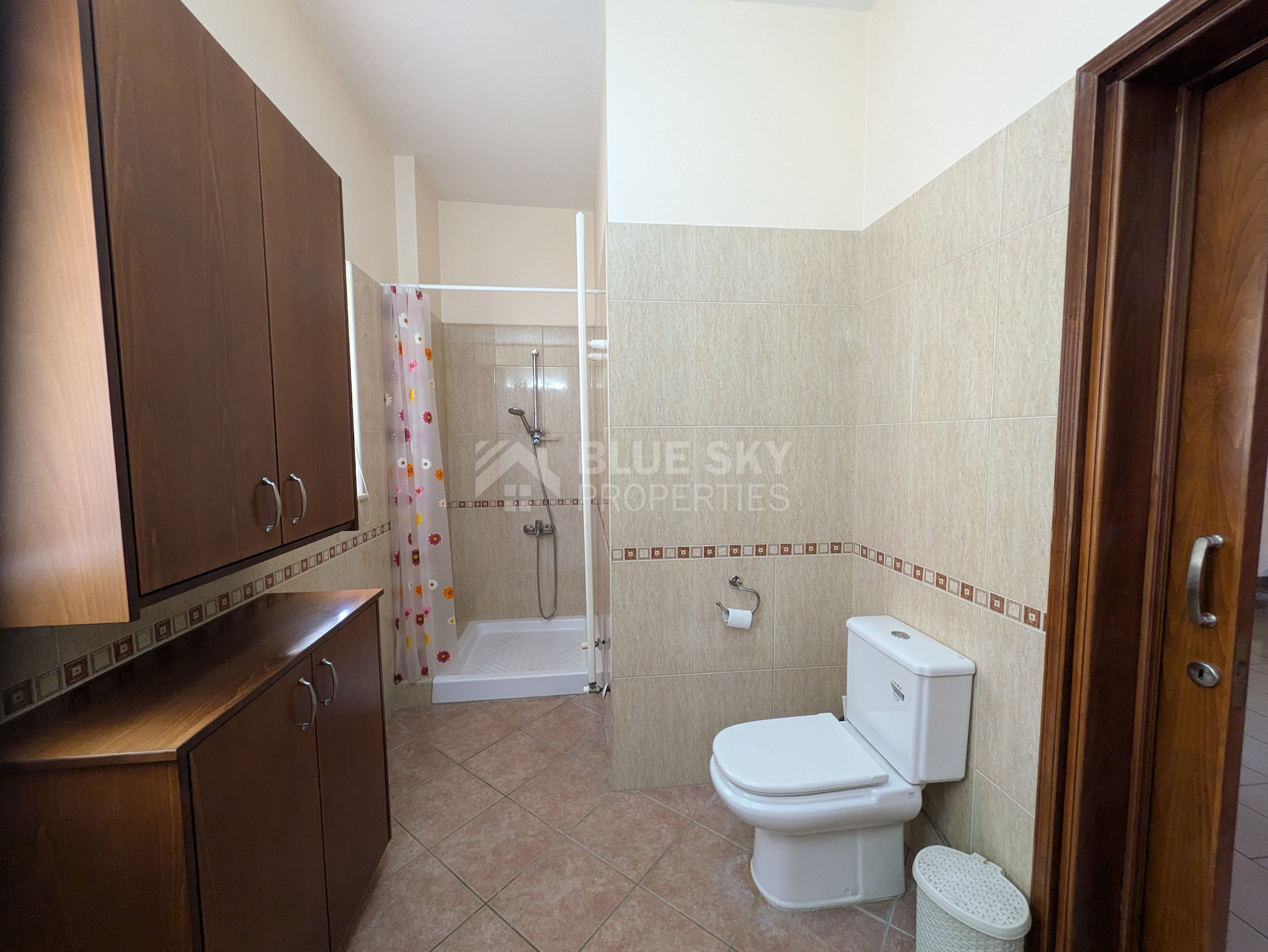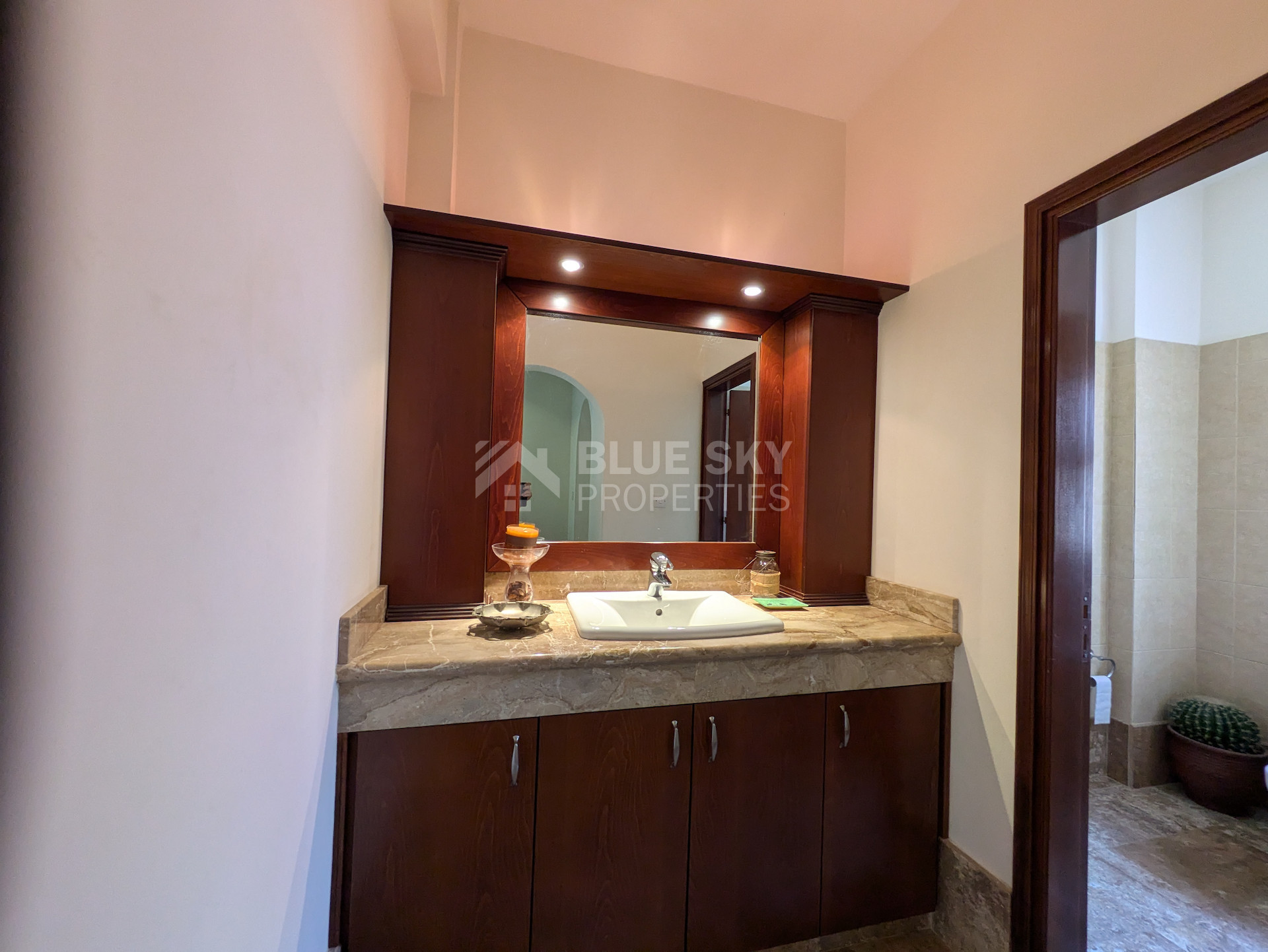 This spacious 4-bedroom, 4-bathroom Penthouse is now available for rent in Geroskipou. With an impressive internal area of 300 m2, this well-maintained, fully furnished residence is situated on the 1st floor of a two-story building. The property offers a comfortable and modern layout, with generous living areas, large bedrooms, and a fully equipped kitchen. Each bedroom has access to its own bathroom, providing privacy and convenience for all residents.