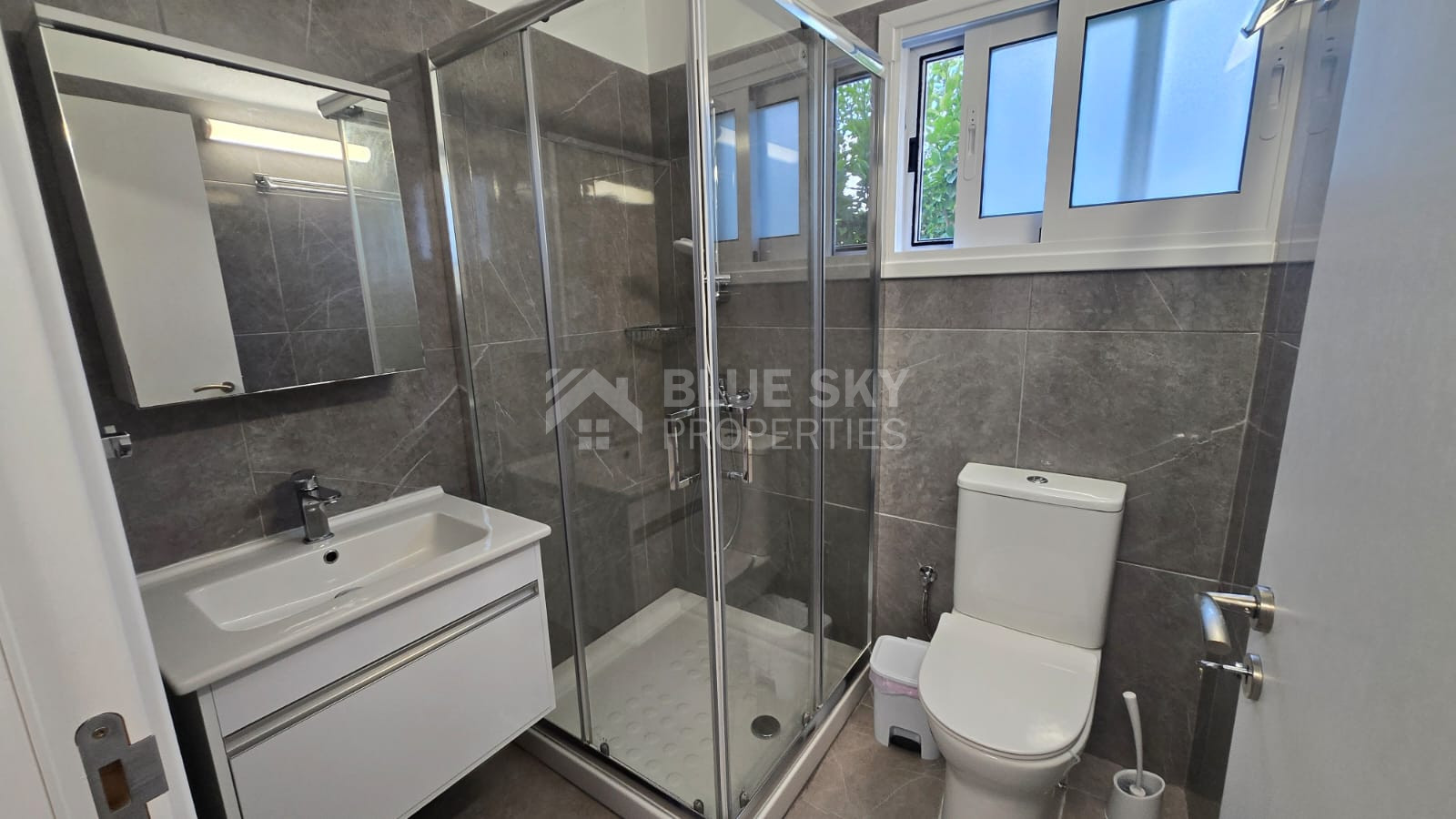 A fully renovated and modern 1-bedroom semi-basement apartment located in Mesa Geitonia, offering a cozy and stylish living space. The property features approximately 50sq.m. of covered areas and a spacious 25sq.m. private veranda at the back with pleasant green views.