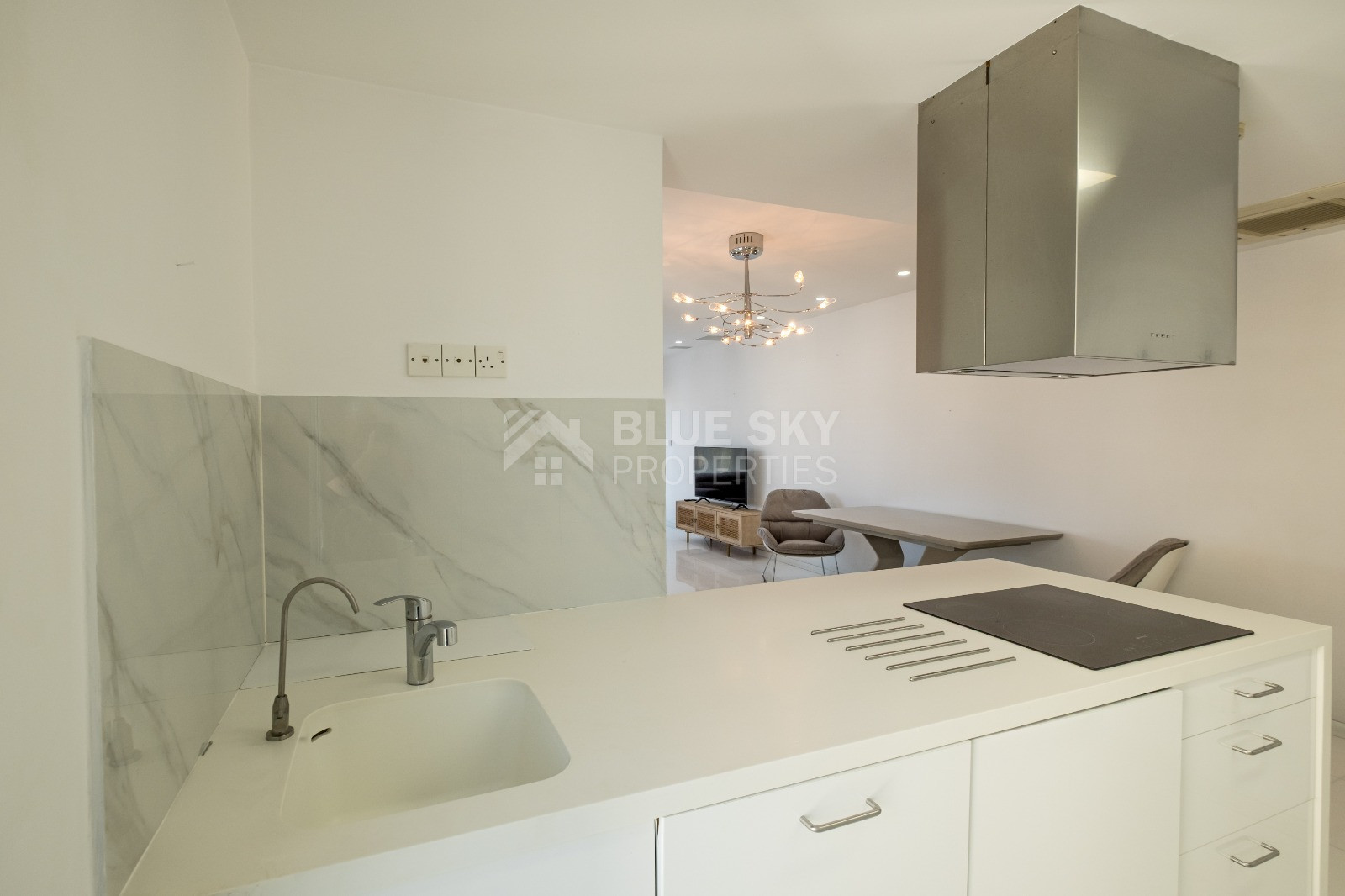 Located on the second floor of a gated building, the apartment features a well-designed interior with spacious living areas finished with Thasos marble flooring and laminated wooden floors in the bedrooms. The island kitchen is fully equipped with built-in appliances, while the apartment offers two bedrooms, including a master bedroom with en-suite, as well as a main bathroom with jacuzzi. A large covered veranda extends the living space outdoors, perfect for relaxing and enjoying the vibrant seafront atmosphere.