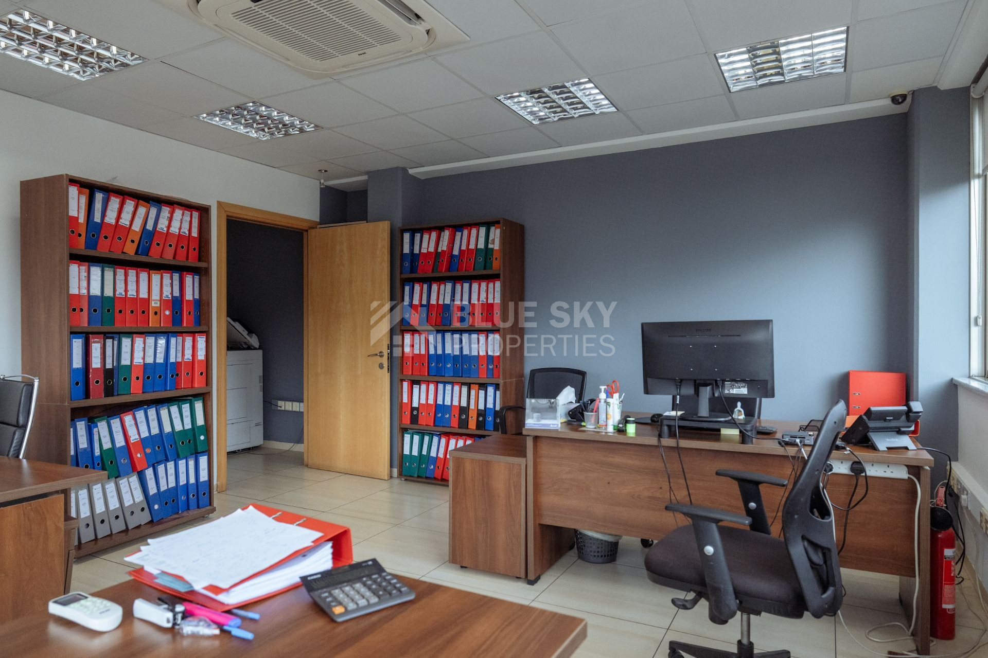 The layout includes five bathrooms, adding convenience for both staff and visitors. The property also features a basement, which can be utilized for storage or additional business operations. Positioned on a large plot, there's ample outdoor space for parking or future expansions.