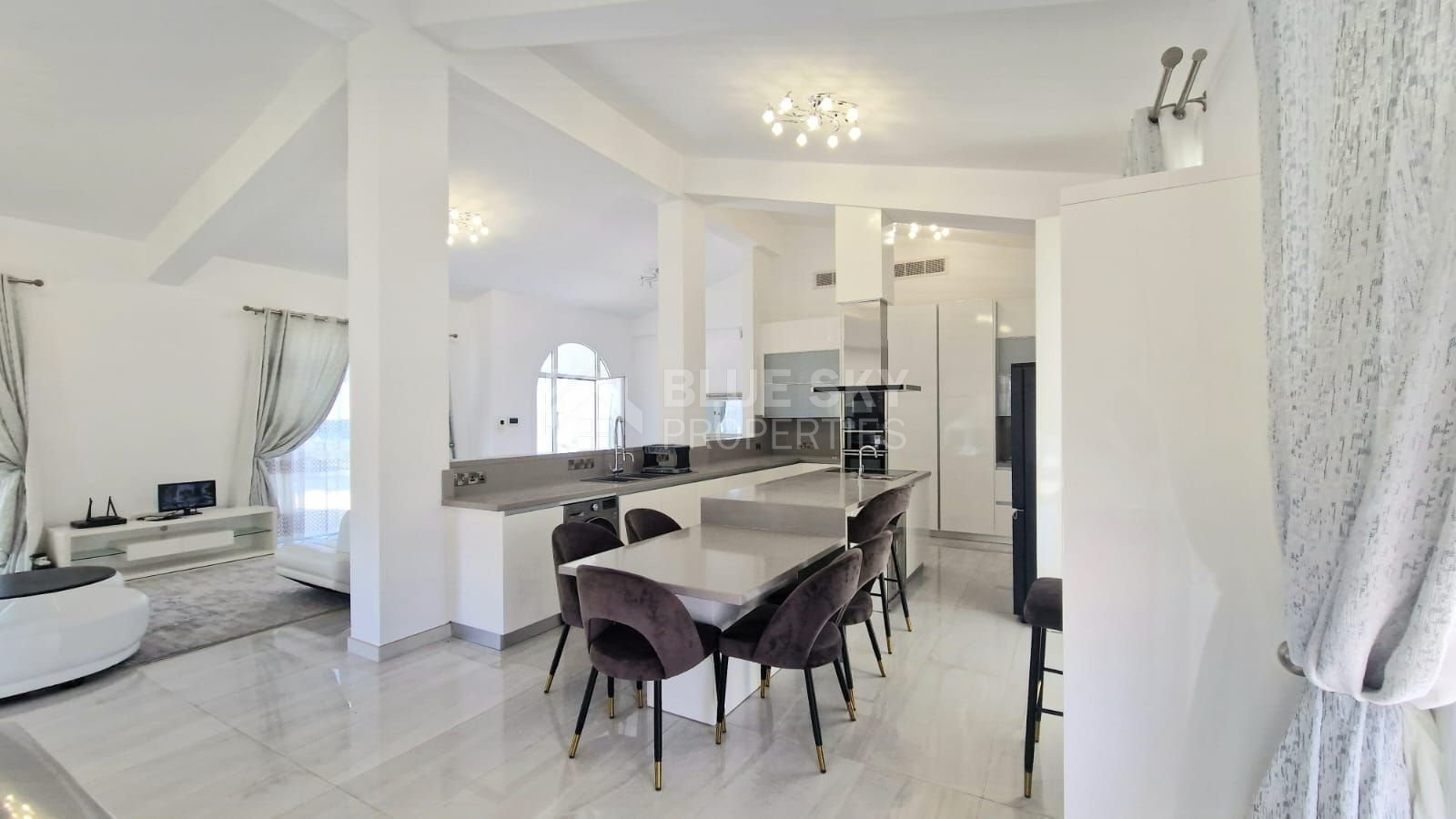 The property is set on a large plot with a private swimming pool and landscaped gardens. Fully furnished to a high standard, this home is ready for you to move in and enjoy. Its open-plan layout is flooded with natural light thanks to the large south-east facing windows, which perfectly frame stunning sea views.