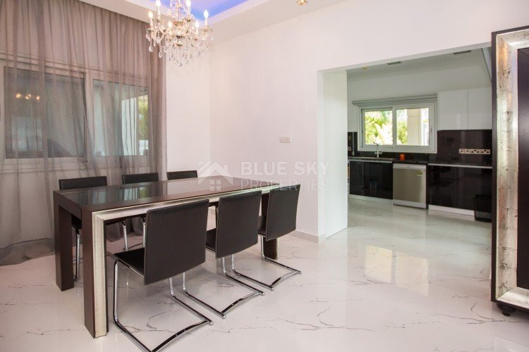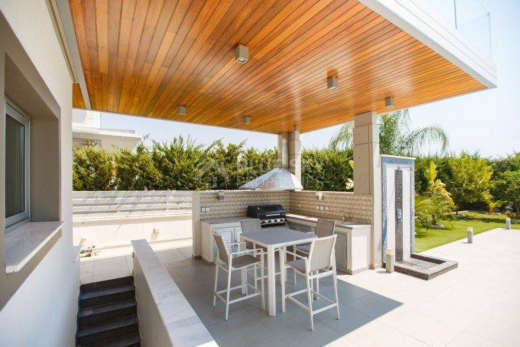 Luxury modern design custom built villa in Agios Tychonas offering a covered area of 350m² and plot size 583m². Offered fully furnished.Upper level: 3 all en suite bedrooms, master bedroom with walk in wardrobe and air bath, maids quarter, kitchenette. Modern open plan area on the ground level, with sitting/dining/ separate secondary sitting /lounge area, fully equipped kitchen with island bar, large secondary kitchen /utility area ,play room, security room with CCTV cameras. Under floor heating, central Hoover system, VRV a/c, alarm system. swimming pool and roof garden with nice views,also a lounge room with wc, external storeroom, BBQ with basin built in, outside shower.