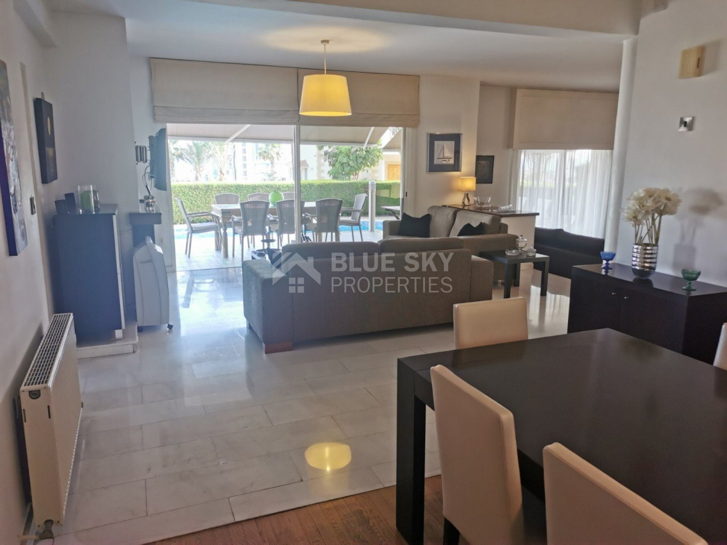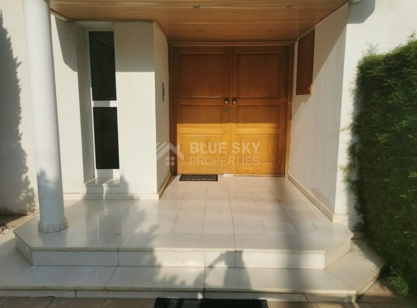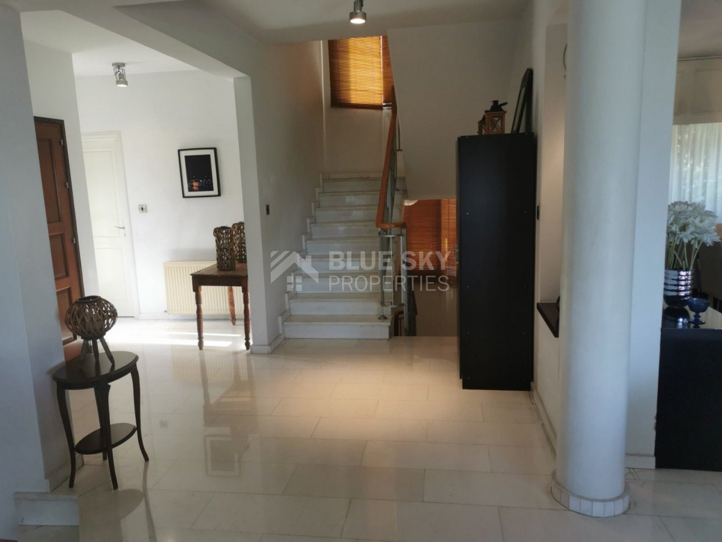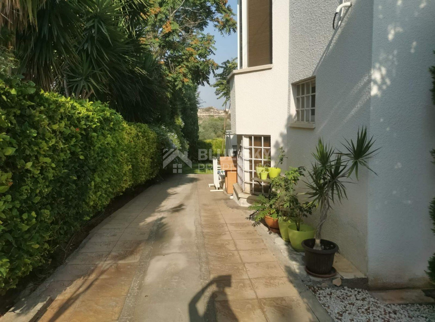 Lovely five bedroom villa in Agios Tychonas with swimming pool and sea view is available now.It has internal covered area 431 square meters and plot size 954 square meters. There is separate kitchen with two living rooms , one sitting room, two dining rooms and a guest w/c. Also there is a fire place, store room and one utility room.There are four bedrooms and one of them has en-suite bathroom, all with fitted wardrobes and a family bathroom on the first floor. Outside of the building there is a nice big garden with trees and flowers, with automatic watering system , large covered parking space for three cars with electric gate and barbecue.There is a maids-room , playing room and kitchenette. The aluminium doors and windows are double glazed with security locks. It has solar water heater with pressure. Also it has security system , alarm system, a/c in all areas diesel central heating and water drilling .The house is located on a hill of Agios Tychonas with view of Limassol and is only five minutes drive from the sea and ten minutes drive from Limassol City.Located in a quiet ,nice area surrounded by nice houses at a dead end road.It has quick access to all needed amenities including supermarkets, parks,schools, restaurants and beach.