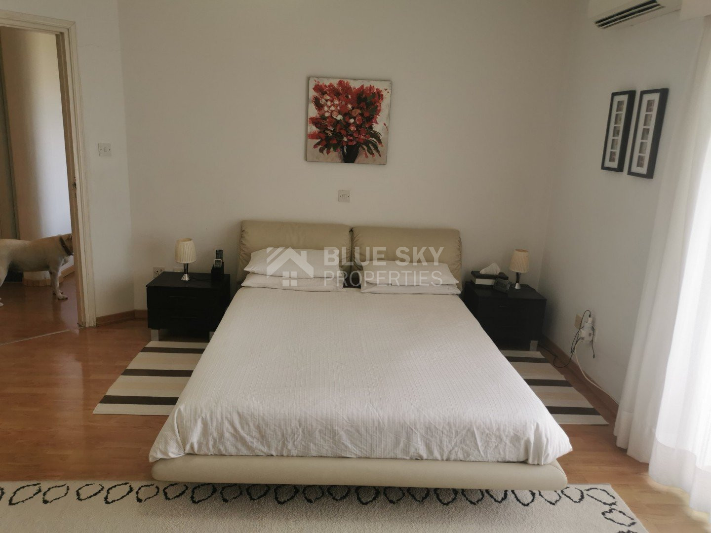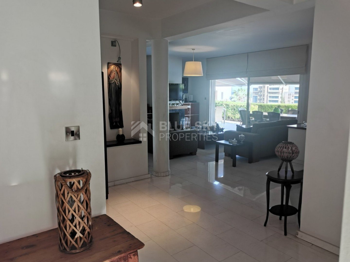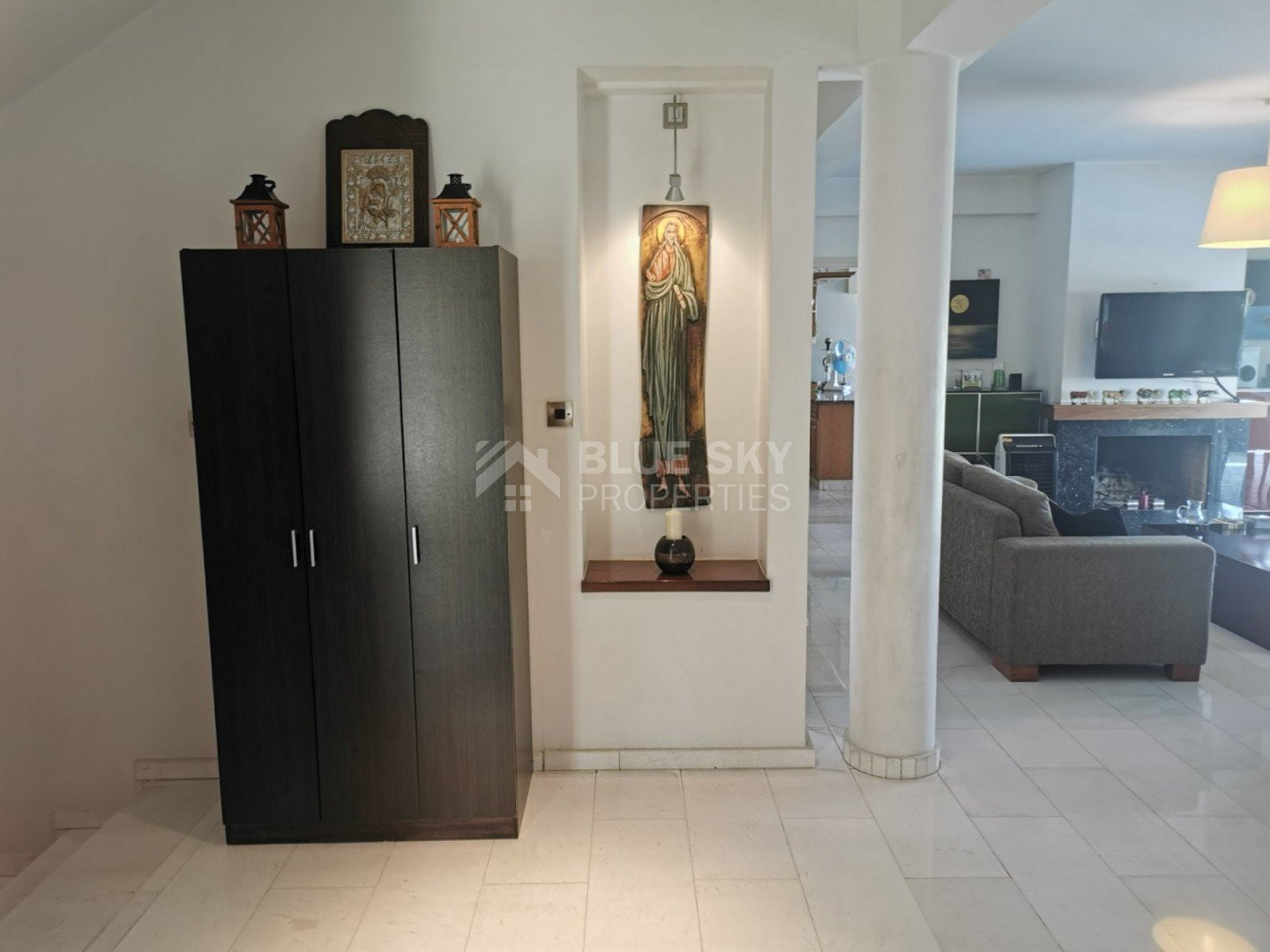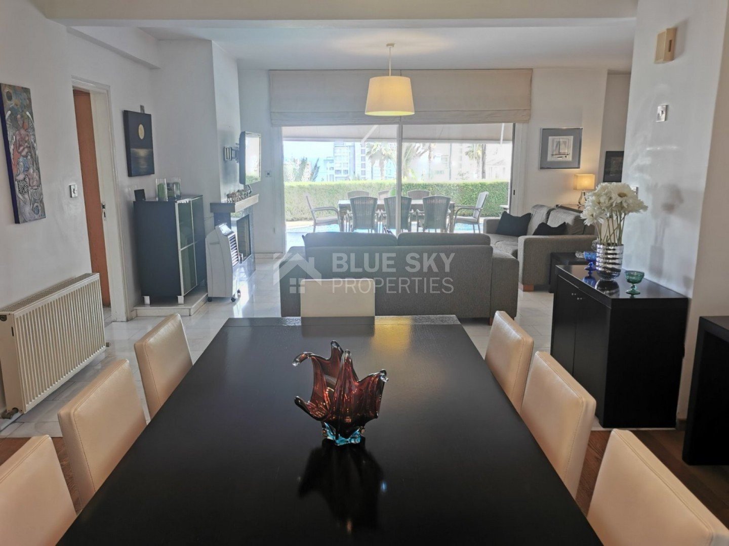 Lovely five bedroom villa in Agios Tychonas with swimming pool and sea view is available now.It has internal covered area 431 square meters and plot size 954 square meters. There is separate kitchen with two living rooms , one sitting room, two dining rooms and a guest w/c. Also there is a fire place, store room and one utility room.There are four bedrooms and one of them has en-suite bathroom, all with fitted wardrobes and a family bathroom on the first floor. Outside of the building there is a nice big garden with trees and flowers, with automatic watering system , large covered parking space for three cars with electric gate and barbecue.There is a maids-room , playing room and kitchenette. The aluminium doors and windows are double glazed with security locks. It has solar water heater with pressure. Also it has security system , alarm system, a/c in all areas diesel central heating and water drilling .The house is located on a hill of Agios Tychonas with view of Limassol and is only five minutes drive from the sea and ten minutes drive from Limassol City.Located in a quiet ,nice area surrounded by nice houses at a dead end road.It has quick access to all needed amenities including supermarkets, parks,schools, restaurants and beach.