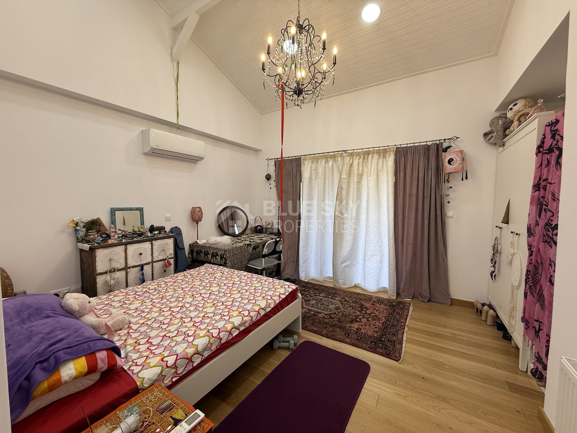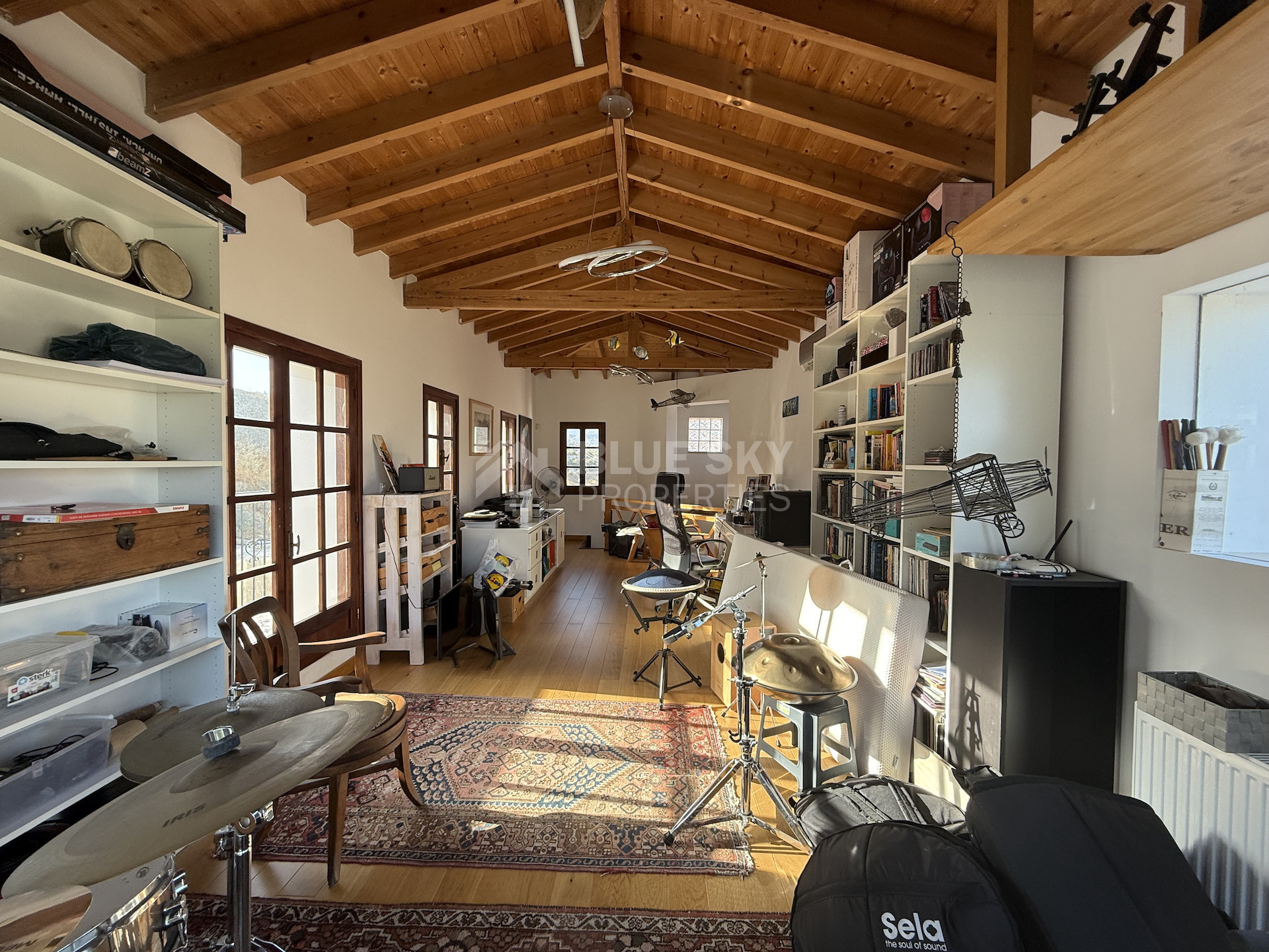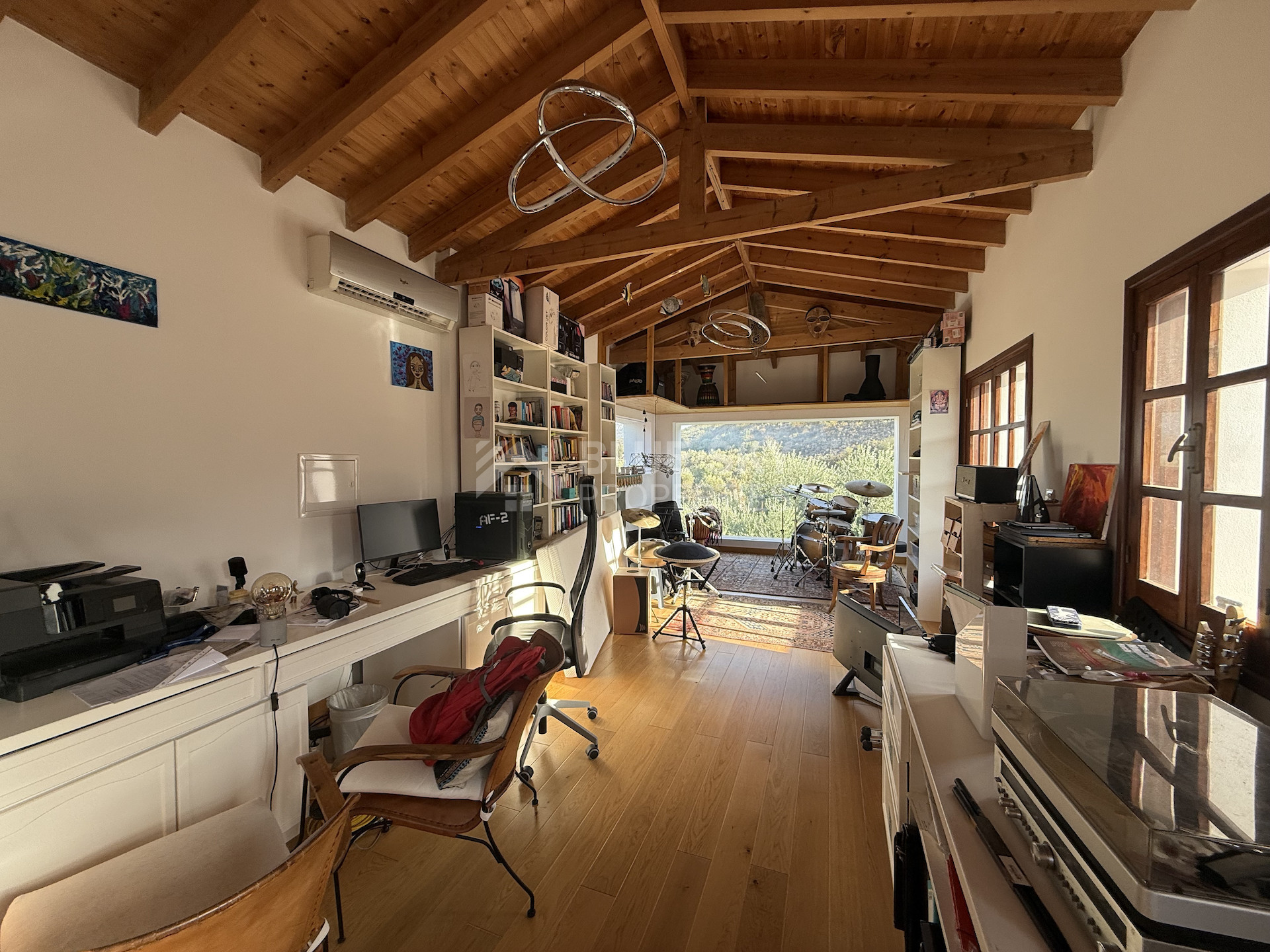 Upon entering the home, you are welcomed by a bright entrance hall leading to spacious open-plan lounge, dining, and sitting areas, all featuring high, exposed wooden ceilings and natural wooden flooring. The fully equipped kitchen includes a separate utility room and opens out through large patio doors to expansive outdoor terraces and landscaped grounds—ideal for al fresco dining and entertaining.