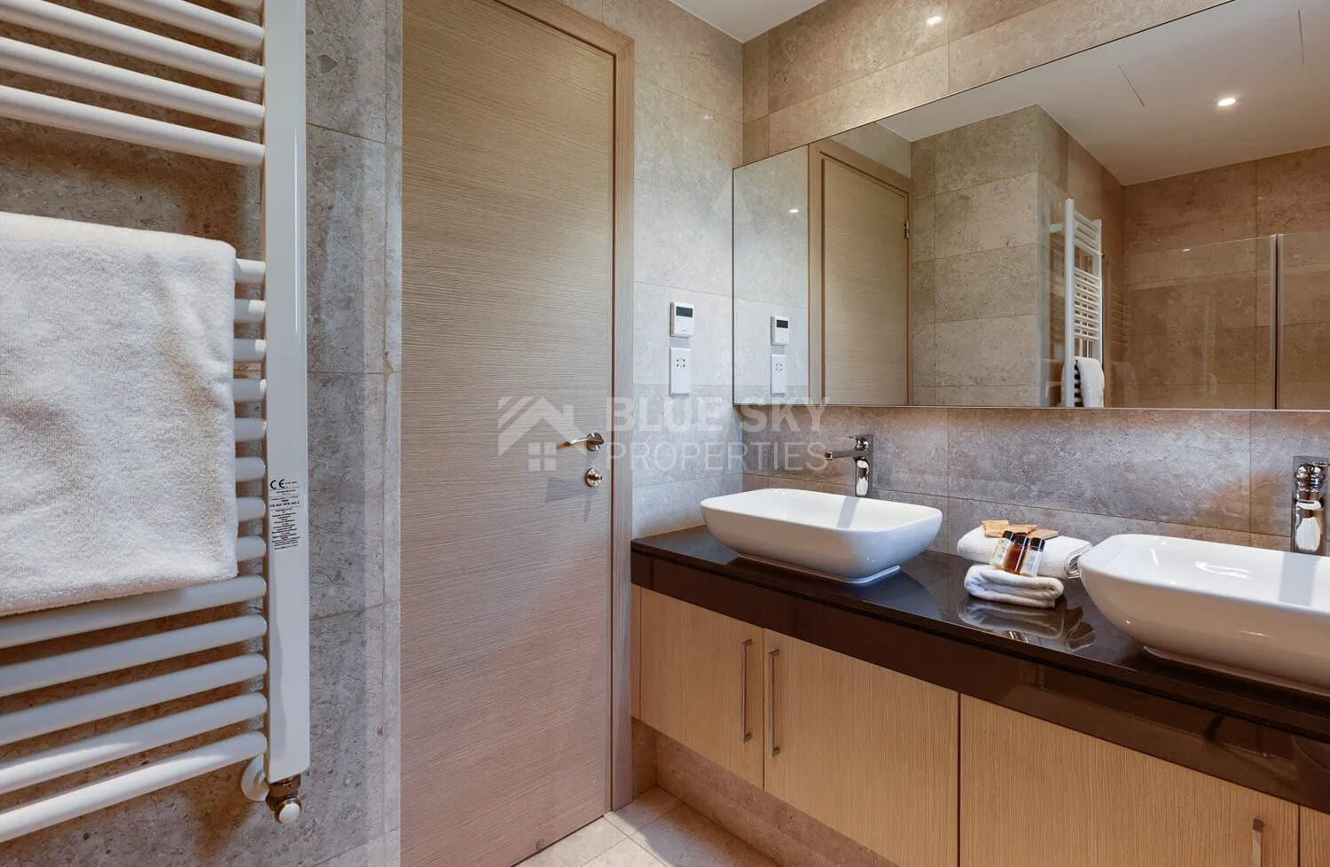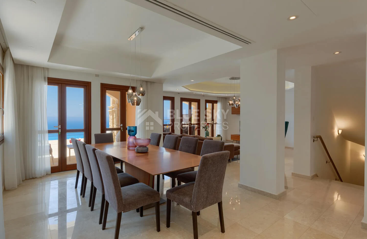 The marble staircase ascends to the first floor, where the master bedroom enjoys breathtaking sea views from a private balcony, complete with a luxurious en-suite bathroom featuring twin basins, bath, and a separate shower. Two additional bedrooms on this floor also benefit from en-suite facilities.