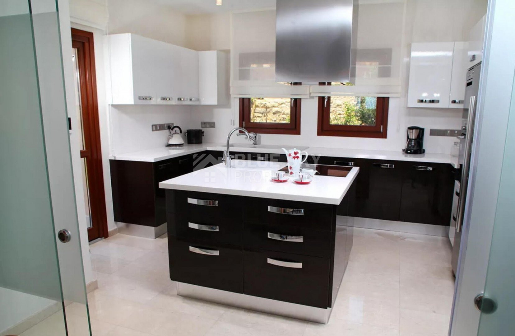 The beautifully furnished living area boasts plush armchairs and a sofa facing the graceful feature fireplace and has an adjacent dining area with a fabulous hardwood dining table and 8 opulently upholstered chairs. Sets of French doors provide magnificent views of the sea and skyline. The modern kitchen is separated by sliding glass doors features stylish high-gloss units and top quality granite worktops and splash backs. All modern conveniences are provided including a large fridge freezer, electric oven, hob and microwave and dishwasher.