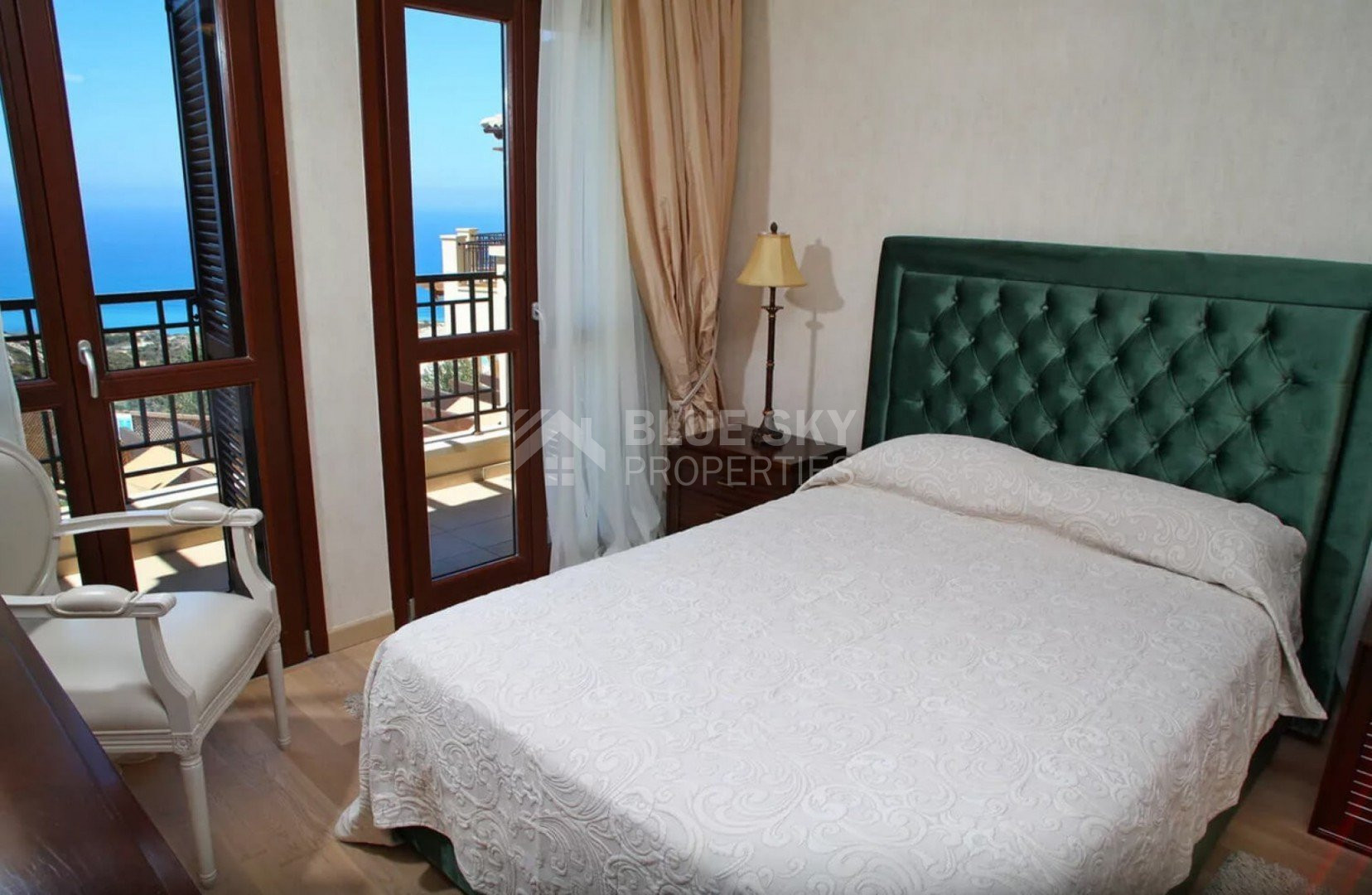 The marble staircase leads up to the first floor, with three more bedrooms and even more wide-sweeping sea views. The master bedroom is exquisite, with beautiful furnishings giving a true sense of luxury. Featuring a sumptuous king-size bed and shuttered French doors opening out to the balcony from where one can take in the panoramic views, and an en-suite bathroom which is fully tiled in granite offers twin washbasins, WC, Jacuzzi bath and separate shower.
