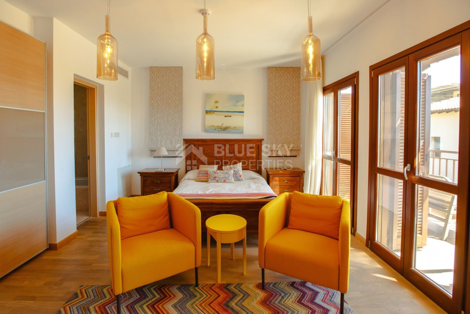 Upstairs, the spacious bedrooms are beautifully fitted with parquet floor and features attractive drapes and soft furnishings. Furnished with a king size/double beds, TV, dressers and matching side tables it offers a private balcony for each offering extensive sea views. The en-suite bathroom is fitted with twin wash basins in a marble vanity unit, and bath/shower combination.