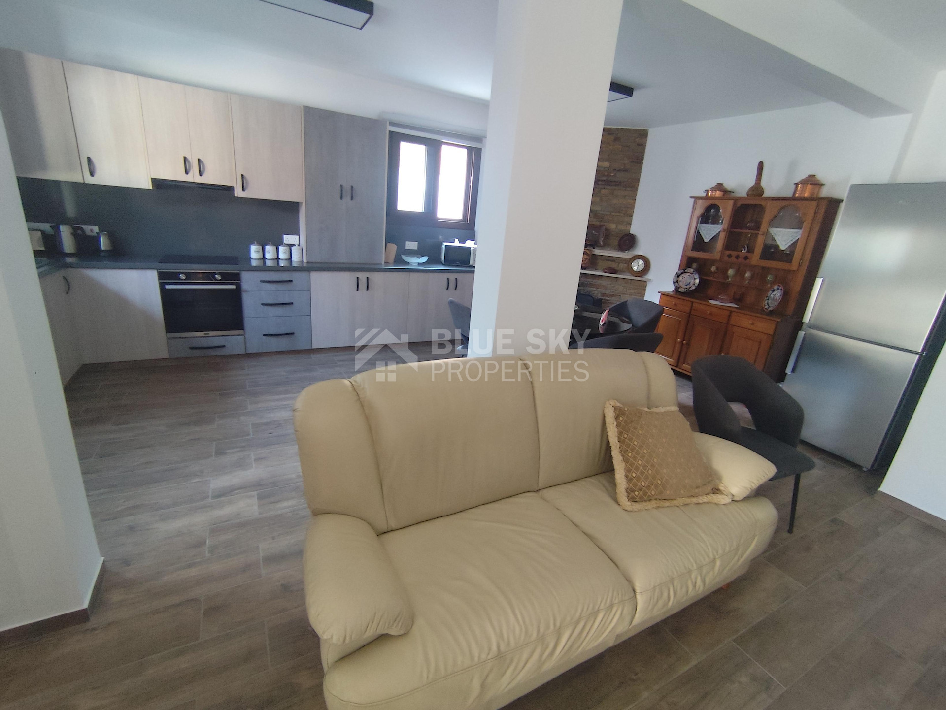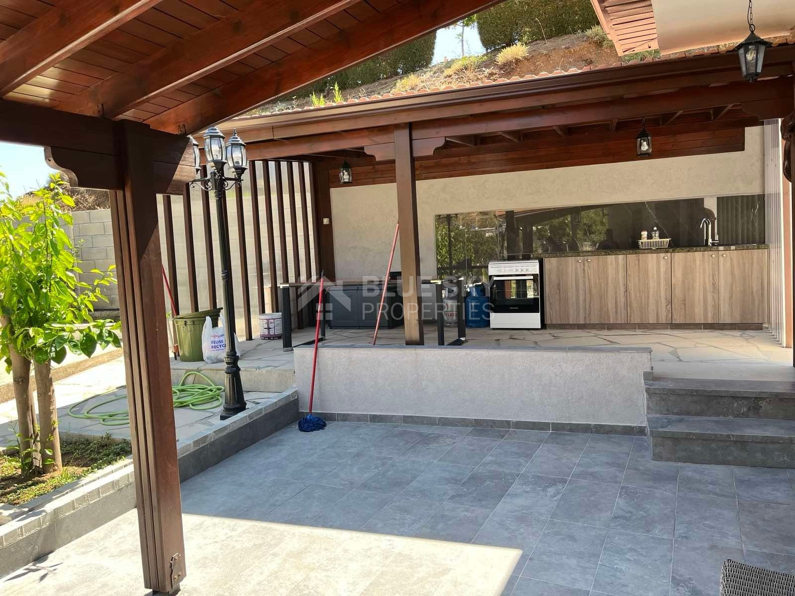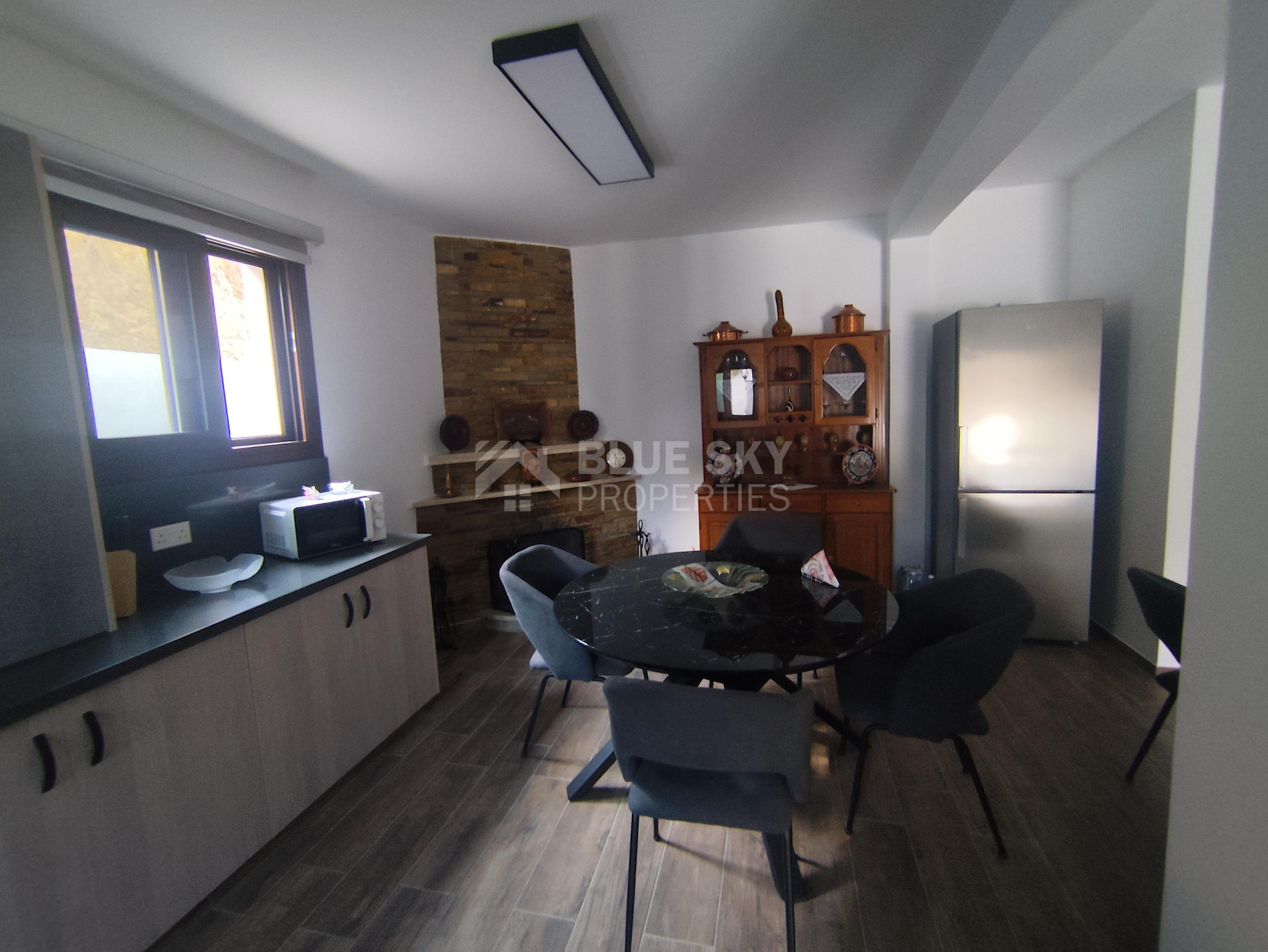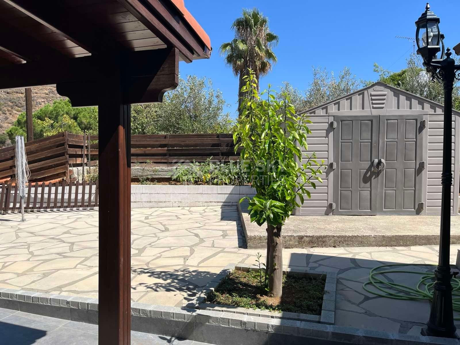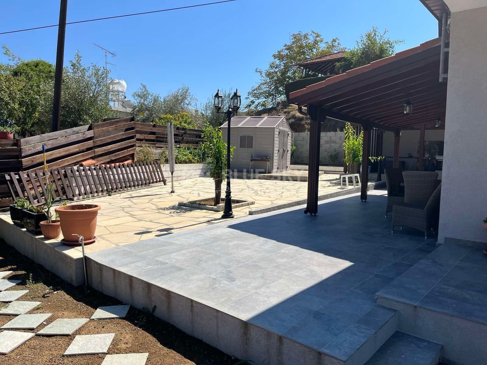 Lovely three bedroom house with panoramic view in Kalo Chorio village is available now.It has internal covered area 150 square meters and the plot is 504 square meters .There is an open plan kitchen with one living room, one dining room , store room, fire place, a/c in all areas and central heating.Also there is nice courtyard with very delicious fruits.There are three bedrooms ( one of them en-suite ) all with fitted wardrobes and one family bathroom.It has solar water heater with pressure , fitted electrical appliances and will be sold with the furniture as well..Located in a quiet ,nice area surrounded by nice houses.It has easy access to the motorway and is very close to the supermarkets, shops, pharmacy etc.
