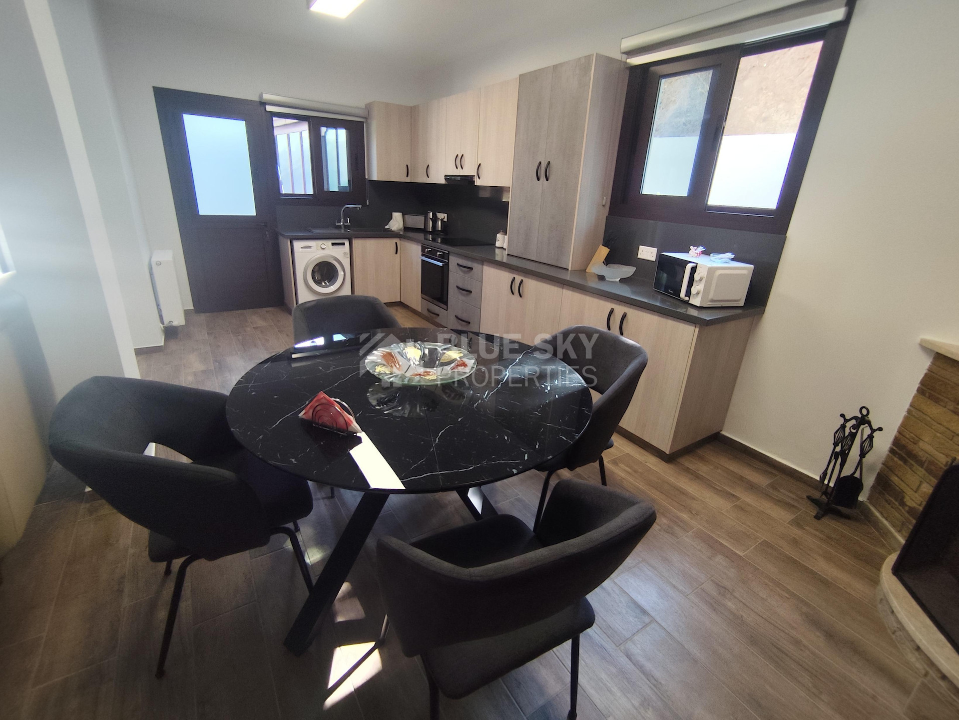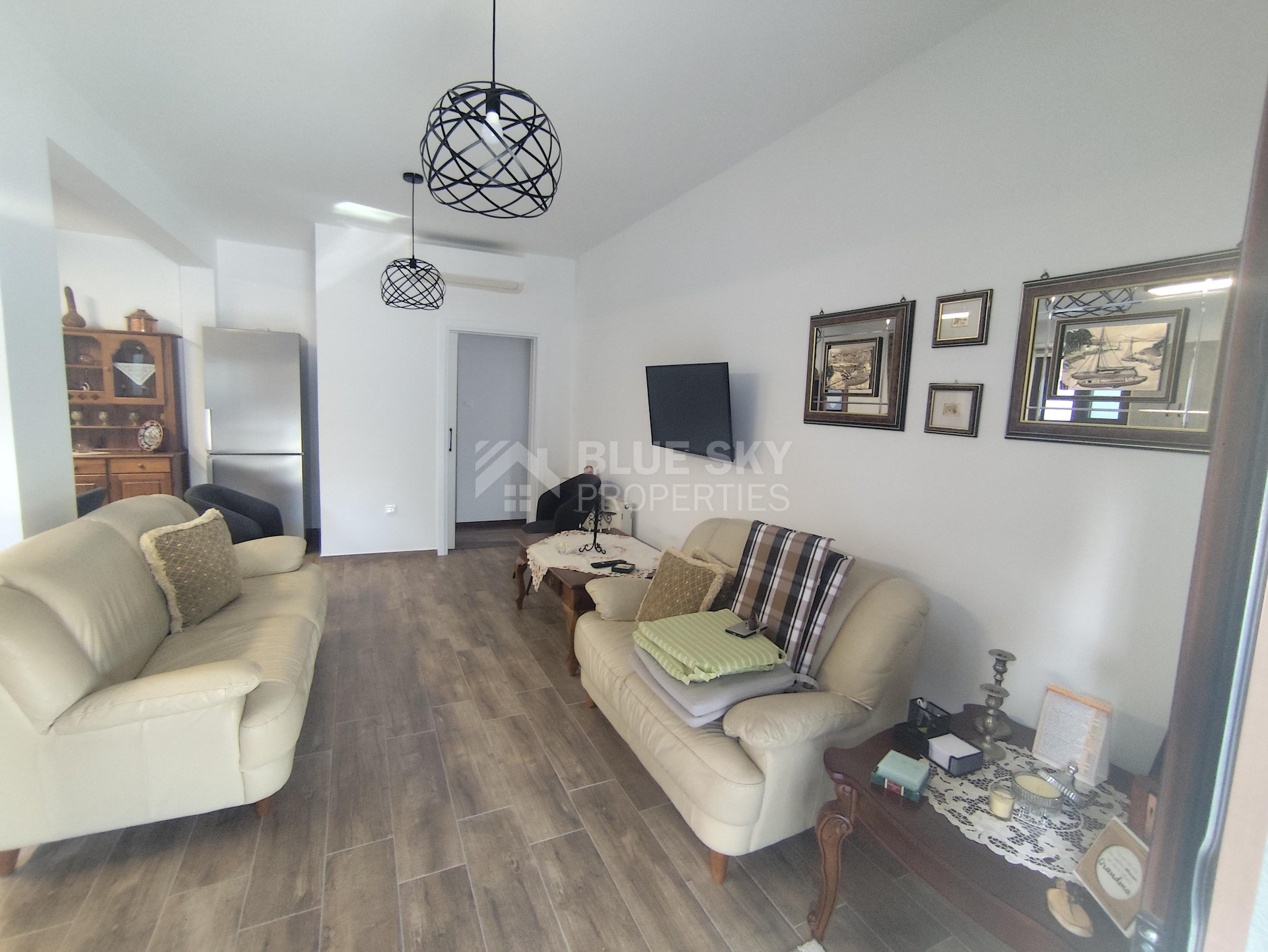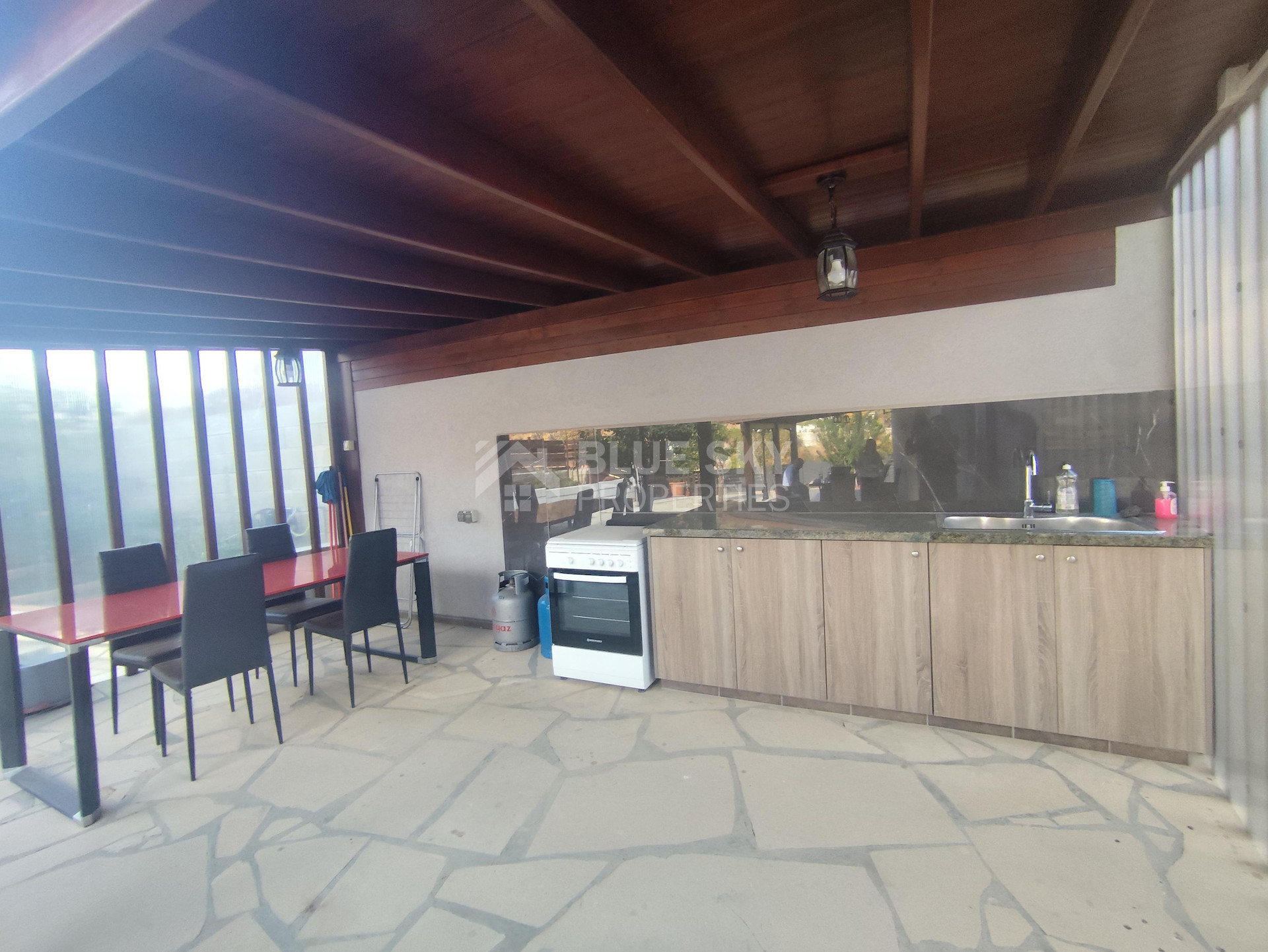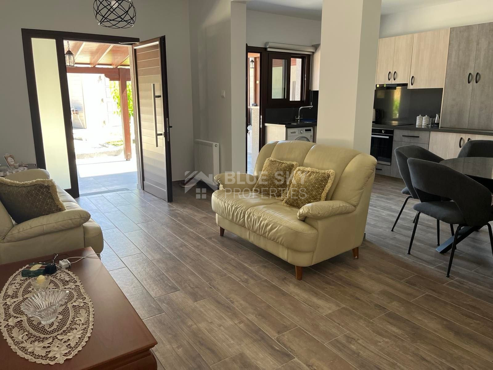 Lovely three bedroom house with panoramic view in Kalo Chorio village is available now.It has internal covered area 150 square meters and the plot is 504 square meters .There is an open plan kitchen with one living room, one dining room , store room, fire place, a/c in all areas and central heating.Also there is nice courtyard with very delicious fruits.There are three bedrooms ( one of them en-suite ) all with fitted wardrobes and one family bathroom.It has solar water heater with pressure , fitted electrical appliances and will be sold with the furniture as well..Located in a quiet ,nice area surrounded by nice houses.It has easy access to the motorway and is very close to the supermarkets, shops, pharmacy etc.