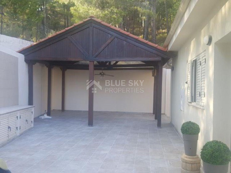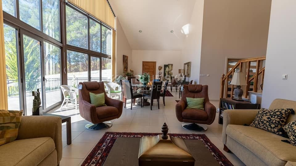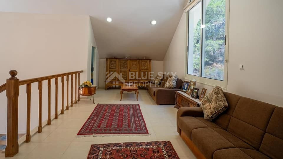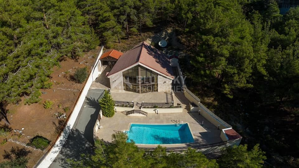 Discover a beautiful and unique luxury home nestled among the forests of Platres, ensuring complete privacy and security with its gated entrance and a private road leading to the residence. This meticulously maintained detached house spans two levels, featuring three bedrooms plus an office or extra bedroom, three bathrooms, a spacious eat-in kitchen, and generous living and dining areas. Abundant storage is provided by two expansive storage rooms. The villa boasts a large private swimming pool and ample patio/terrace space, perfect for entertaining guests. Situated on a vast 1624sqm plot with mature trees and landscaped gardens, the property offers tranquility amidst forest pine trees and stunning elevated views of the mountains. The kitchen, equipped with modern appliances, leads to an external purpose-built barbecue area and a covered wooden pergola. The property features underfloor heating, solar water heating, double glazing, a security alarm system, and a private road, all contributing to the comfort and privacy of your life. With four separate spacious bedrooms, including a master bedroom with an ensuite bathroom, this villa harmoniously blends luxury and natural beauty, providing an idyllic retreat in a serene forest setting.Set amongst the pine forest of Platres this is a beautiful Villa designed and built by the current owners. A very quiet, private and peaceful location in the heart of nature. 10 minutes drive to Troodos and 5 minutes to large supermarket, shops and amenities.