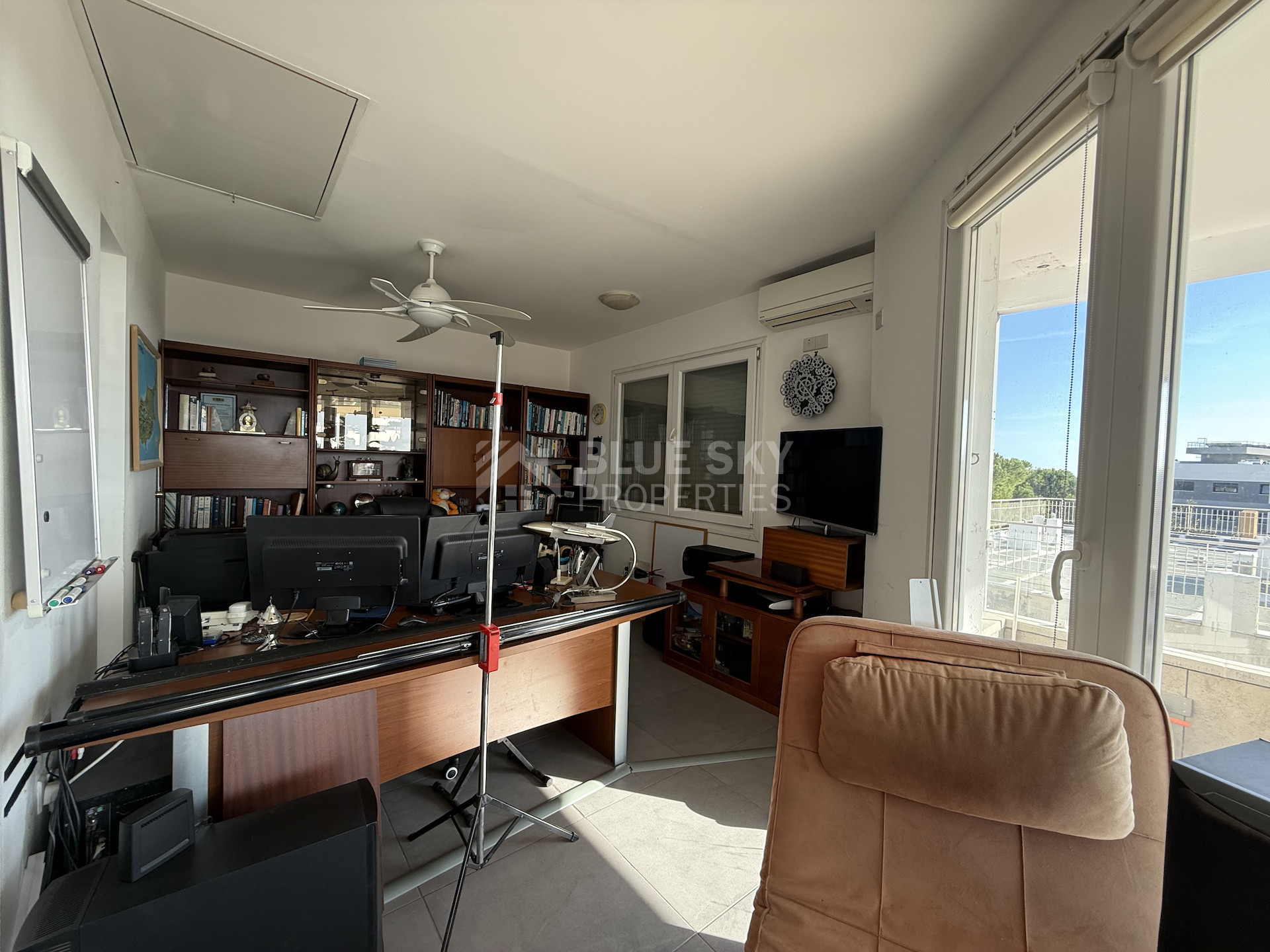 The upper level, originally an extension of the ground floor home, offers two generous bedrooms, two bathrooms, a spacious living and office area, and a large balcony with views.