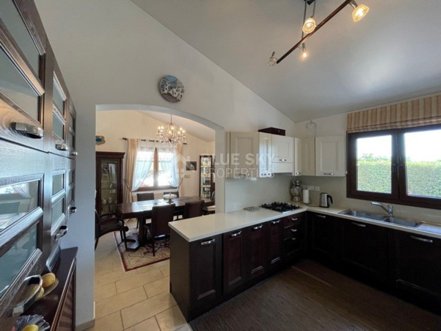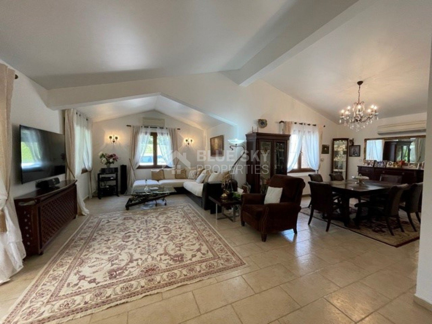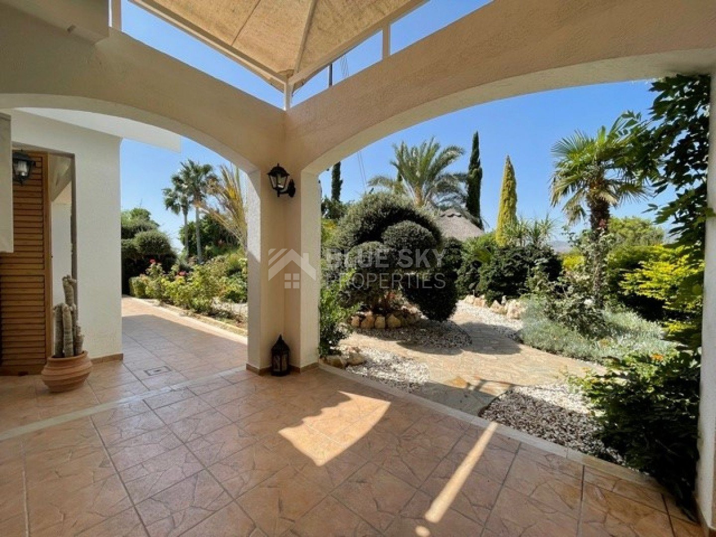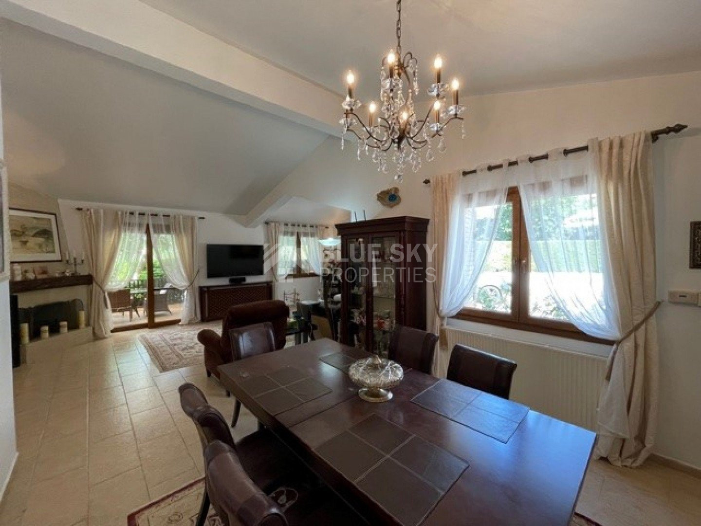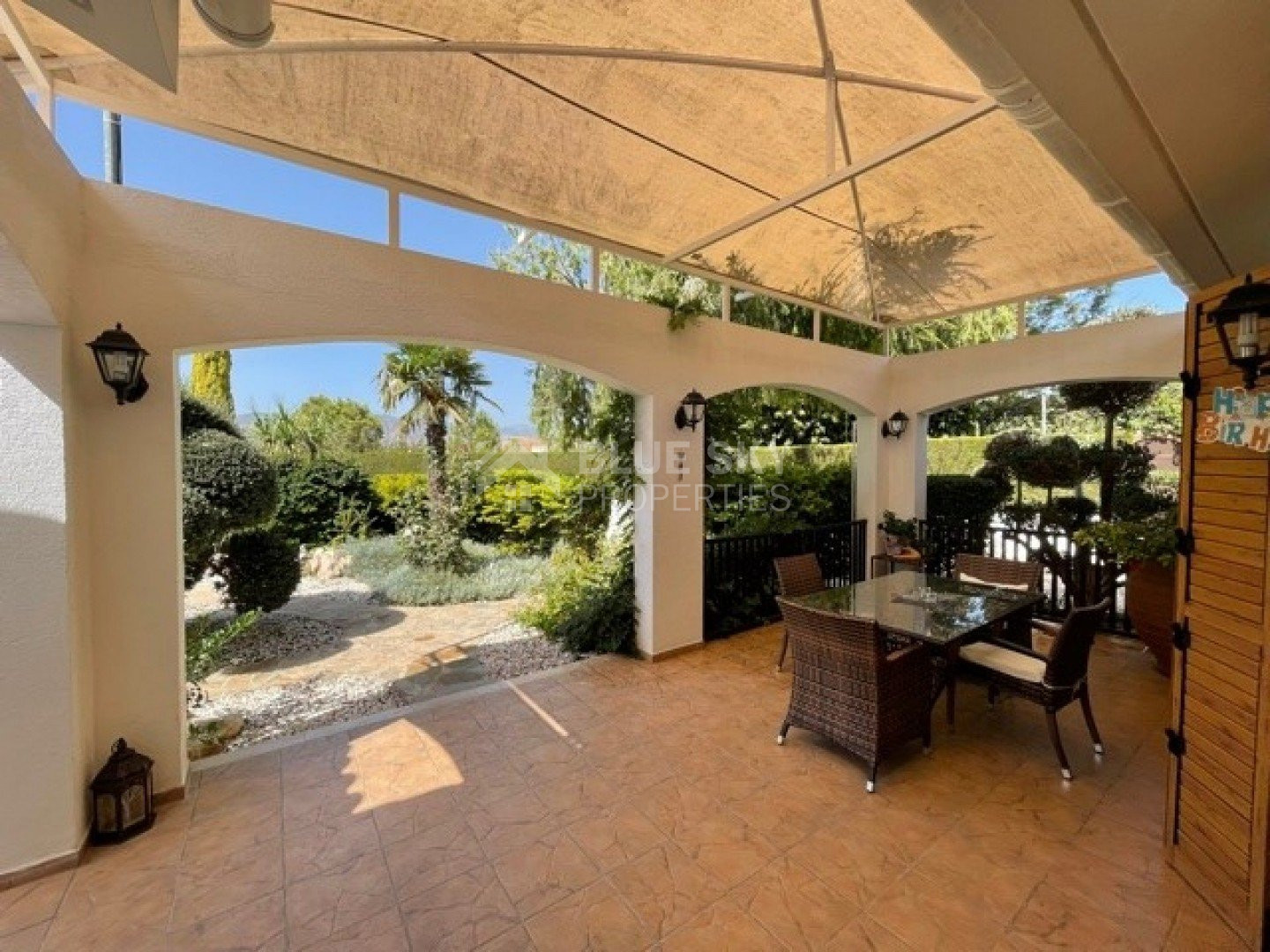 This outstanding property is in the sought after location of Pyrgos.The villa is tucked away in a Cul De Sac surrounded by the most beautiful landscaped gardens, heated swimming pool, pergolas, outside entertaining BBQ areas and outside kitchens.Plot size is 1,056m² however within the private grounds there is a large green area of a further 900m² approx, which the owners have a written agreement and consent with the Municipality for private use, therefore they have planted fruit trees and vineyards.The property itself is in excellent condition, offering comfortable sitting/lounge/dining areas, study, 3 double bedrooms with bathrooms. Steps from the study lead down to the master bedroom en suite with walk in wardrobe, gym room or further fifth bedroom with shower if required. The kitchen is separate and fully equipped.Fully gas central heated, a/c units throughout, double glazed with French style shutters, alarms, cameras, car-ports for 3 cars.This property is a real haven and a must view!