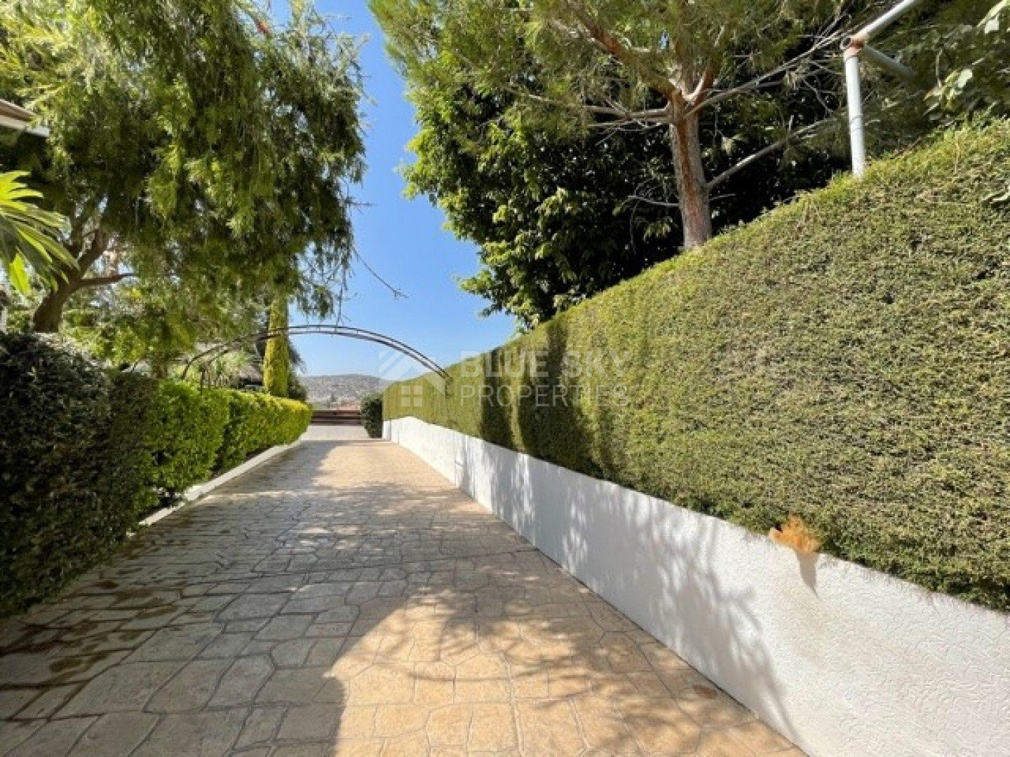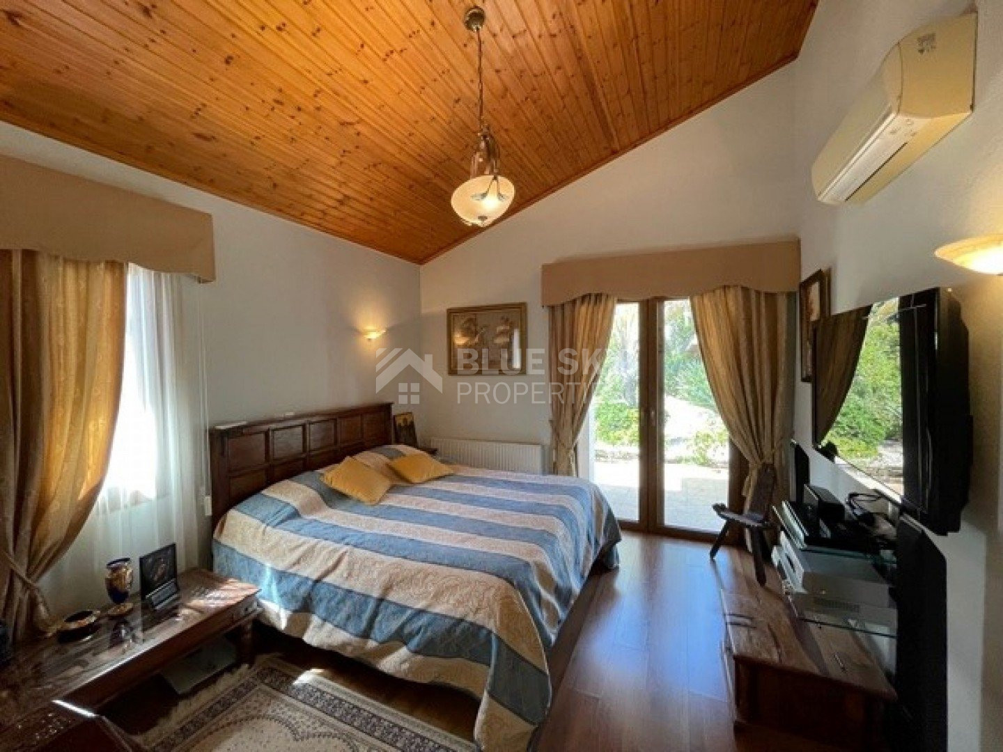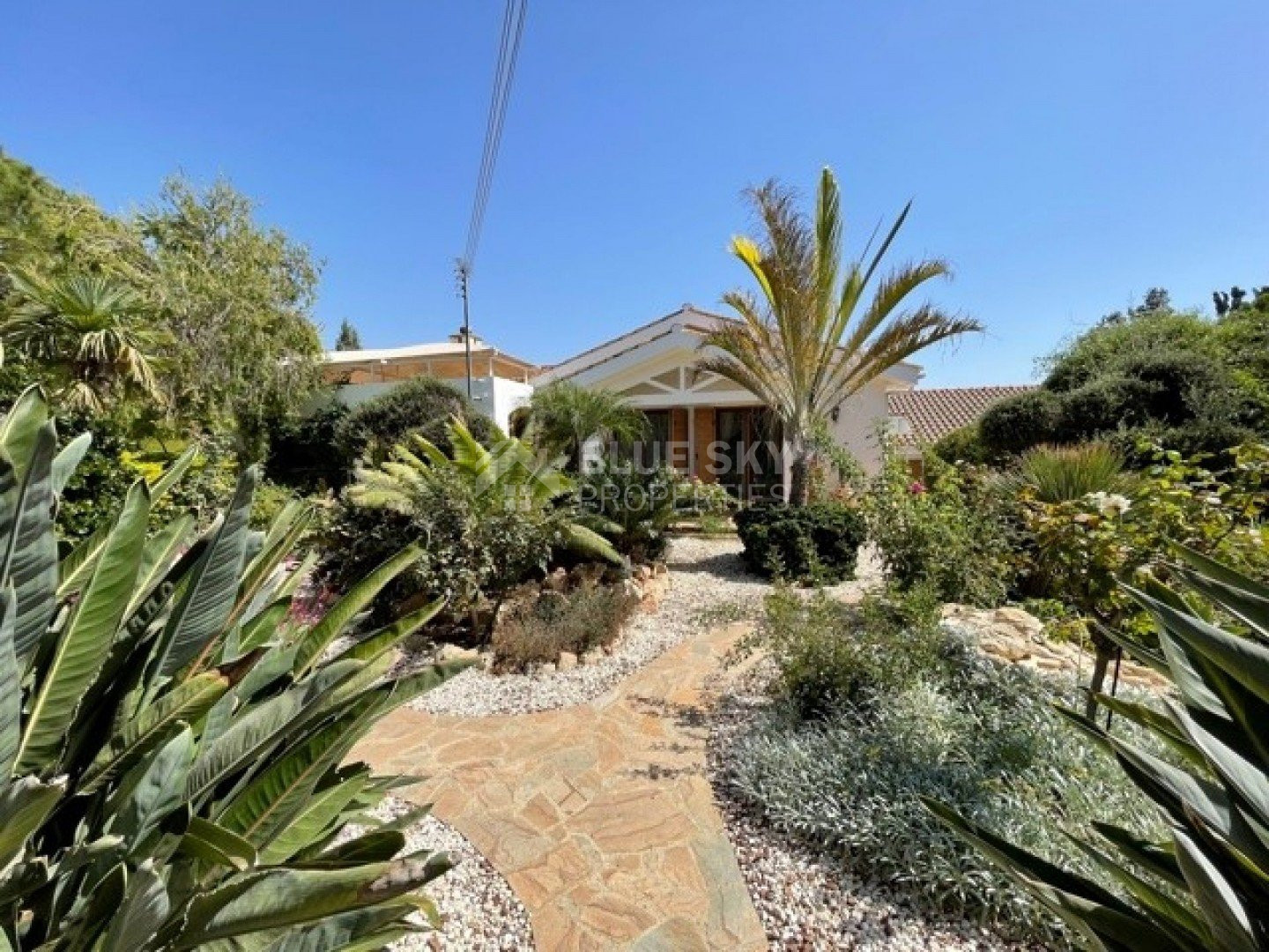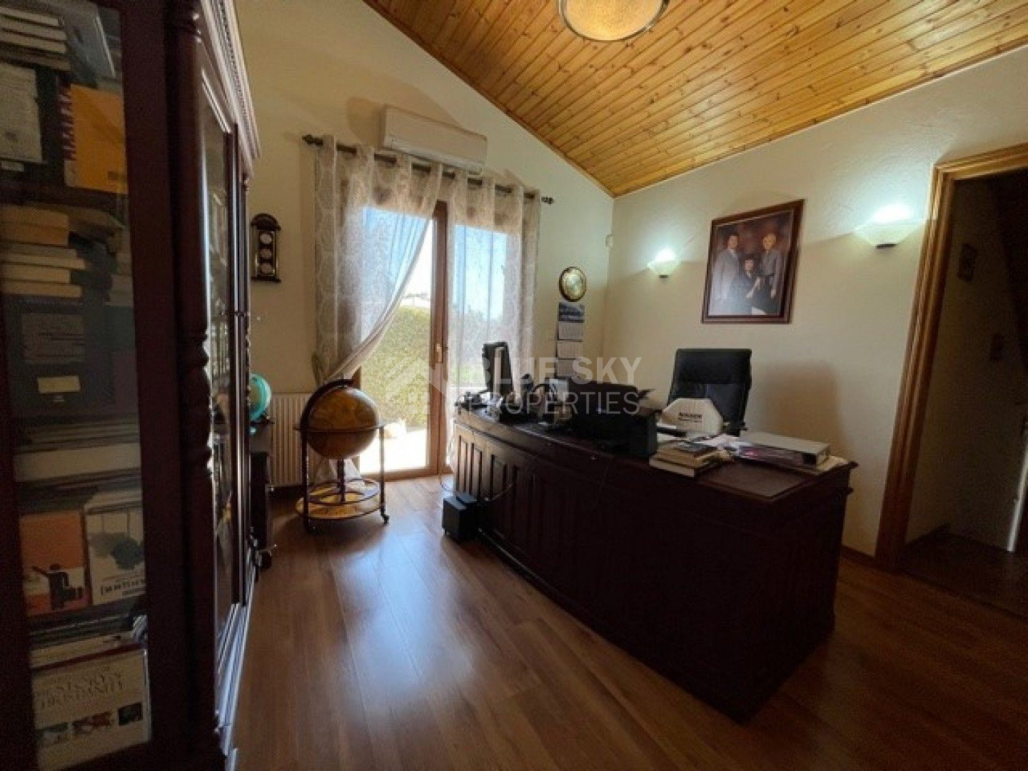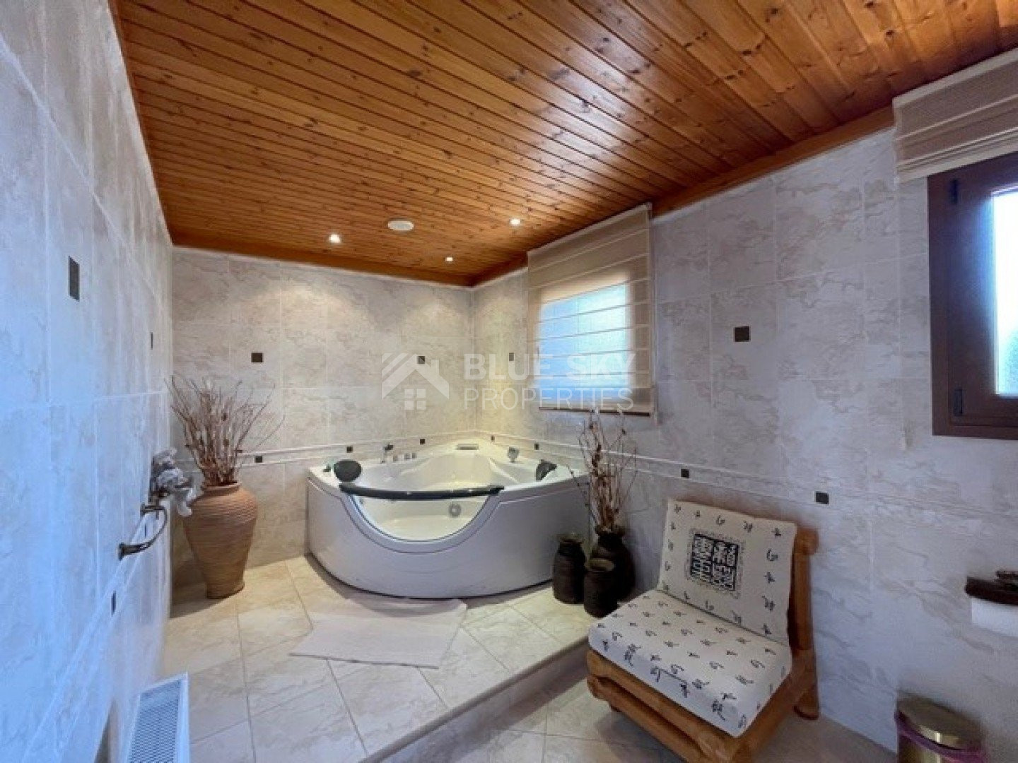 This outstanding property is in the sought after location of Pyrgos.The villa is tucked away in a Cul De Sac surrounded by the most beautiful landscaped gardens, heated swimming pool, pergolas, outside entertaining BBQ areas and outside kitchens.Plot size is 1,056m² however within the private grounds there is a large green area of a further 900m² approx, which the owners have a written agreement and consent with the Municipality for private use, therefore they have planted fruit trees and vineyards.The property itself is in excellent condition, offering comfortable sitting/lounge/dining areas, study, 3 double bedrooms with bathrooms. Steps from the study lead down to the master bedroom en suite with walk in wardrobe, gym room or further fifth bedroom with shower if required. The kitchen is separate and fully equipped.Fully gas central heated, a/c units throughout, double glazed with French style shutters, alarms, cameras, car-ports for 3 cars.This property is a real haven and a must view!
