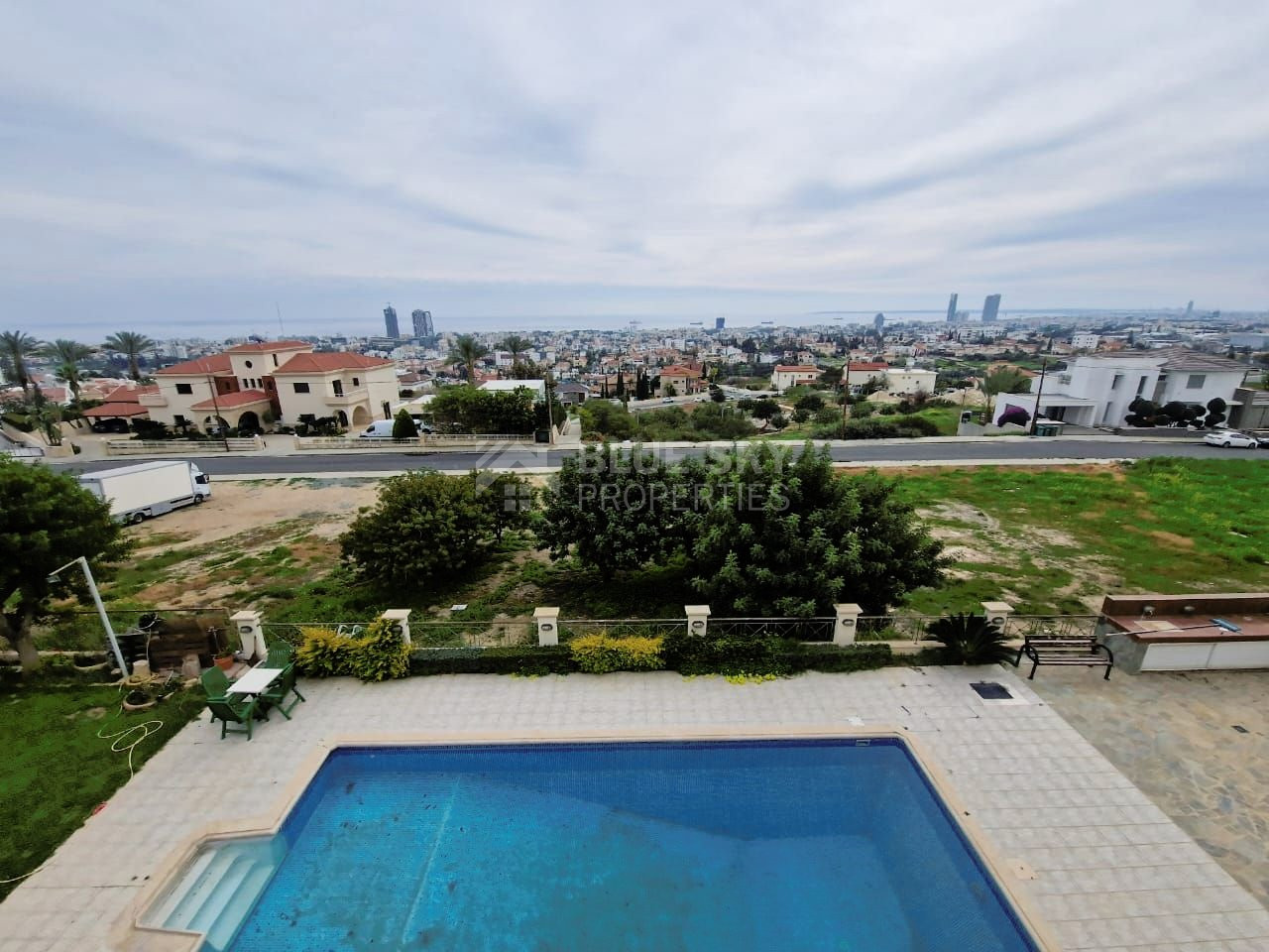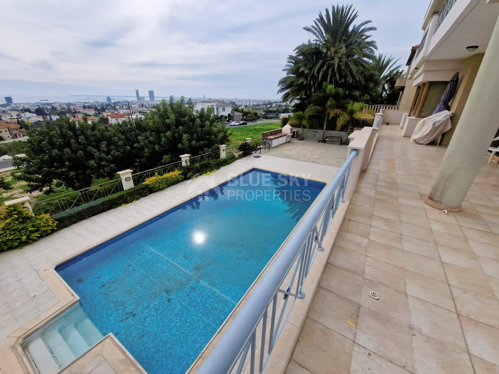 Outside, the villa features a sparkling swimming pool with panoramic vistas of the city and sea, ideal for relaxation and outdoor gatherings. The expansive garden offers plenty of space for leisure activities and peaceful moments. For convenience, a double garage provides secure parking for vehicles.