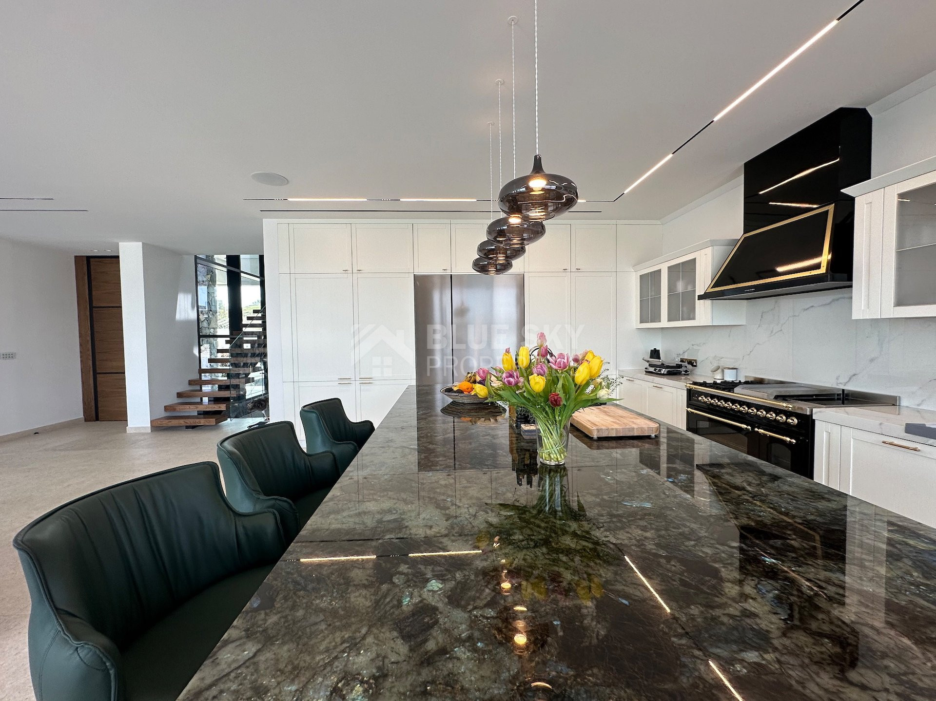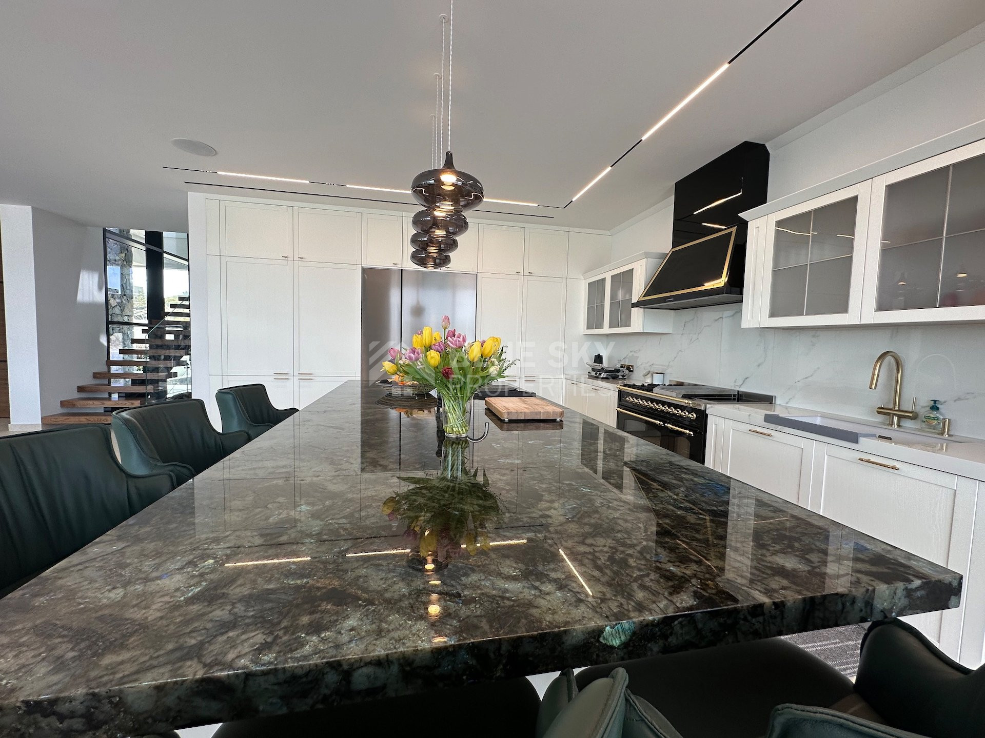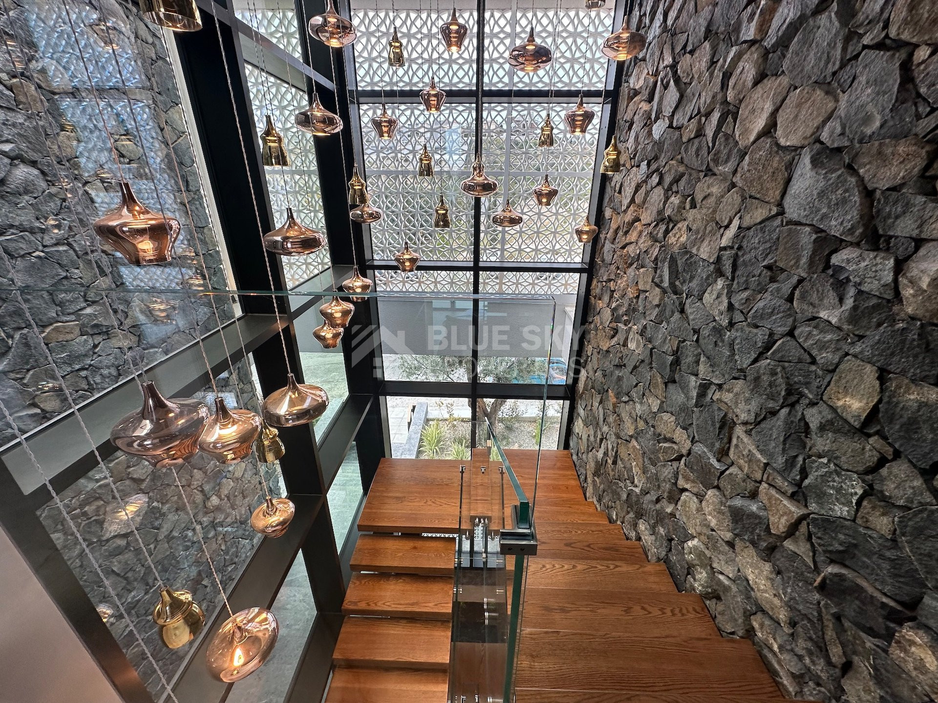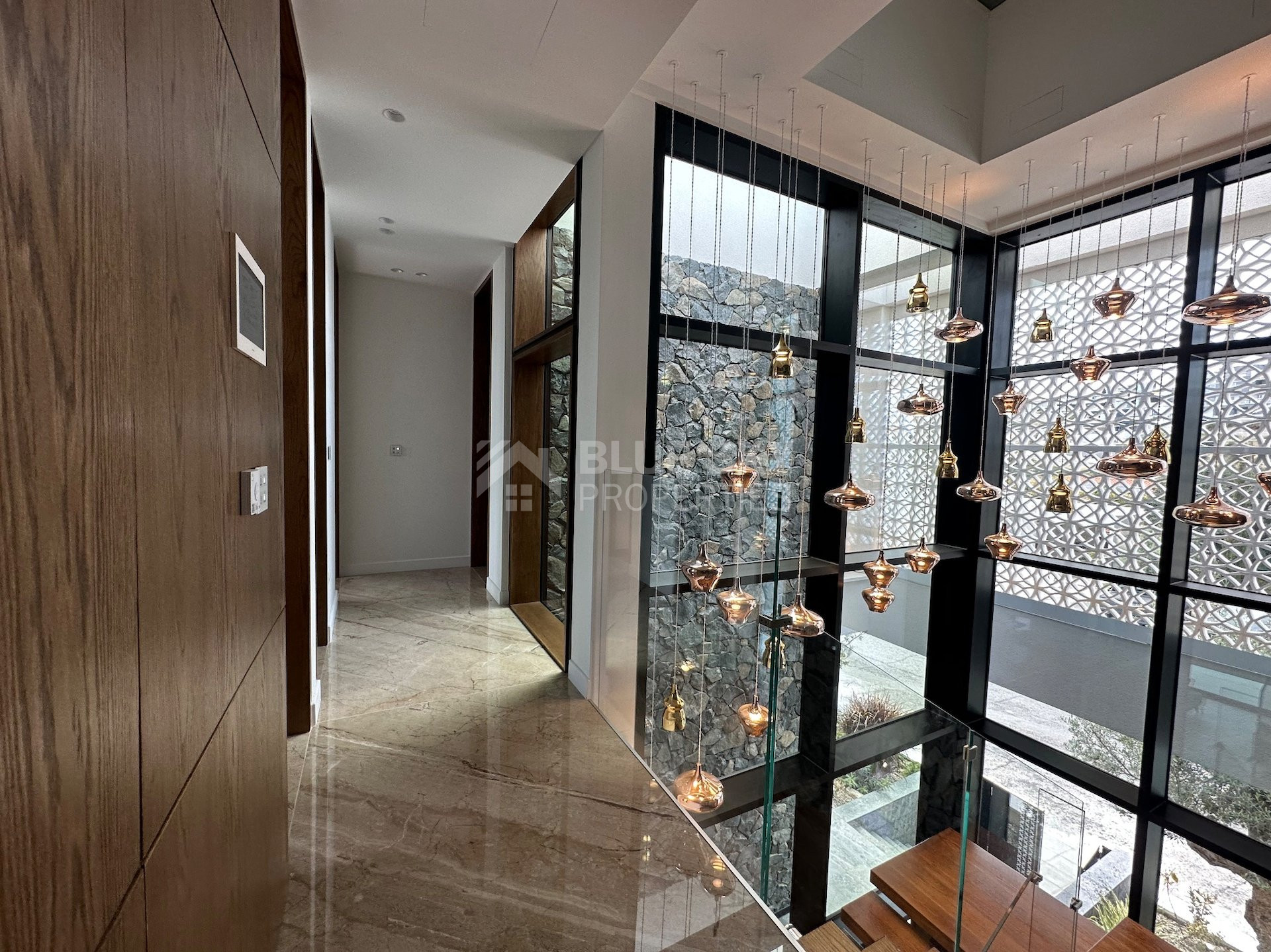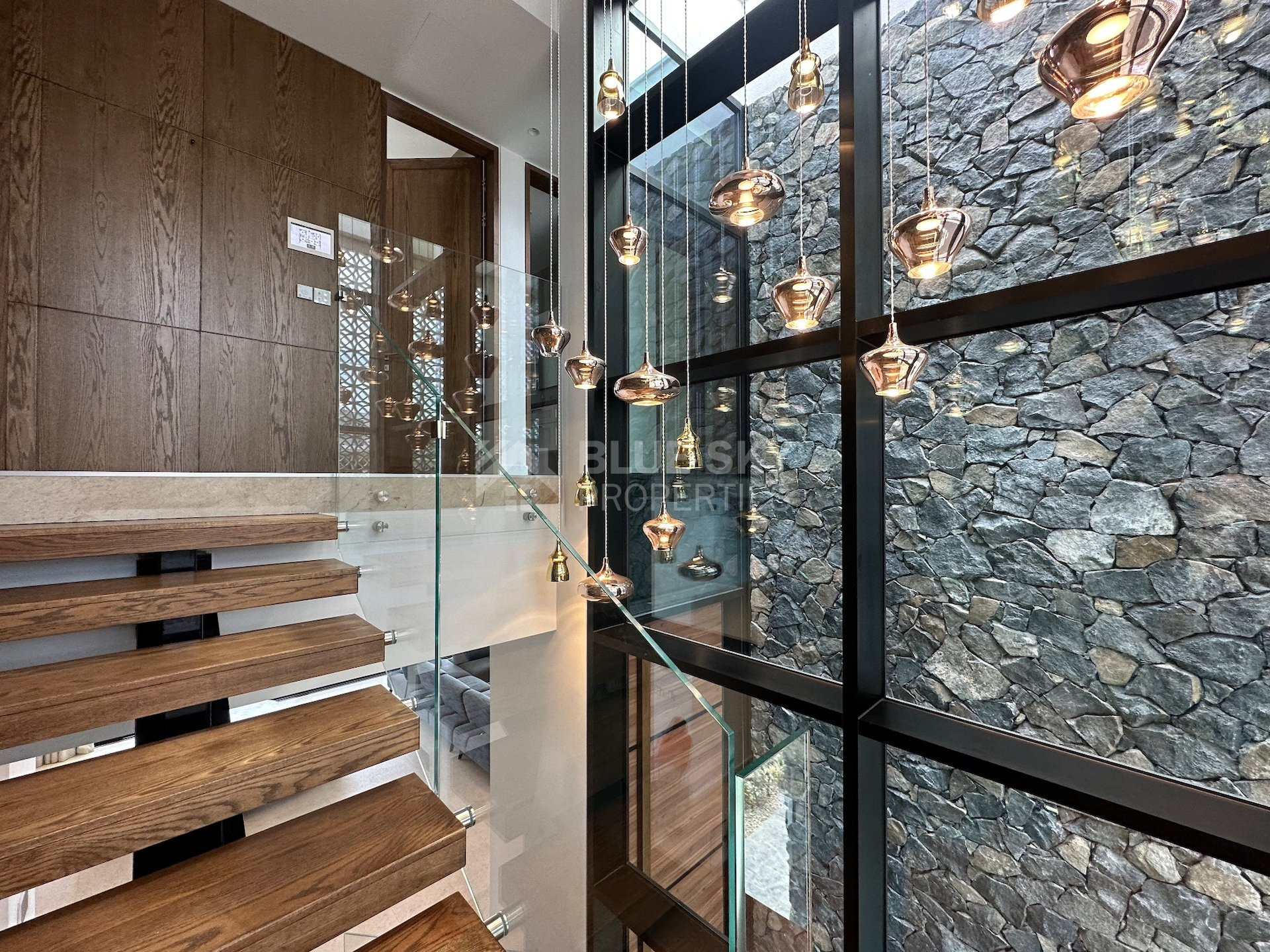 High ceilings and solid wood doors lend a sense of grandeur throughout the home, while patio doors on all sides lead to the magnificent outdoor pool area. The infinity overflow pool with mineral water creates a serene oasis, and the built-in bar and BBQ area are perfect for alfresco entertaining.