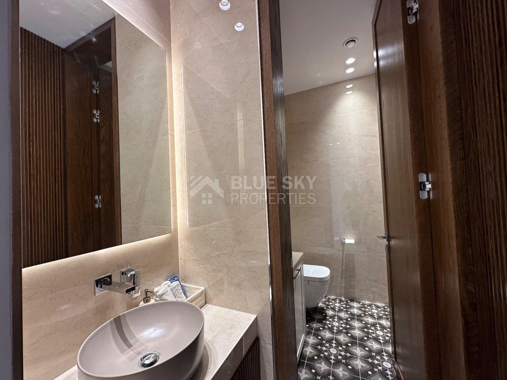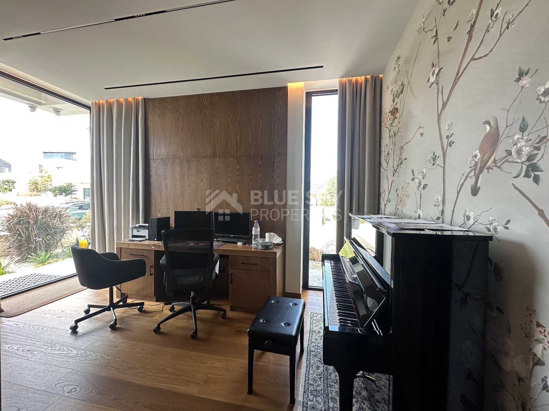 As you enter the home, you're greeted by a grand entrance featuring a striking staircase. The ground floor boasts a spacious open-plan living area, including a fully equipped Scavolini kitchen, with an adjacent utility/secondary kitchen for added convenience. Two elegant lounge areas, a separate dining room, and a private office provide ample space for both relaxation and work. A guest WC completes the ground level.
