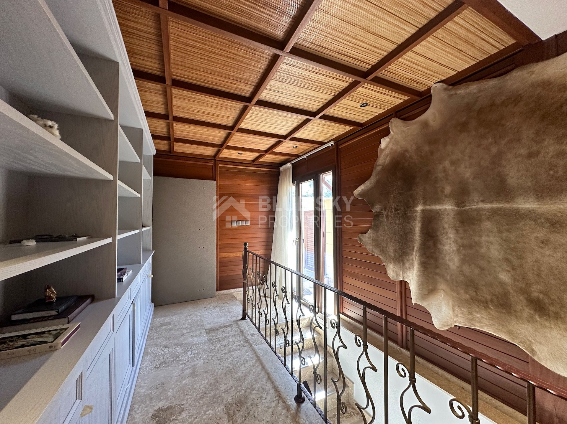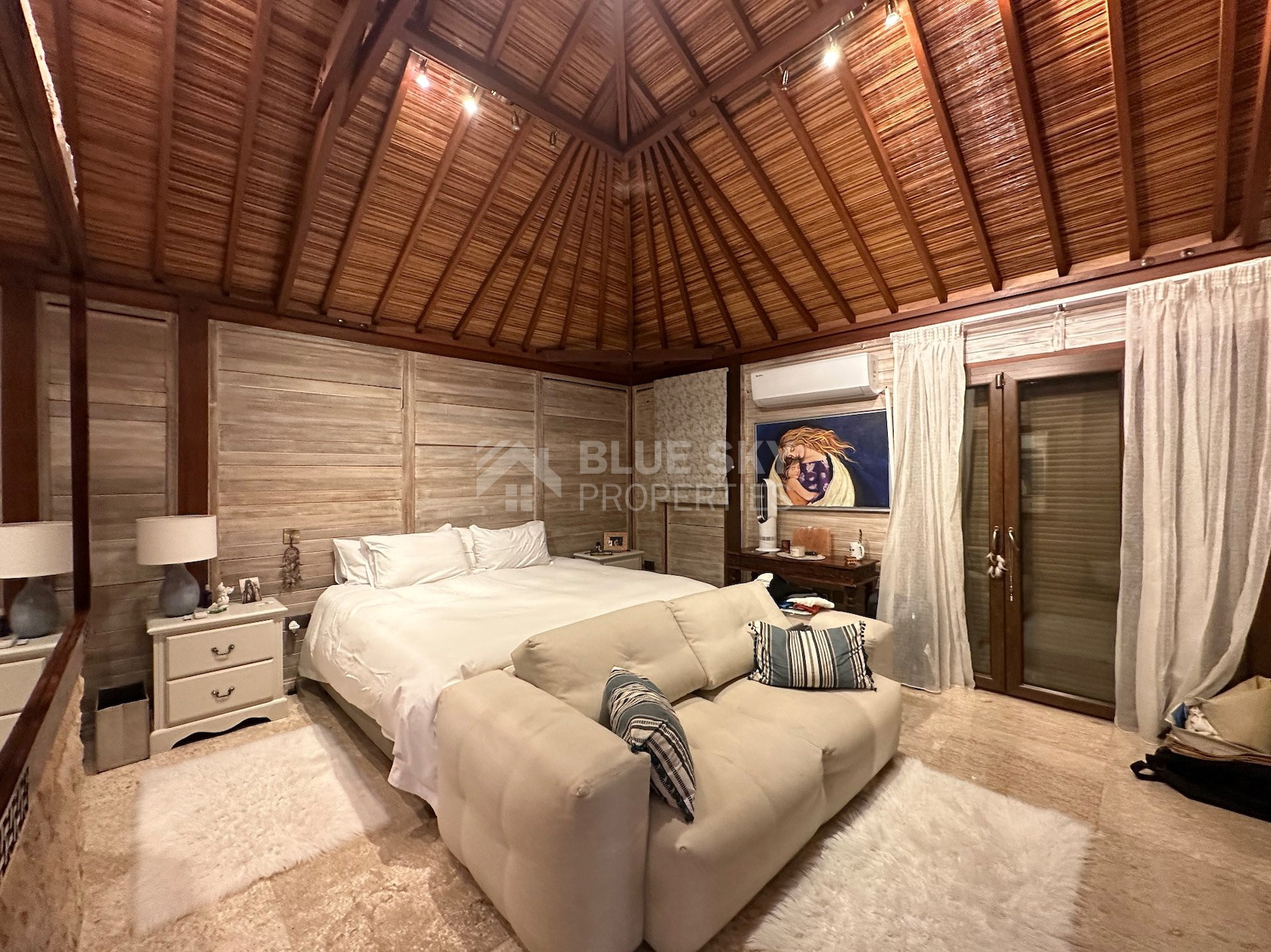 Upstairs, the luxurious master suite boasts access to both north- and south-facing terraces, expansive walk-in wardrobes, and a large en suite bathroom. Unique design elements such as feature ceilings inspired by Thai architecture add a touch of exotic elegance.