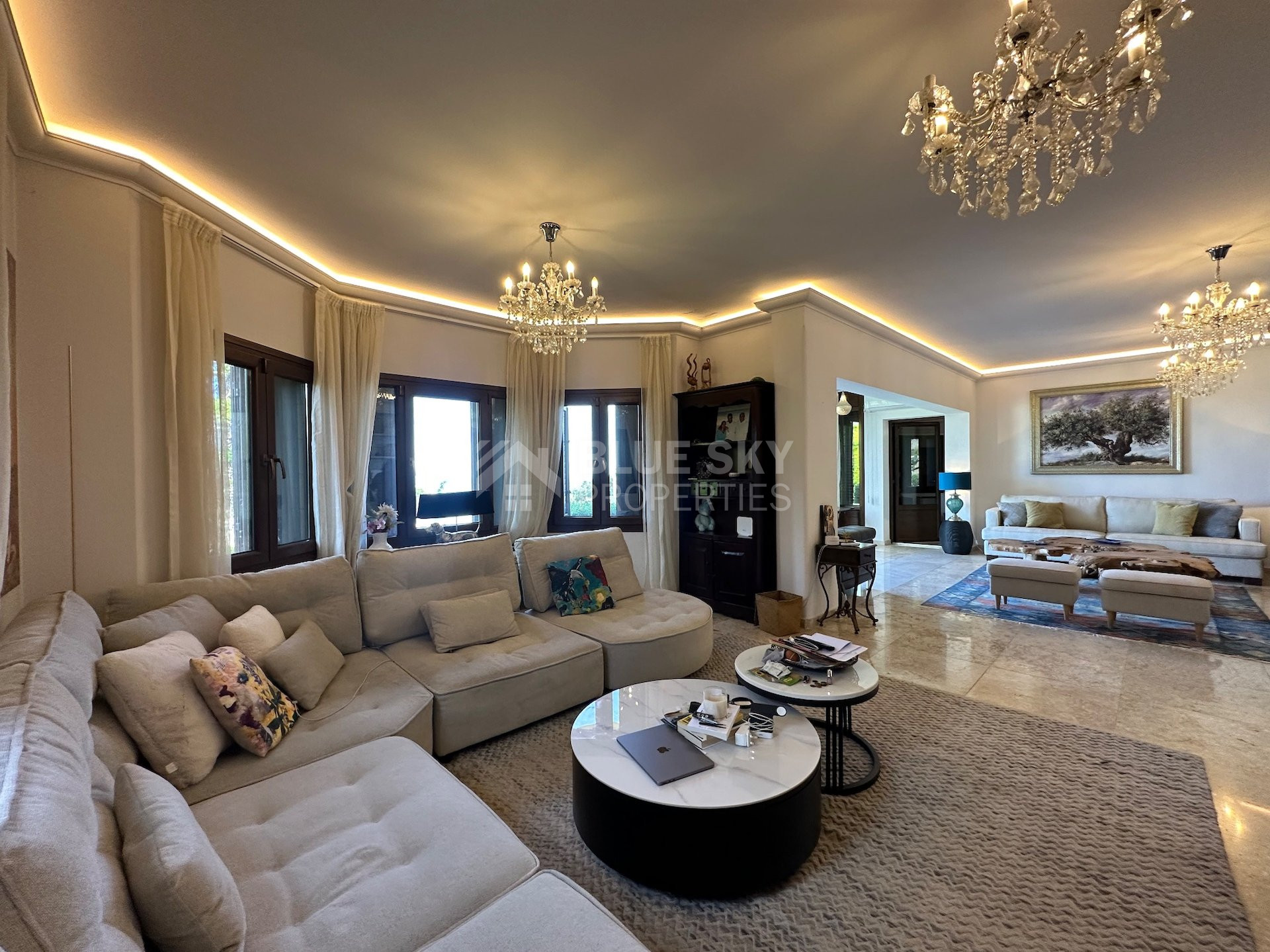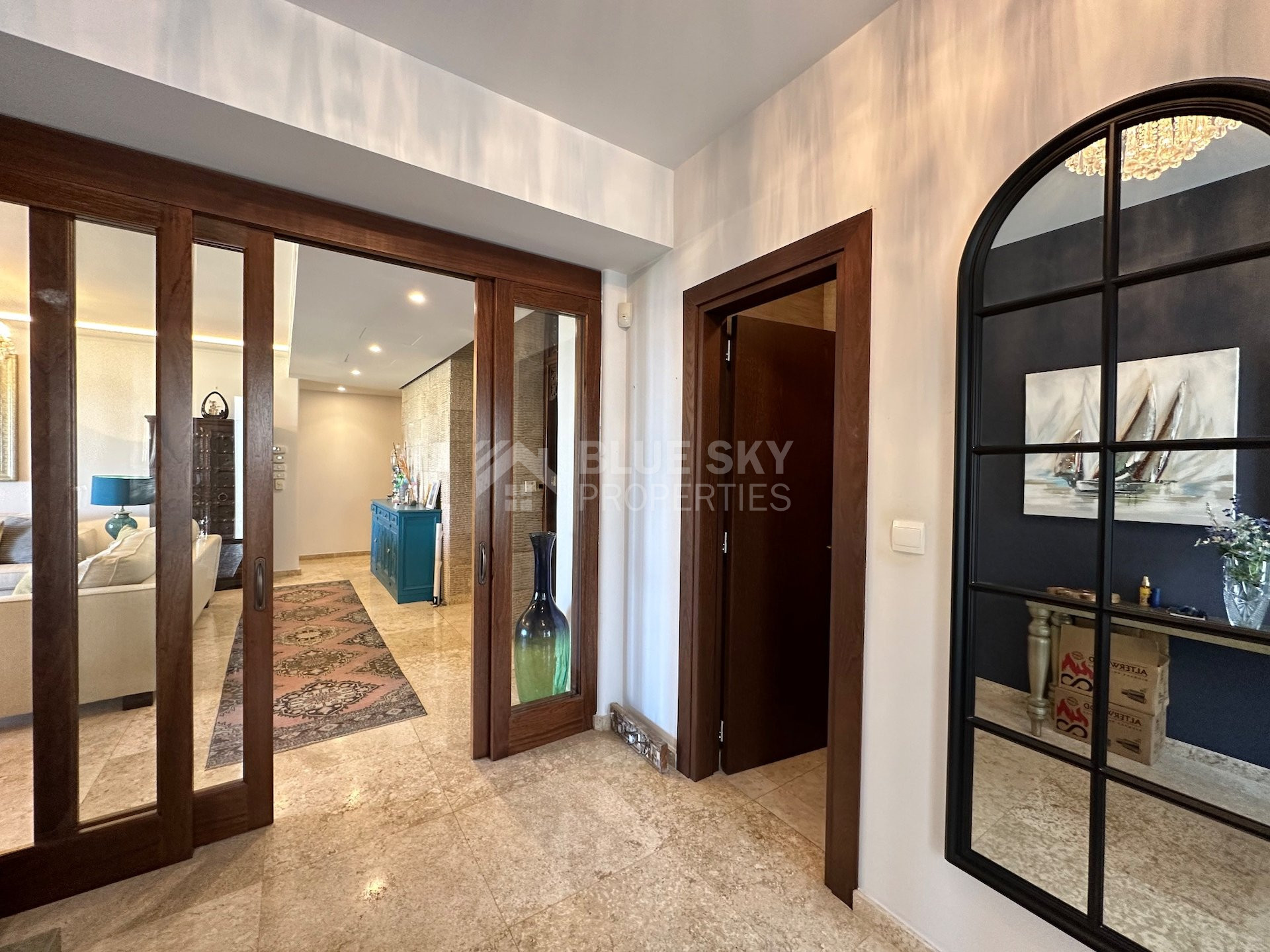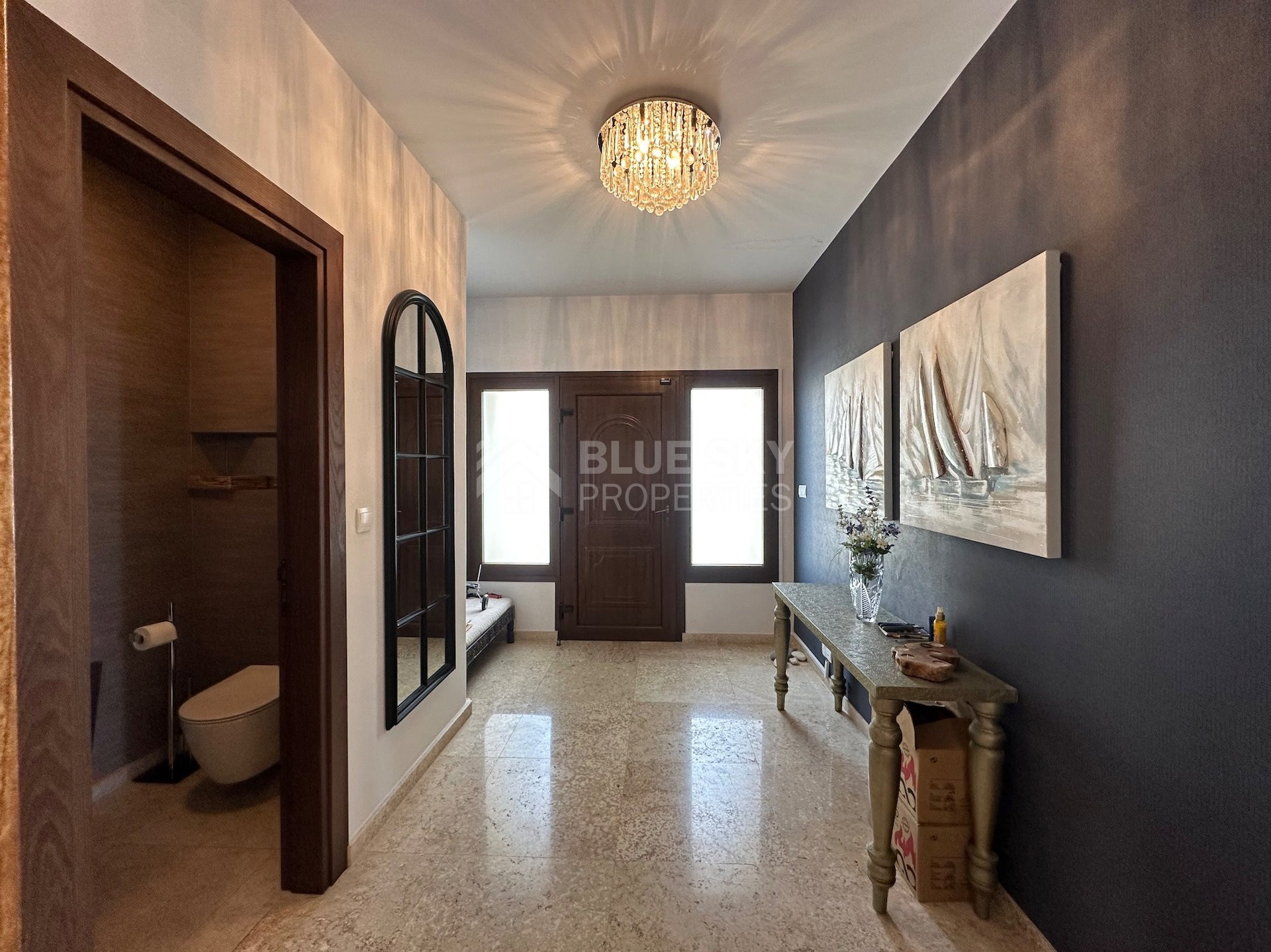Set on a generous 1,351sqm plot in the prestigious area of Agios Tychonas, this delightful villa offers stunning panoramic sea views and exceptional potential. Designed with both comfort and functionality in mind, the home features an inviting entrance hall, a spacious living and dining area with direct access to the rear garden, a cozy TV room, and a fully-equipped separate kitchen with breakfast/dining space. Additional ground floor amenities include a laundry room, guest WC, a private office, and three bedrooms—all with en suite facilities, ideal for family living or guest accommodation.