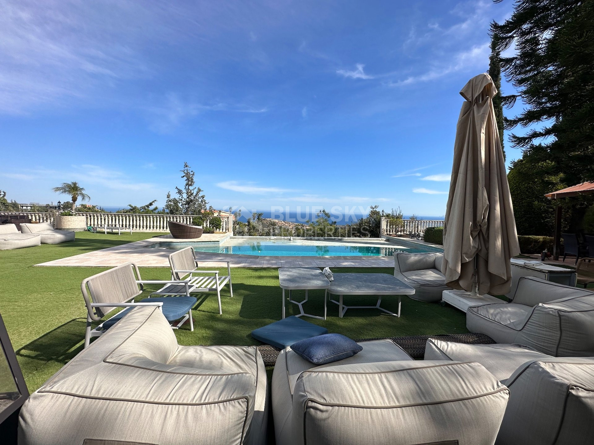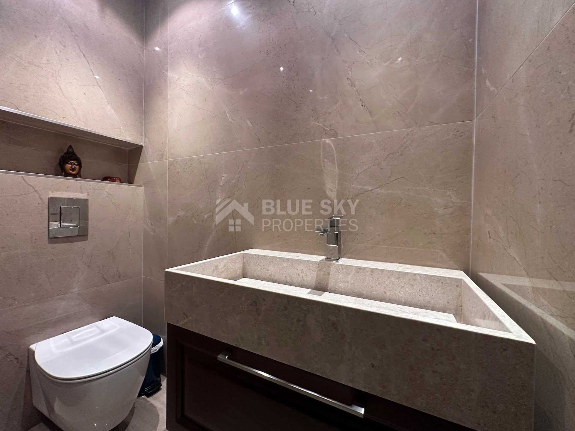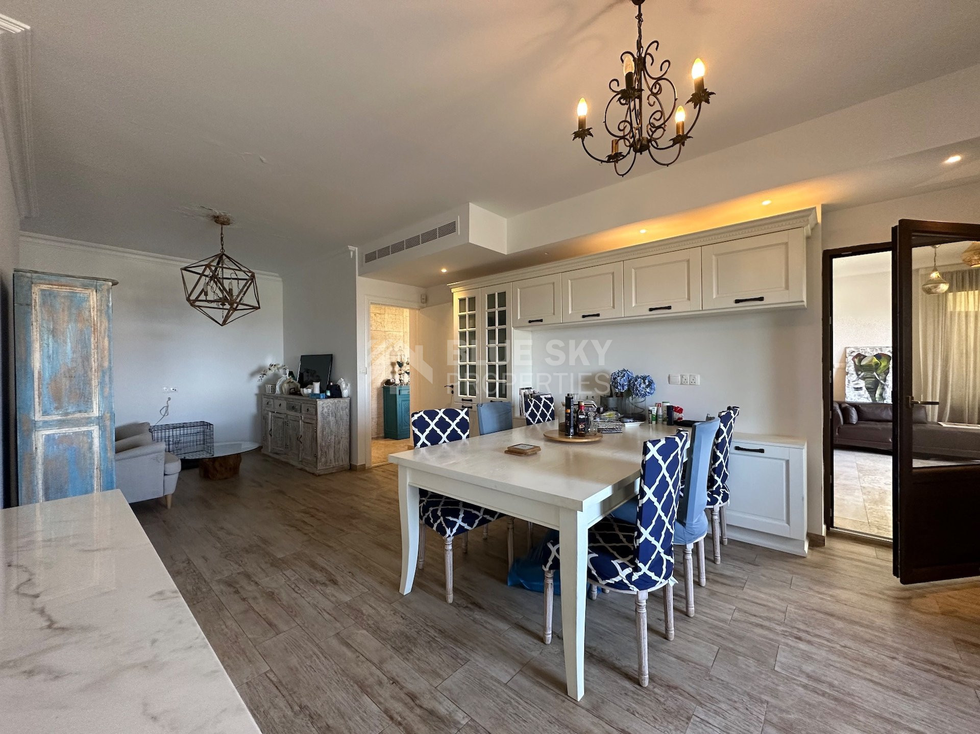 Set on a generous 1,351sqm plot in the prestigious area of Agios Tychonas, this delightful villa offers stunning panoramic sea views and exceptional potential. Designed with both comfort and functionality in mind, the home features an inviting entrance hall, a spacious living and dining area with direct access to the rear garden, a cozy TV room, and a fully-equipped separate kitchen with breakfast/dining space. Additional ground floor amenities include a laundry room, guest WC, a private office, and three bedrooms—all with en suite facilities, ideal for family living or guest accommodation.