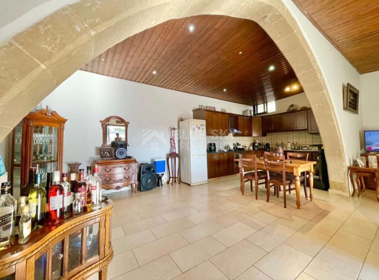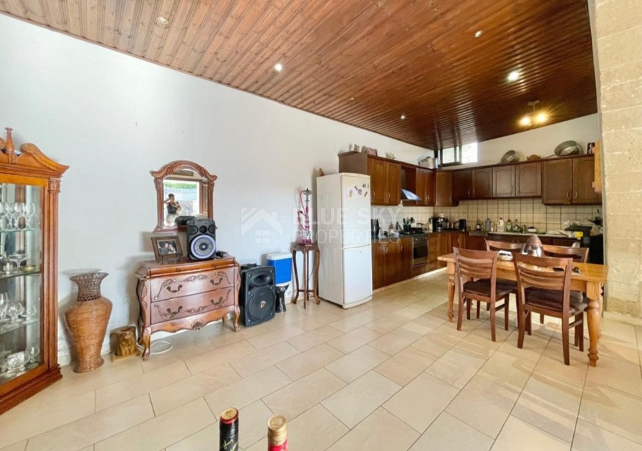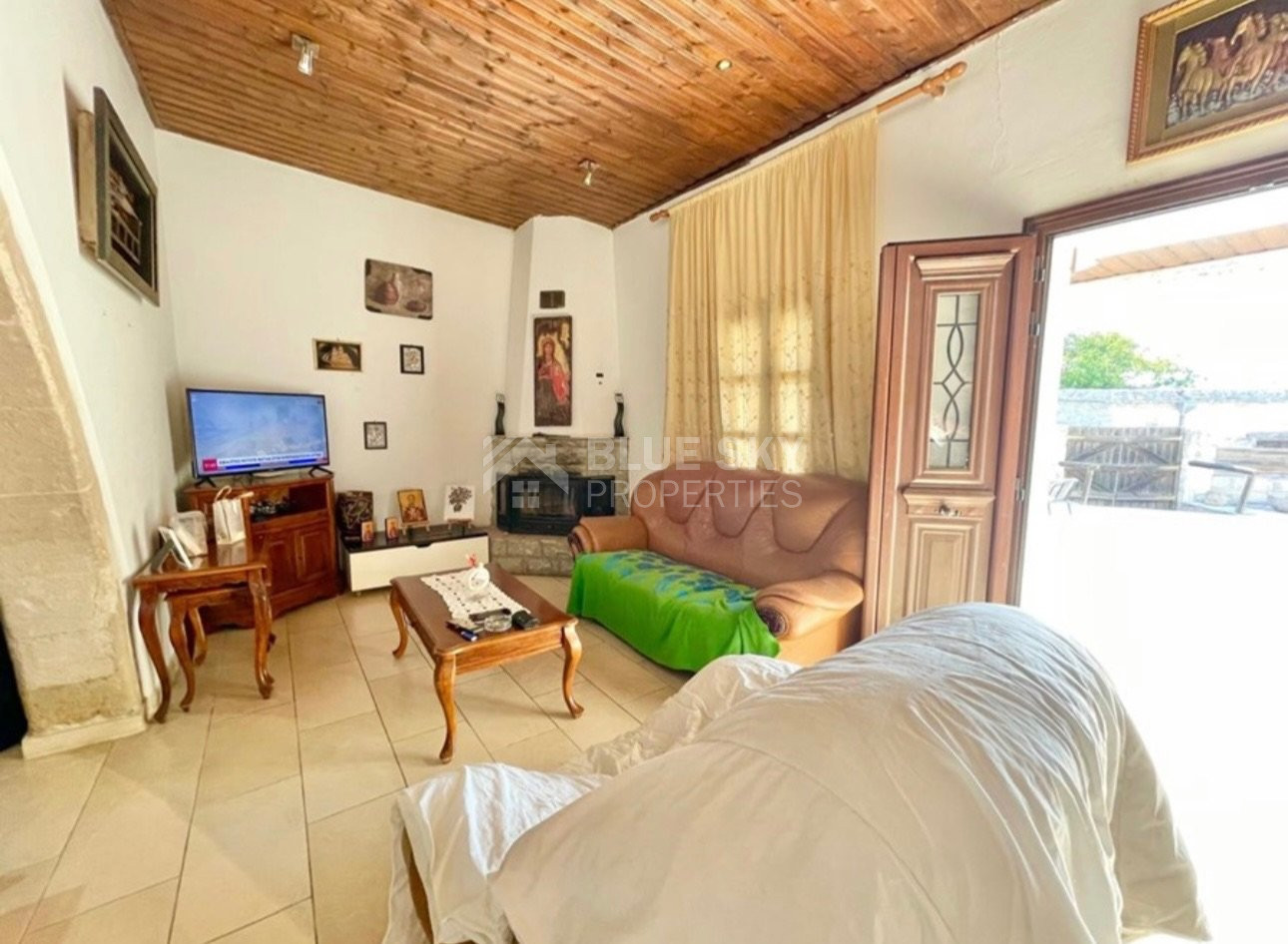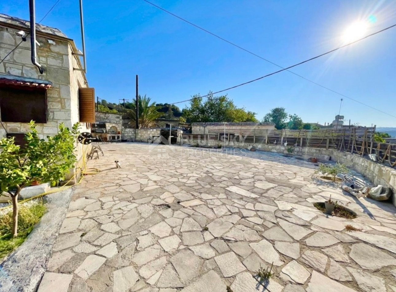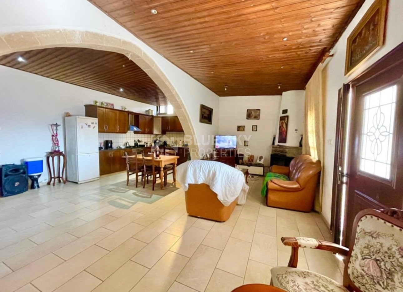 Set on a generous plot, the home features a spacious courtyard with a traditional outdoor oven—perfect for al fresco living. Inside, a cozy living area with fireplace, a stone archway, and wooden ceilings create a welcoming ambiance. The kitchen is functional and traditionally Cypriot, ideal for home-cooked meals.