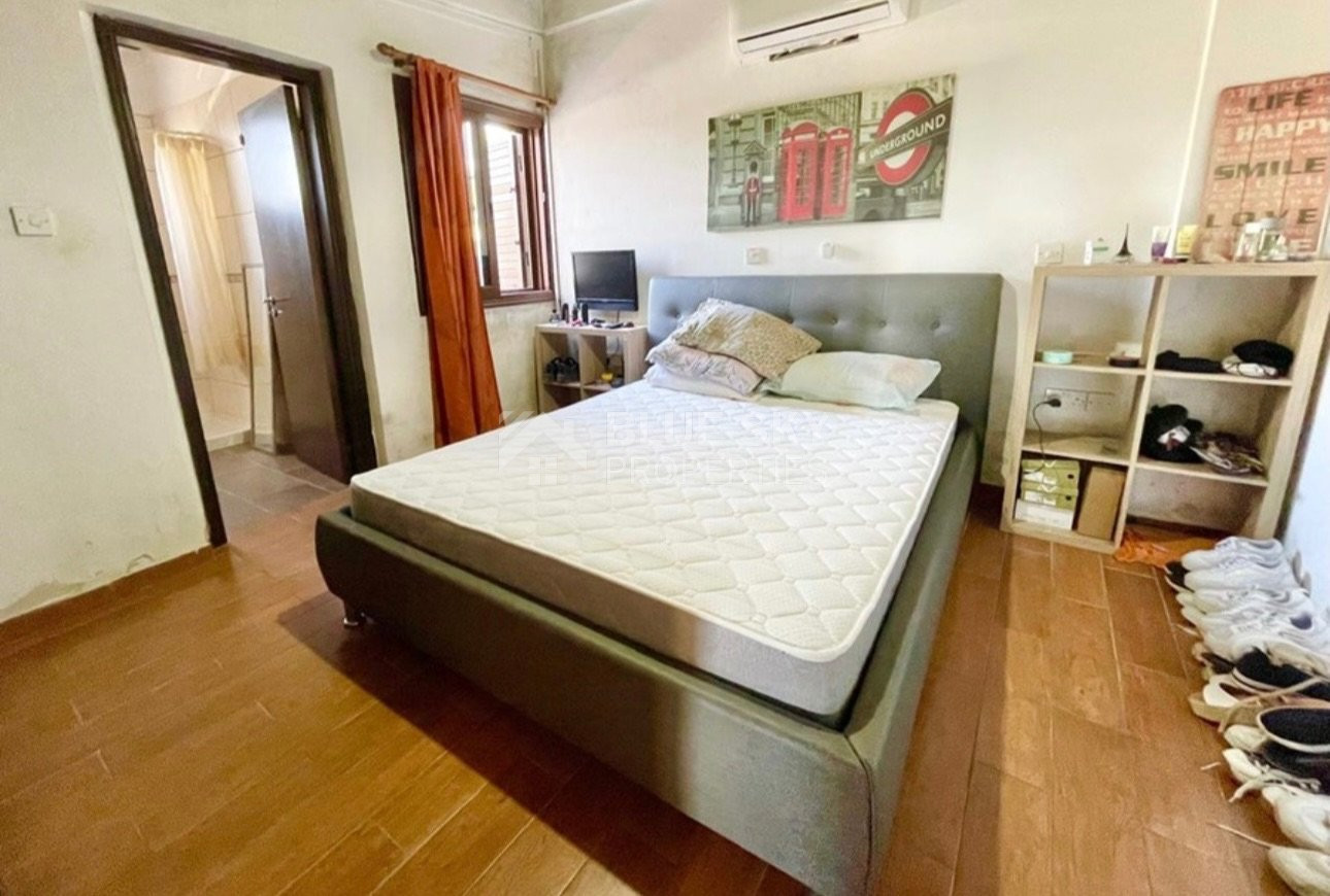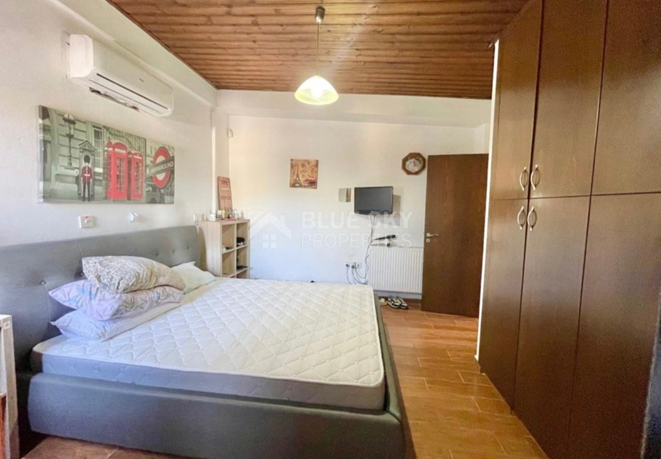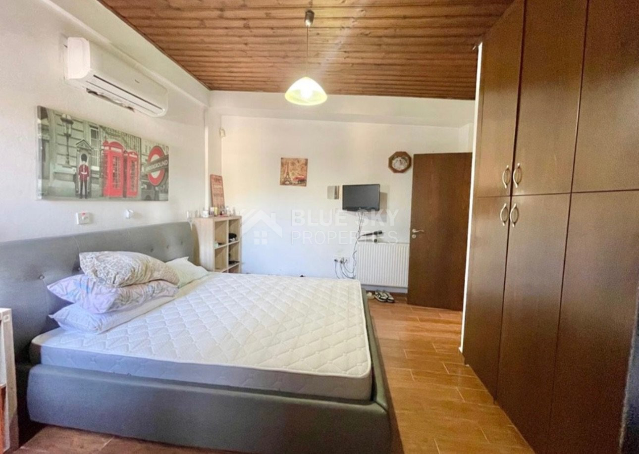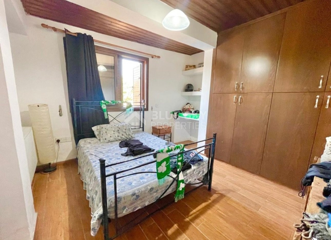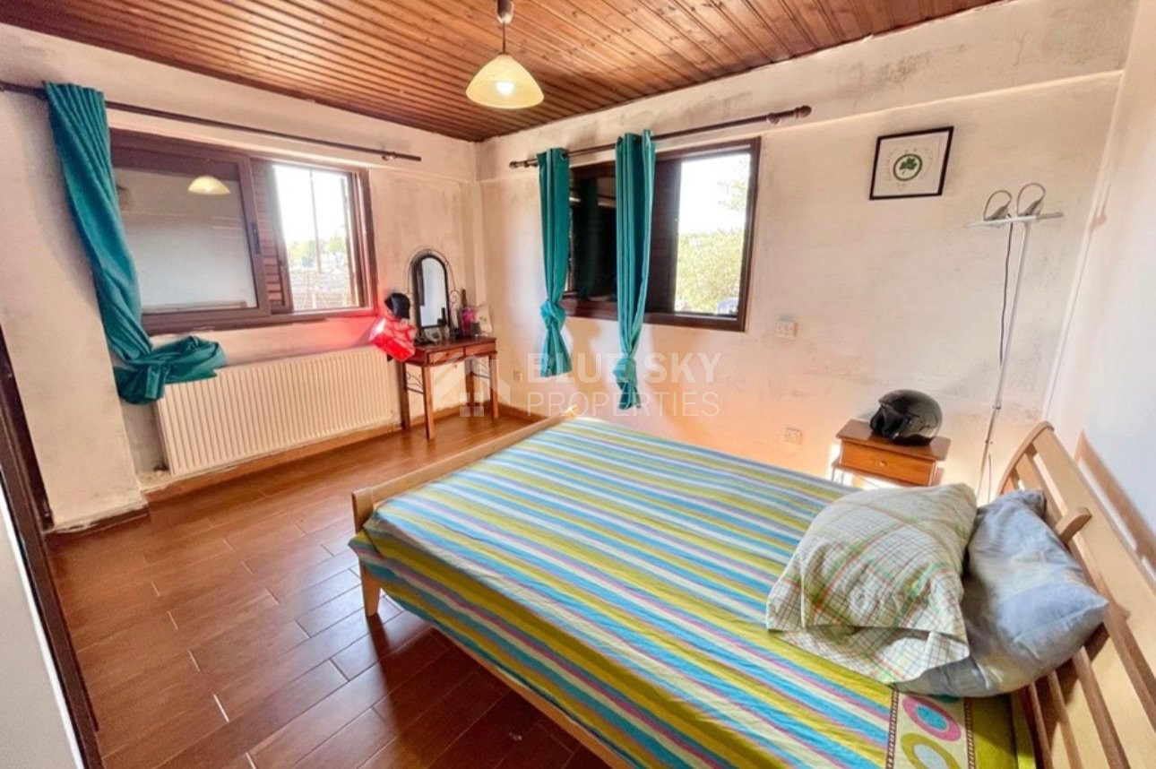 Set on a generous plot, the home features a spacious courtyard with a traditional outdoor oven—perfect for al fresco living. Inside, a cozy living area with fireplace, a stone archway, and wooden ceilings create a welcoming ambiance. The kitchen is functional and traditionally Cypriot, ideal for home-cooked meals.