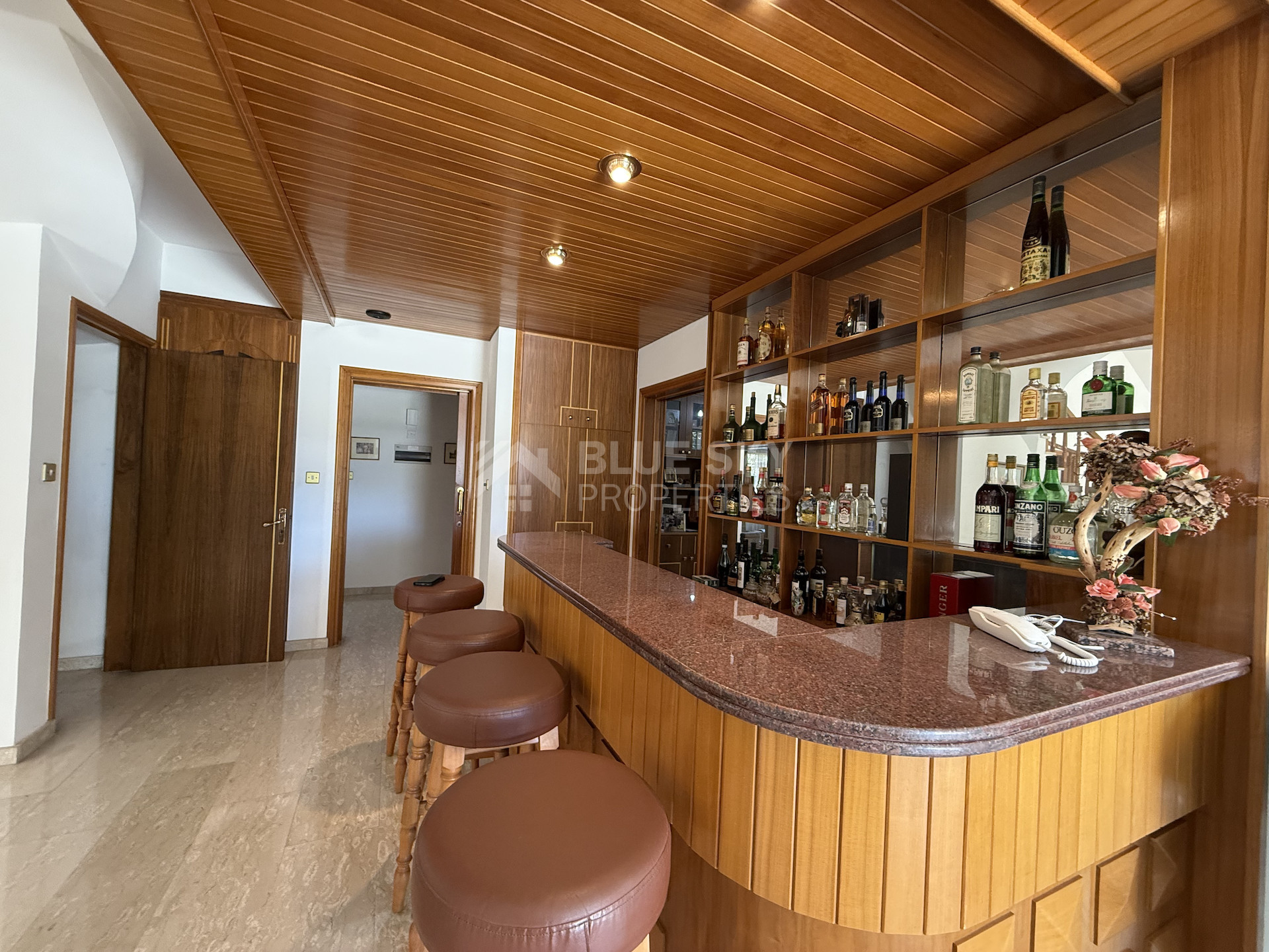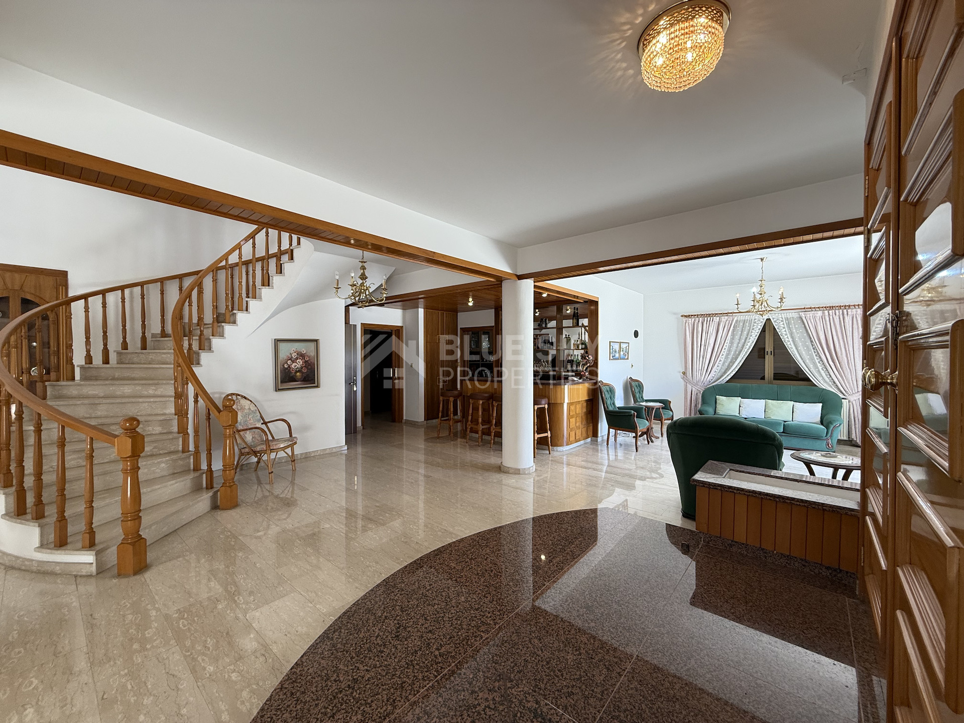Step into a grand entrance hall with soaring high ceilings and a feature staircase that immediately sets the tone of spacious sophistication. The ground floor boasts a versatile room that can serve as a guest bedroom or private library, alongside a stylish bar area, perfect for entertaining.