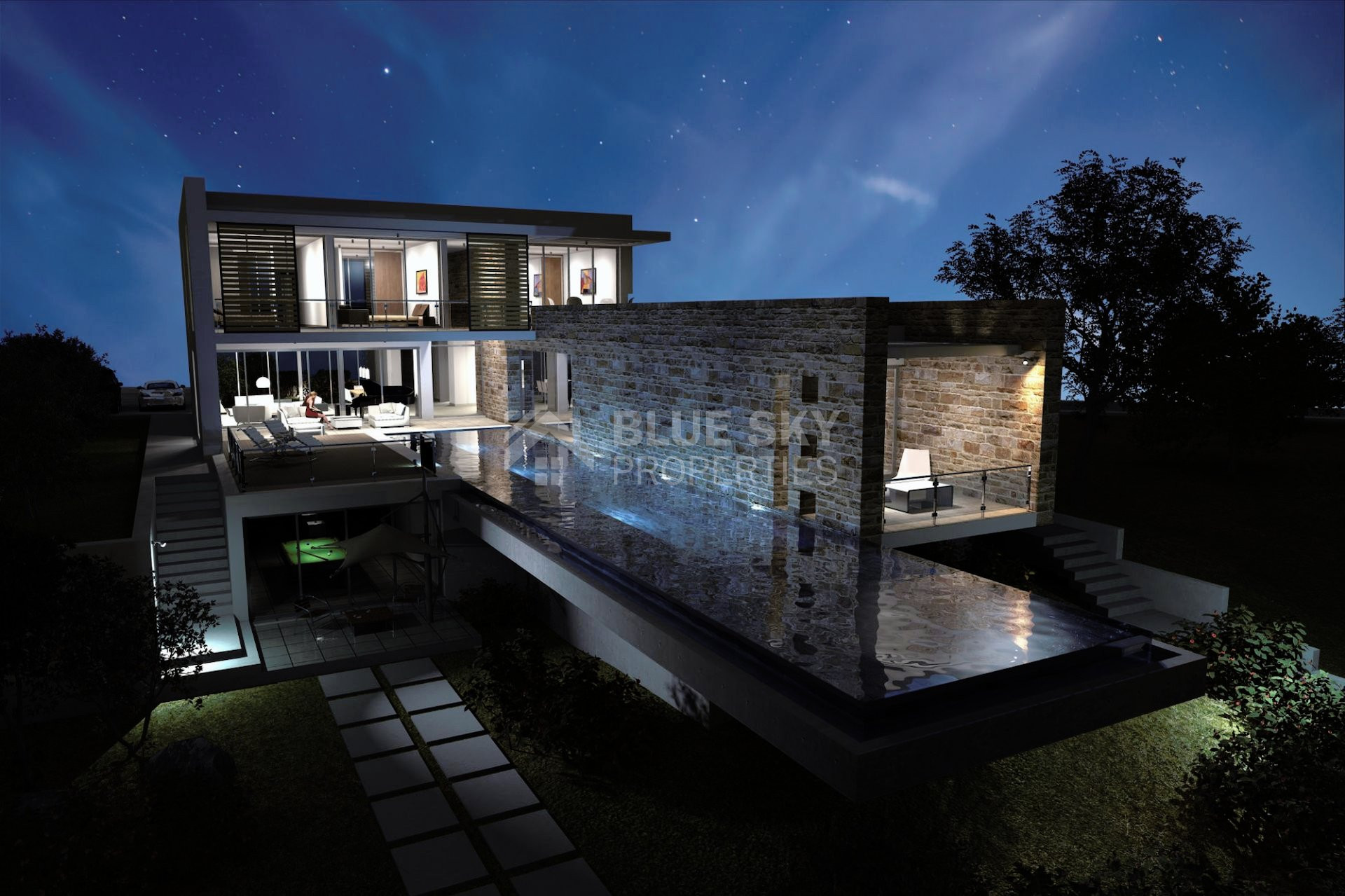 This stunning four-bedroom villa is located in the beautiful area of Konia and boasts incredible, uninterrupted views of the sea. The villa's design exemplifies luxurious living, built to the highest standards with meticulous attention to detail. Its minimalist architectural style exudes refined elegance, complemented by lush greenery, clear waters, and a glistening cityscape in the background.