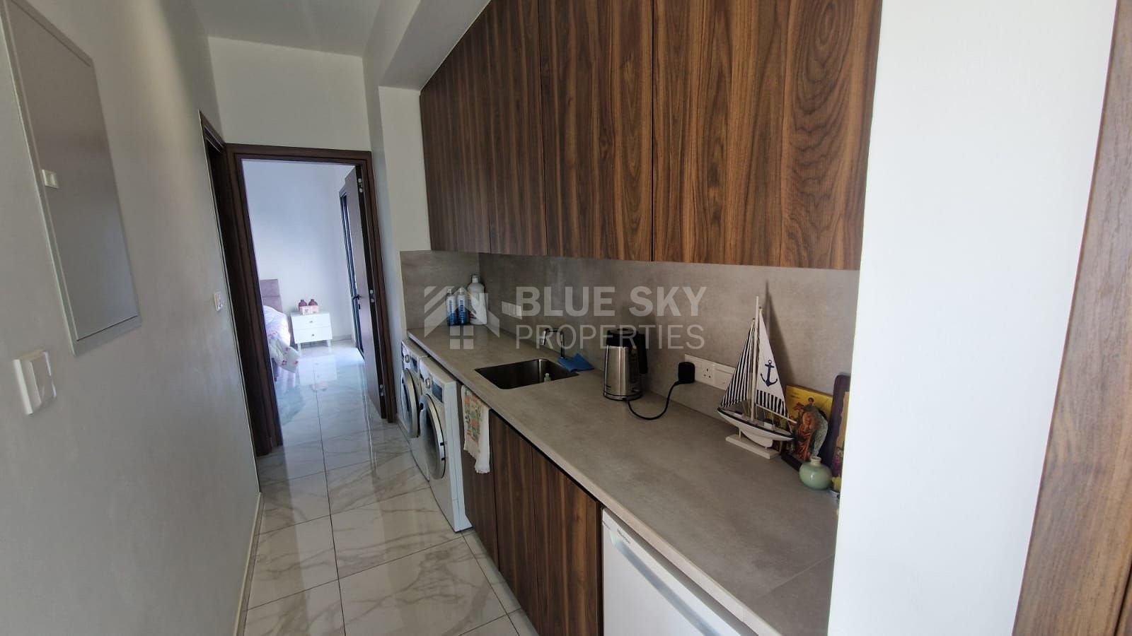 On the second floor, you’ll find another kitchenette in the corridor, a family bathroom with a bathtub, and three bedrooms. The master bedroom includes an ensuite shower and shares a large balcony with the guestroom, while a smaller balcony faces the front.