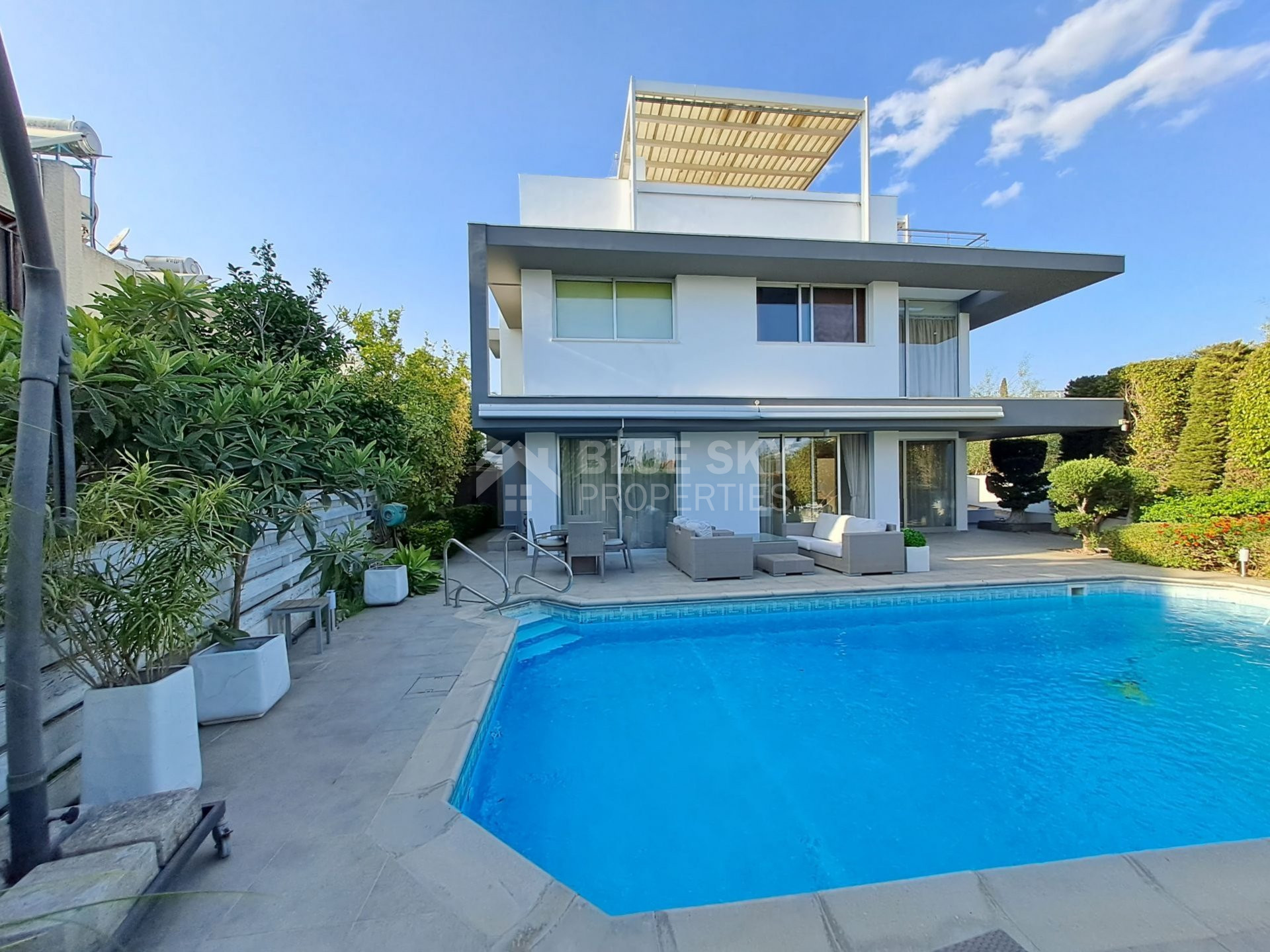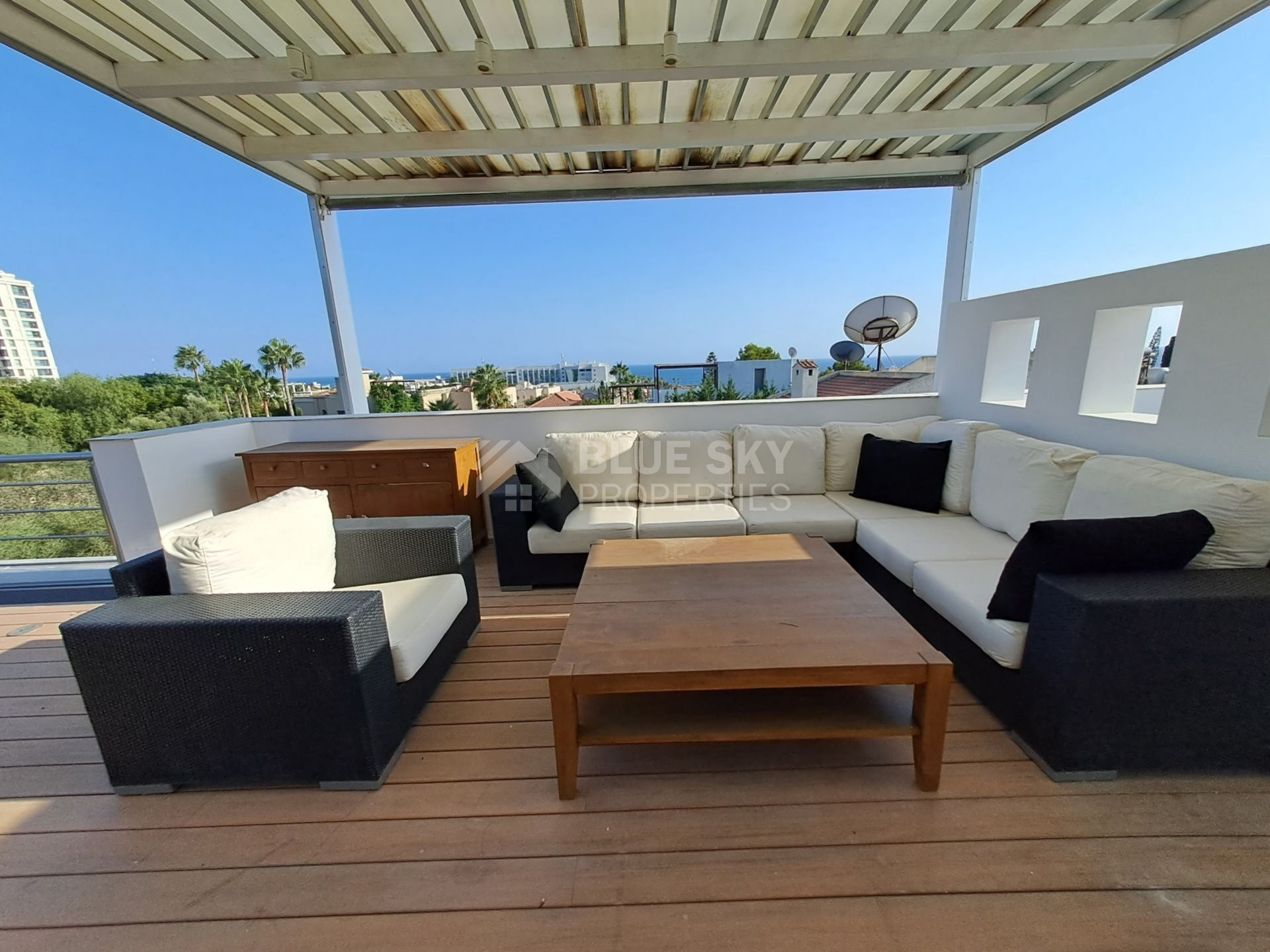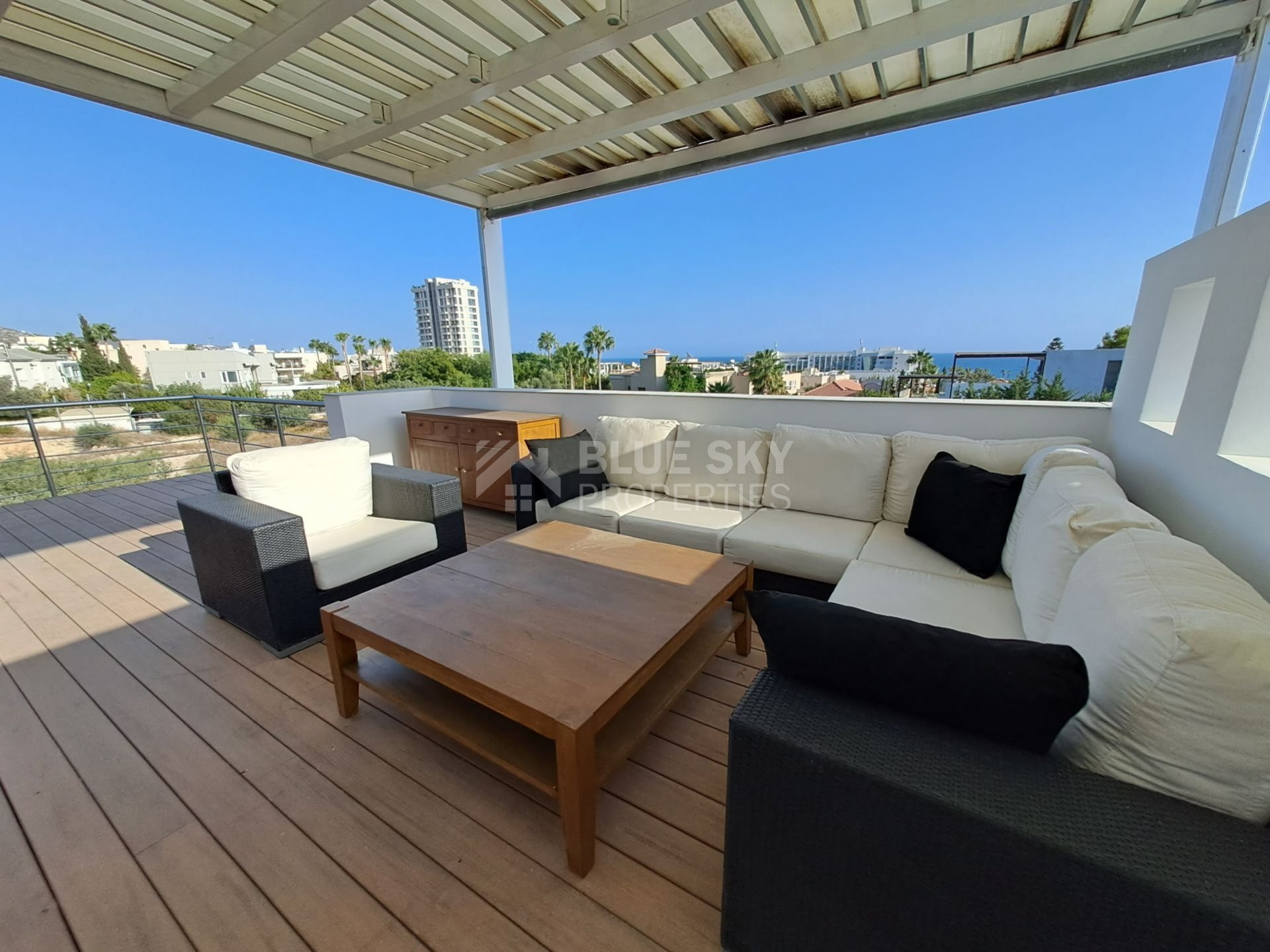 An exceptional four bedroom property located on the seafront of Limassol. This charming residence boasts beautiful sea views from the Roof Garden, a private swimming pool and mature garden. The house has a lovely inside open plan area with guest WC and access to the outdoor terrace with pool. The first level has three spacious bedrooms, the master has en-suite shower and a family bathroom is shared by the second and third bedrooms. The basement area has a cinema room, fourth bedroom with en-suite shower and sauna. A fabulous roof garden enjoys a beautiful outdoor seating area with barbecue and amazing views. Easy access to the seafront road, the highway and just a few metres to the Sea. A truly marvellous seafront property which has to be seen to be fully appreciated. Please call for further information and a viewing.