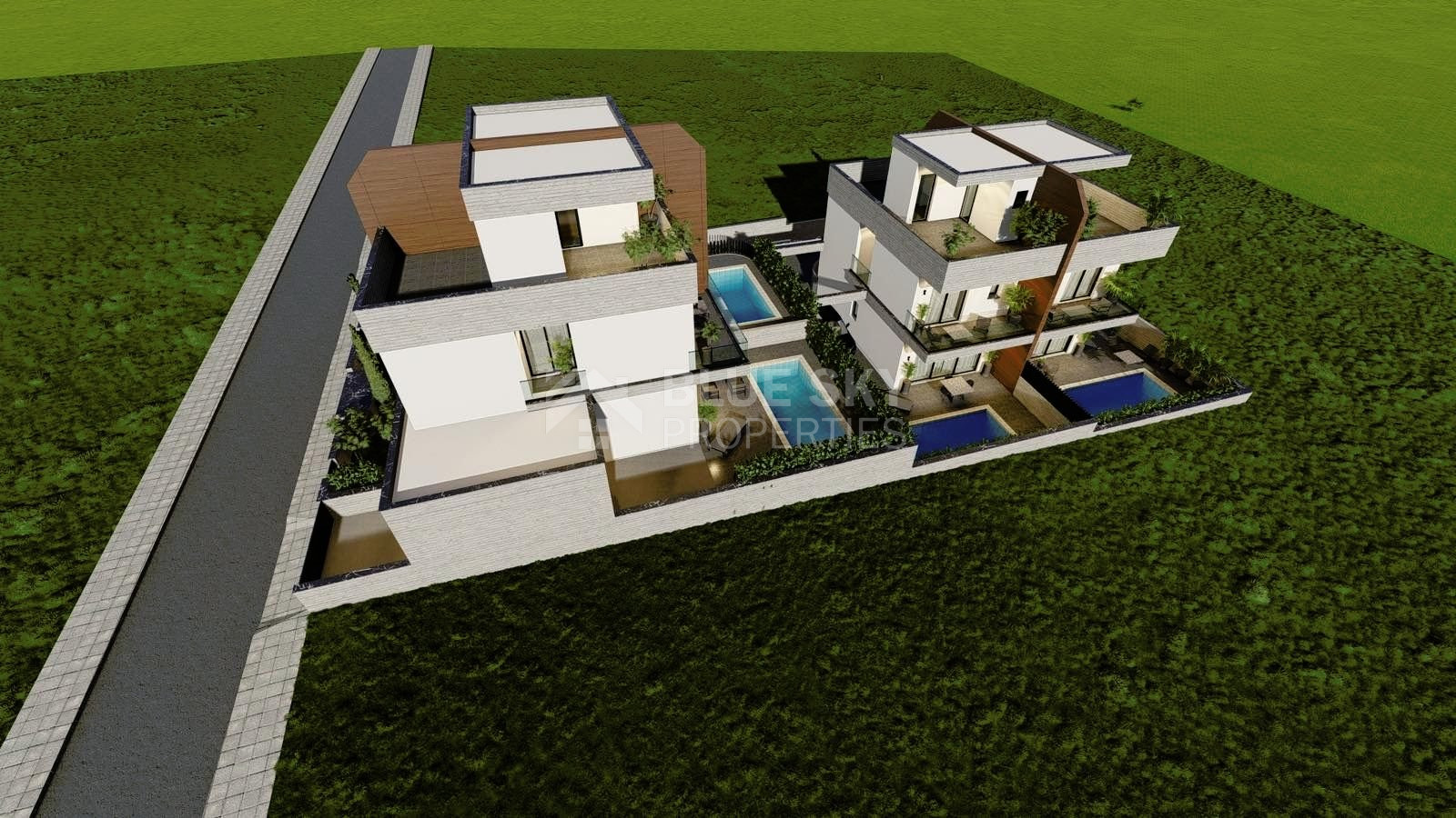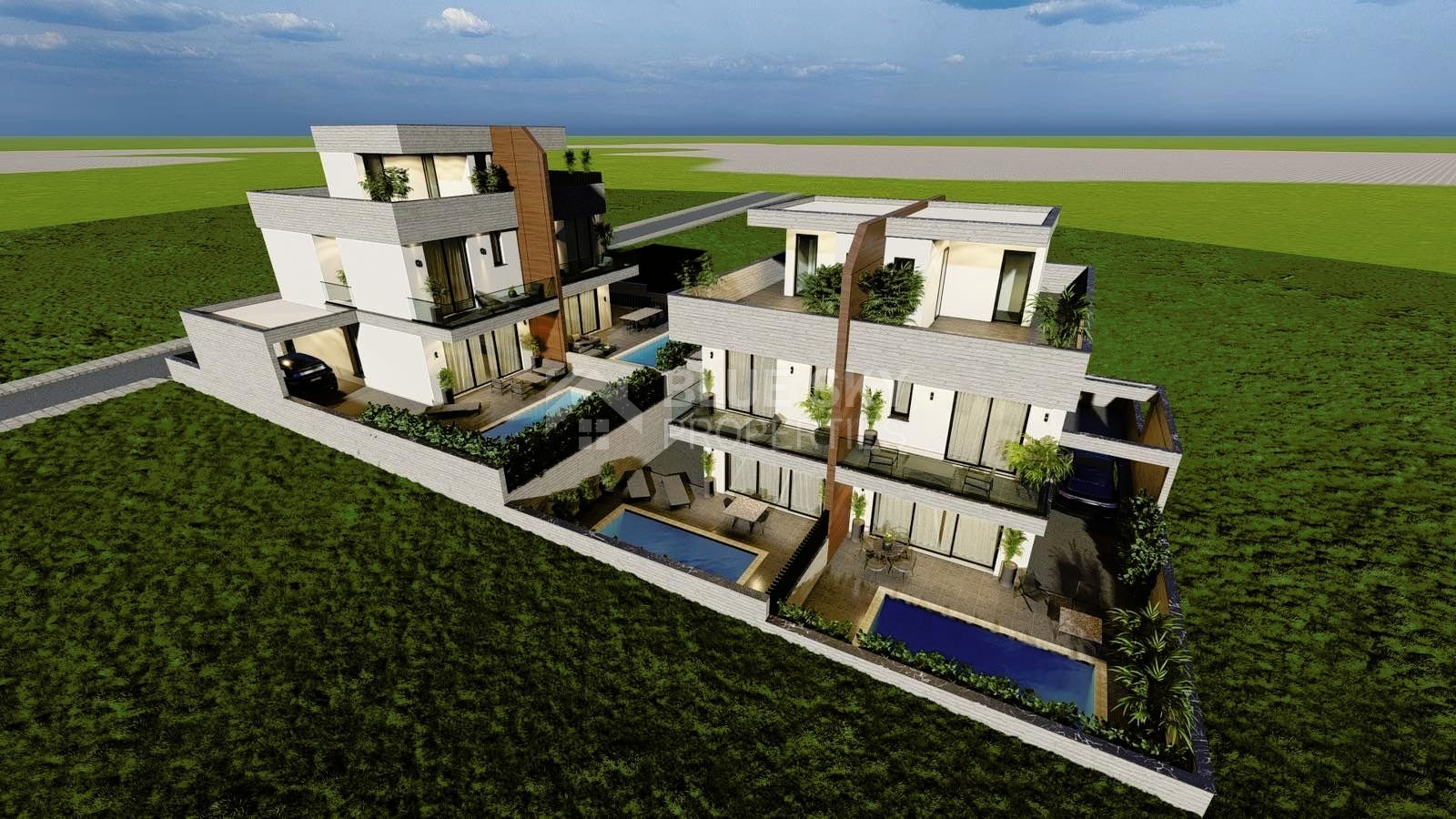 On the first level each house has a nice modern design open plan kitchen with living room and dinning area. Through big sliding windows you have access to the nice back yard which optionally you can have your private swimming pool, barbecue area and the nice garden.