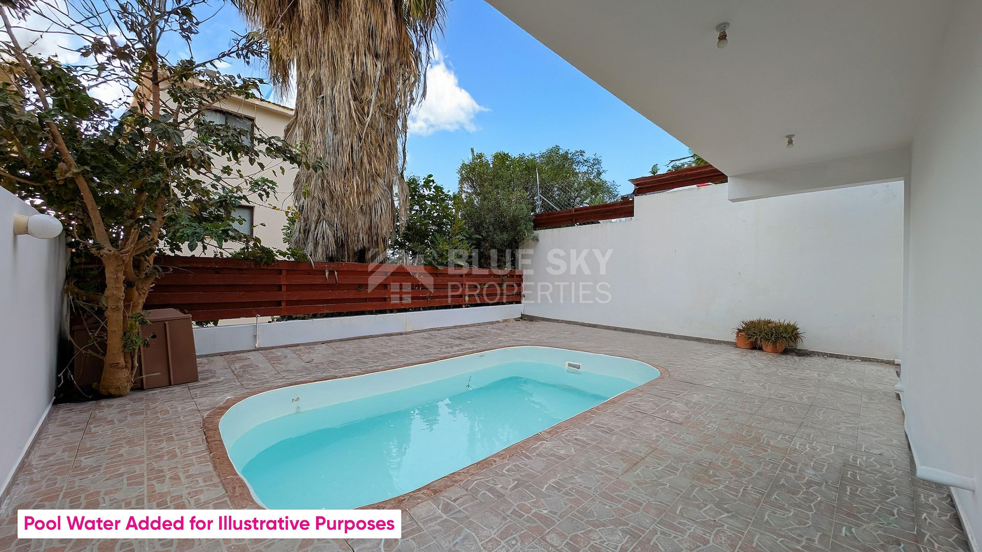 This is a three-bedroom, semi-detached, two-storey house with a private swimming pool, located within a residential complex in Tala, Paphos.